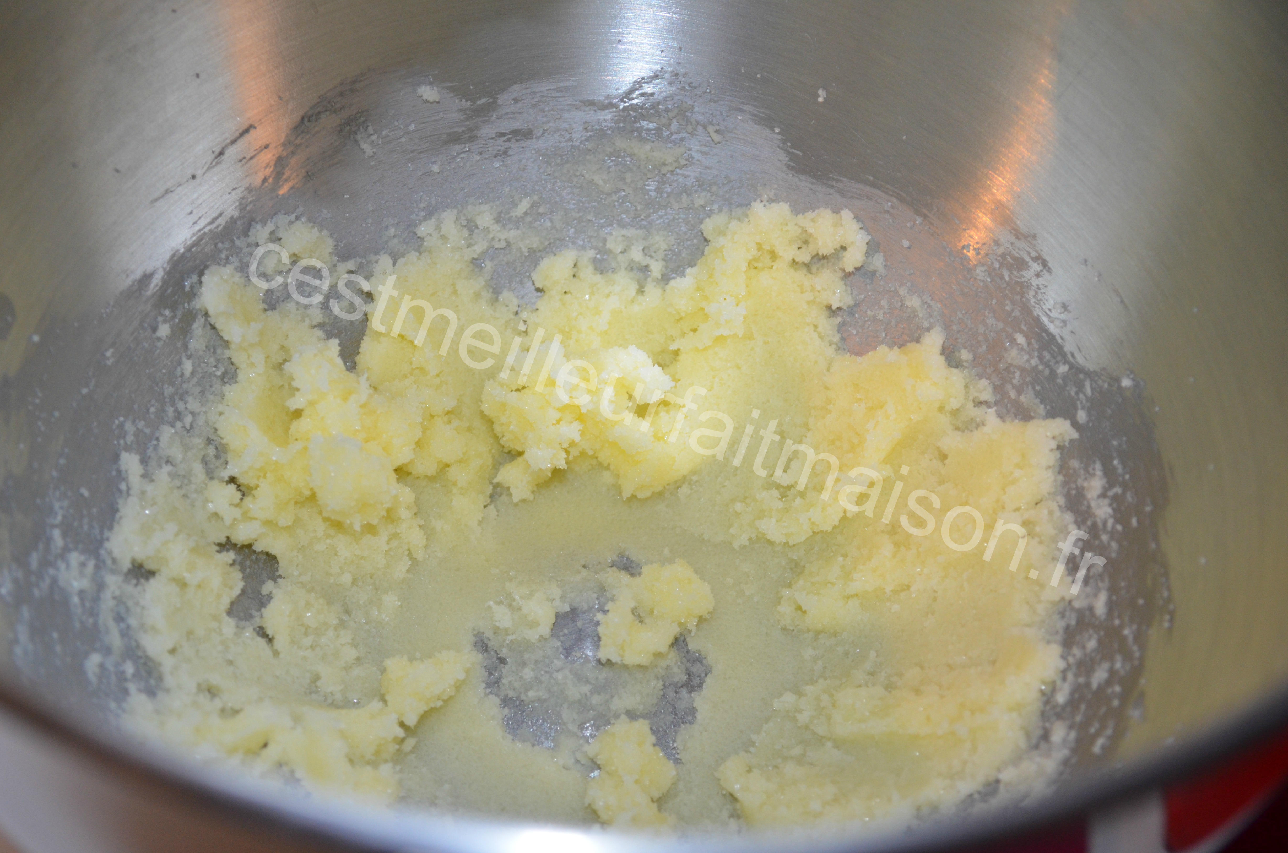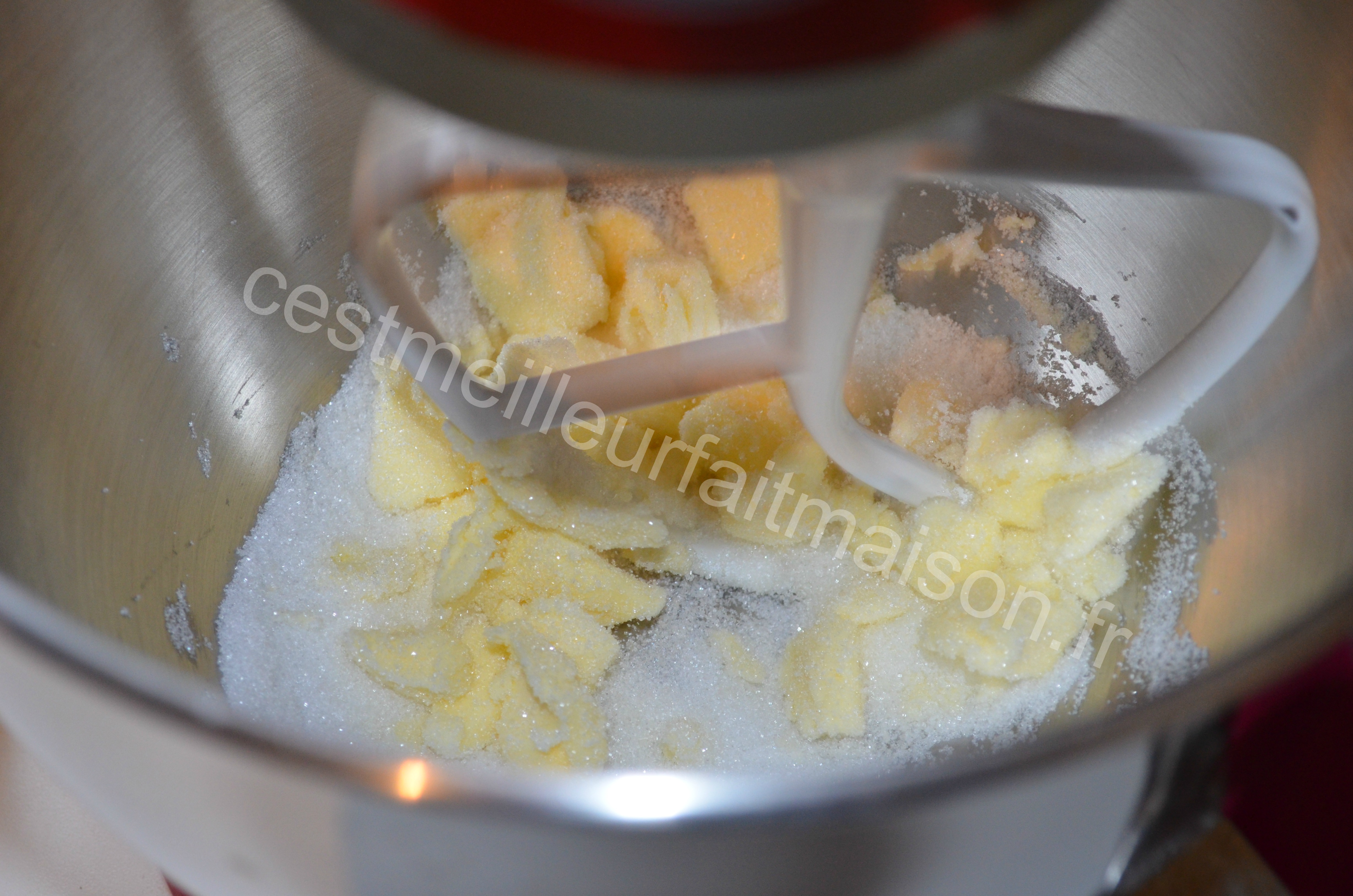 1- Verser le sucre dans le bol d’un robot et battre avec le beurre.