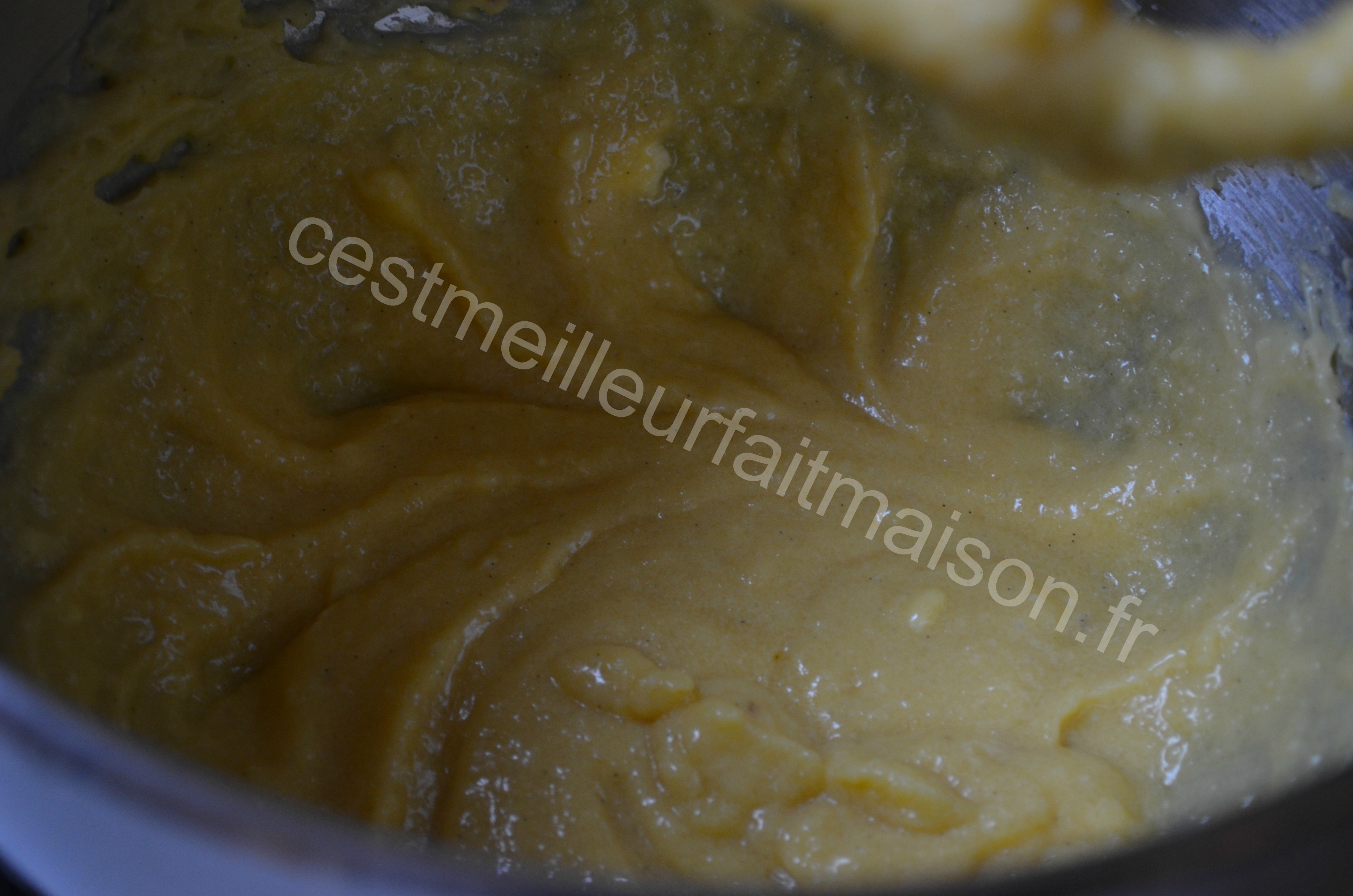 2- Ajouter les oeufs un à un, puis la poudre d’amandes et la crème pâtissière. (J’ai oublié de faire des photo des étapes, vous n’avez que le résultat du mélange.) Ajouter l’extrait d’amande amère et mélanger.
