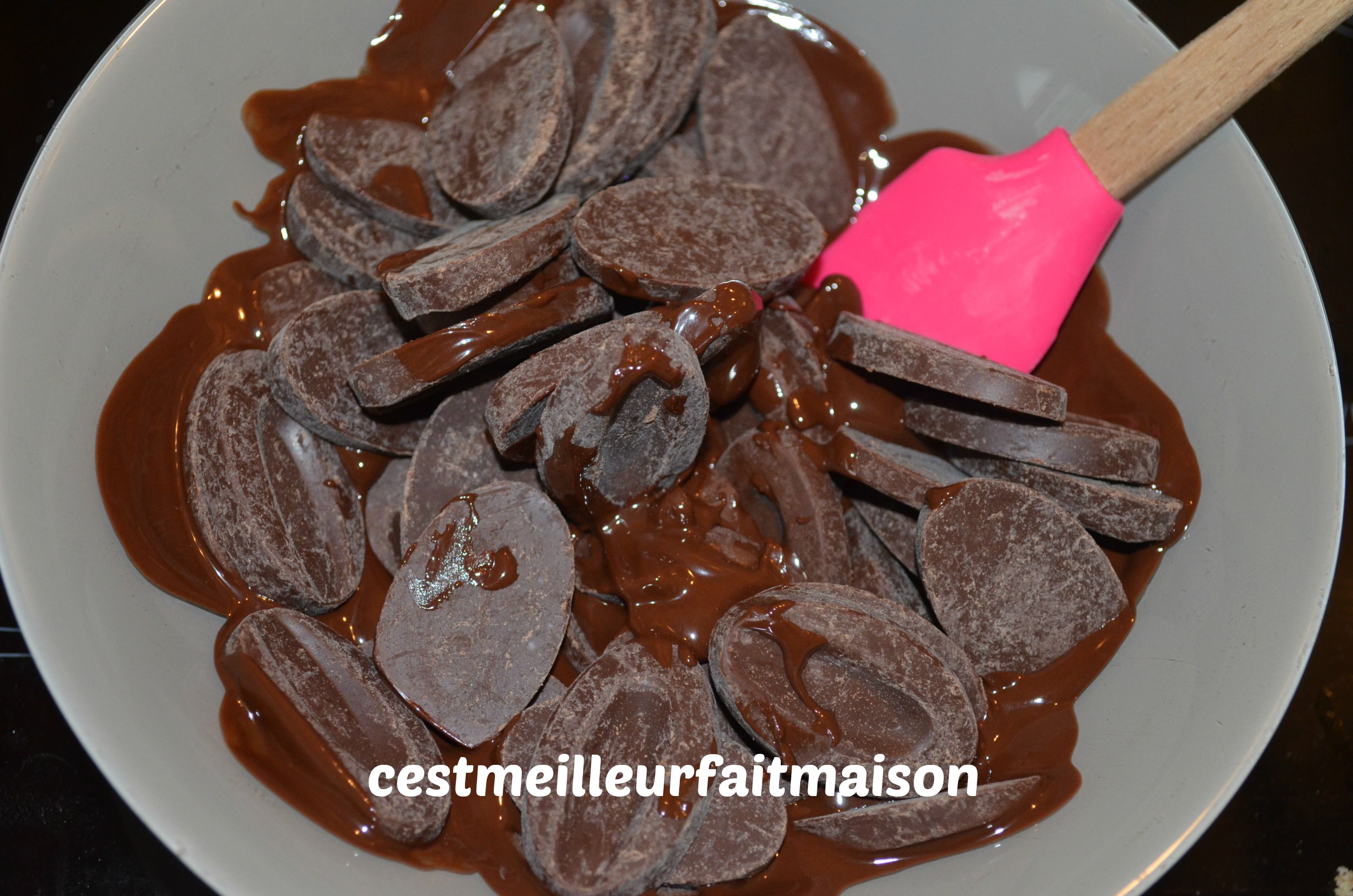 Faire fondre le chocolat 2 x 1 min au micro onde à puissance moyenne. Bien mélanger et réserver.