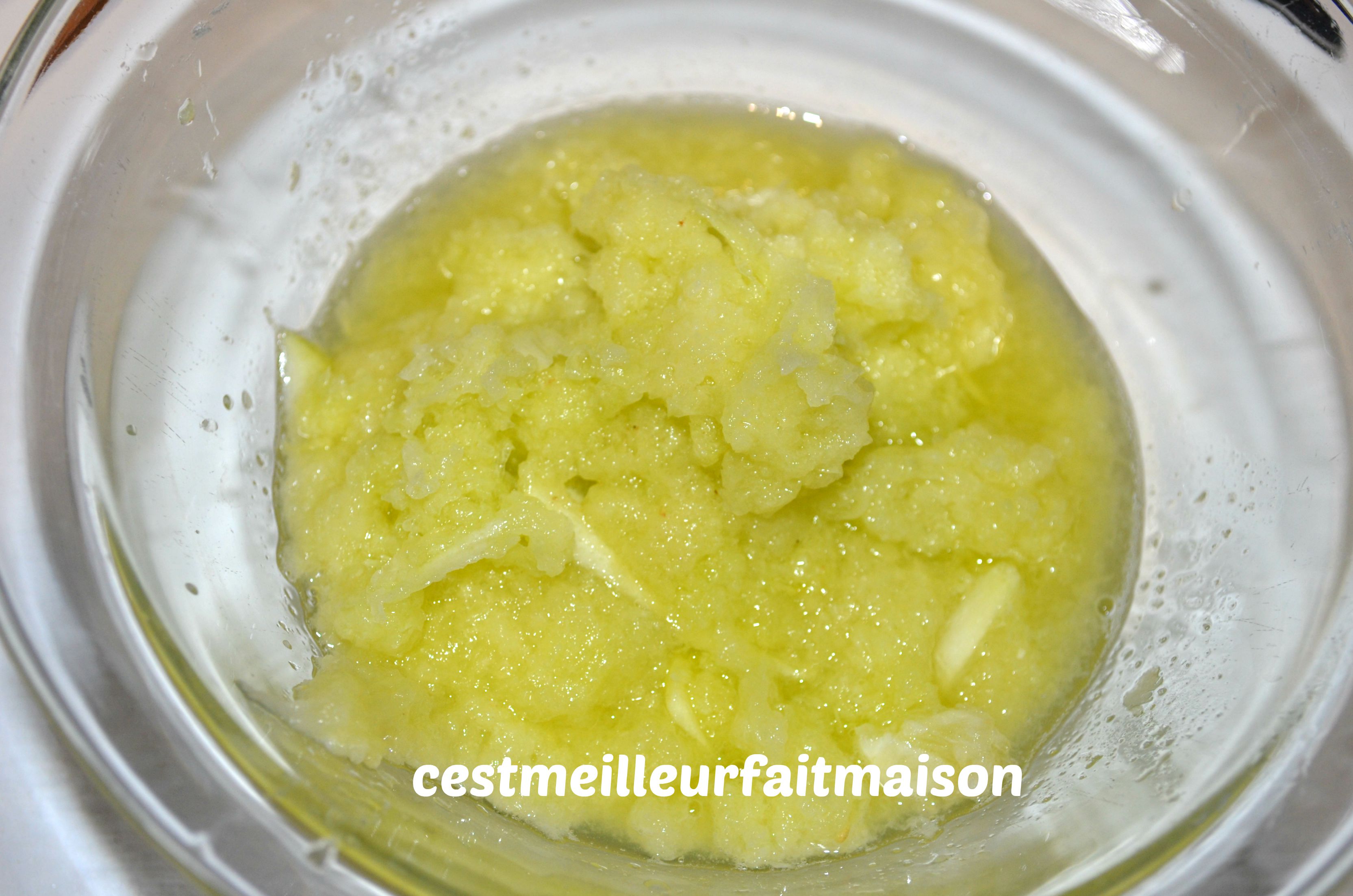 1- Laver et éplucher la courgette. La râper. J’ai utilisé ma râpe Microplane, la texture était parfaite. On doit obtenir 200 g et garder le jus.