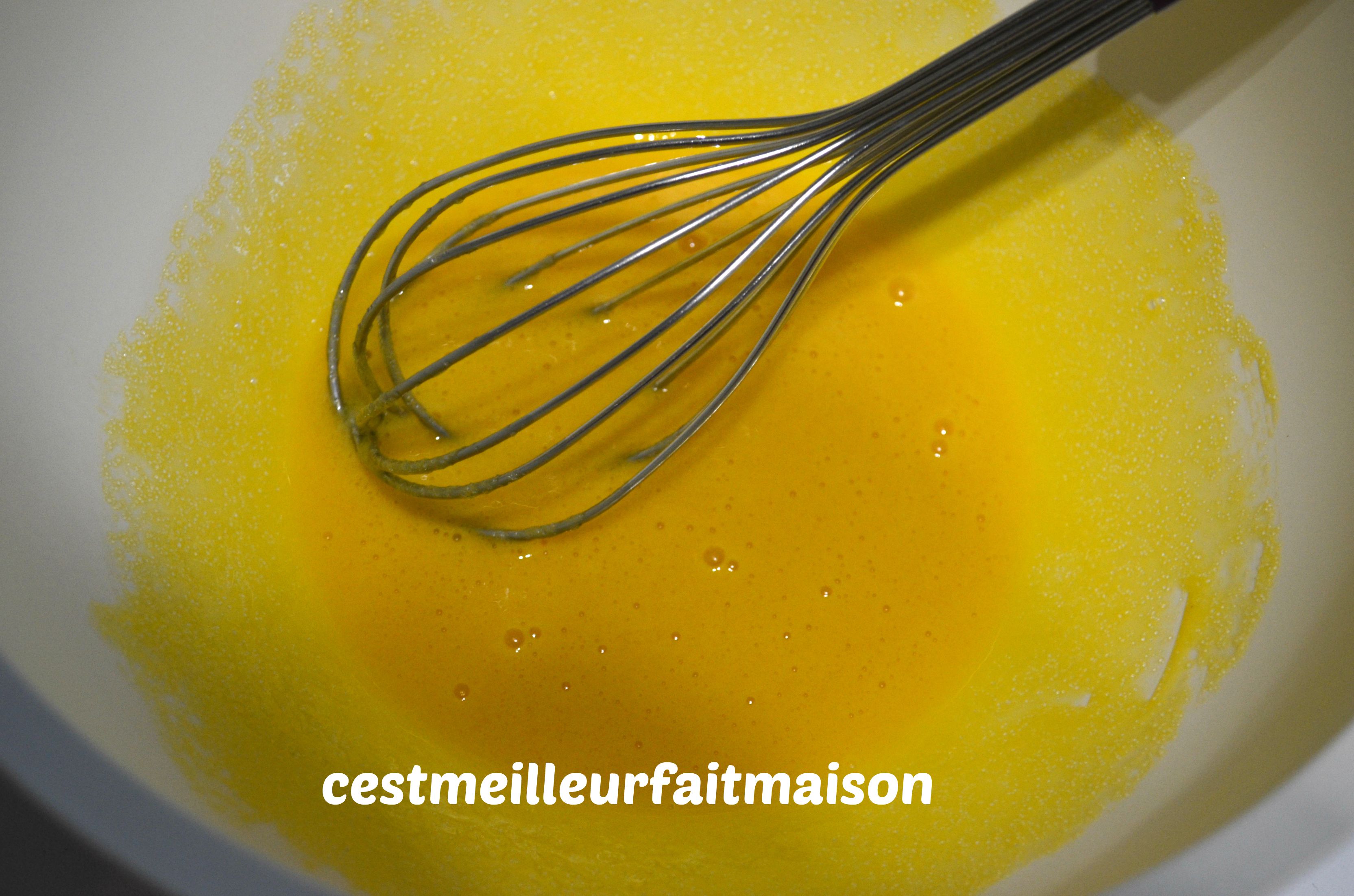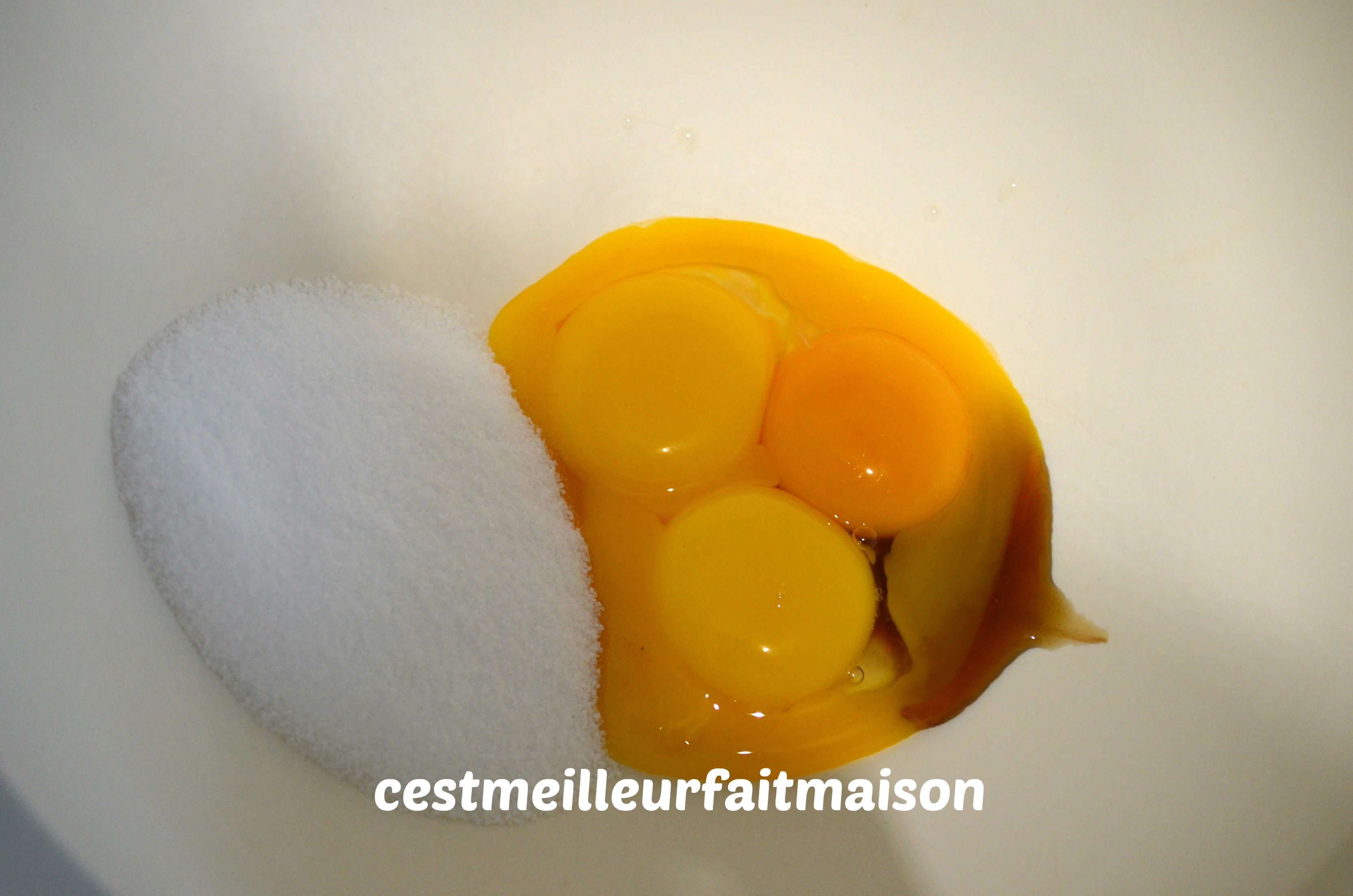 3- Séparer les blancs des jaunes d’œufs. Dans un saladier, fouetter les jaunes avec le sucre et la vanille.