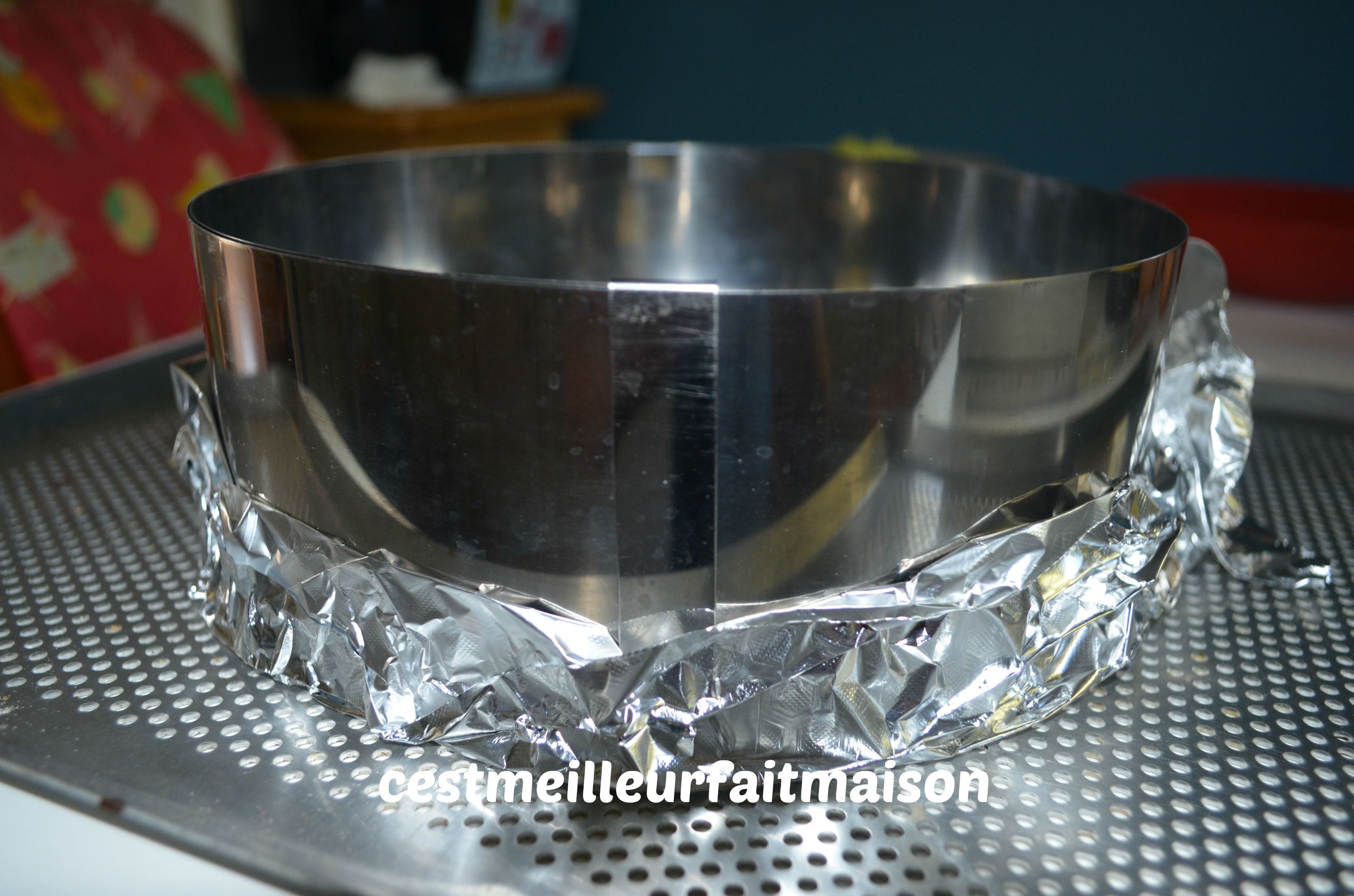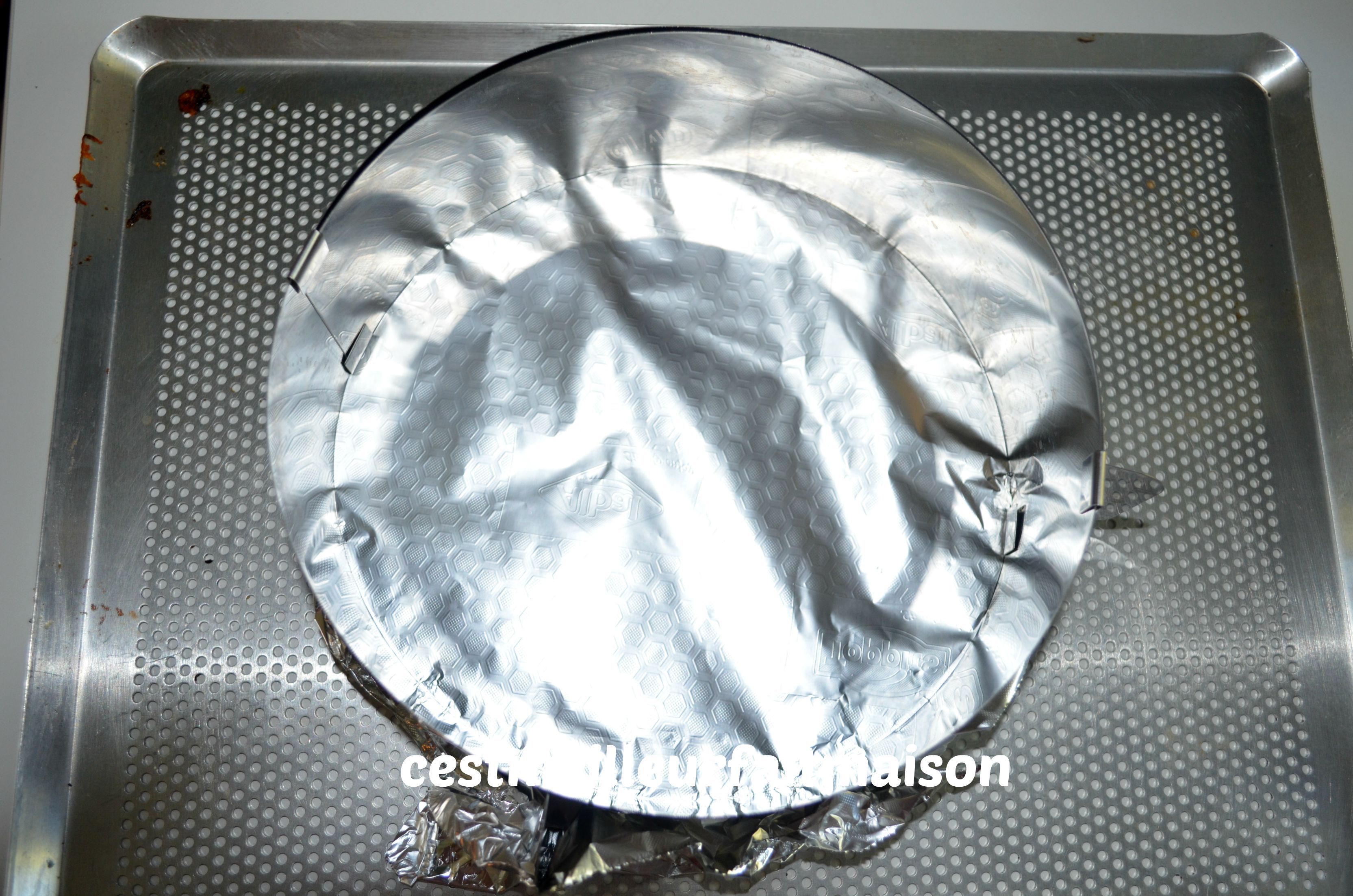 9- Pour que le gâteau soit haut, il faut un moule de 20 cm. Comme je n’en ai pas , j’ai utilisé un cercle à gâteau que j’ai réglé sur 20 cm. Pour éviter que la pâte s’échappe, j’ai utilisé de l’alu sous le cercle comme sur les images ci-dessous.