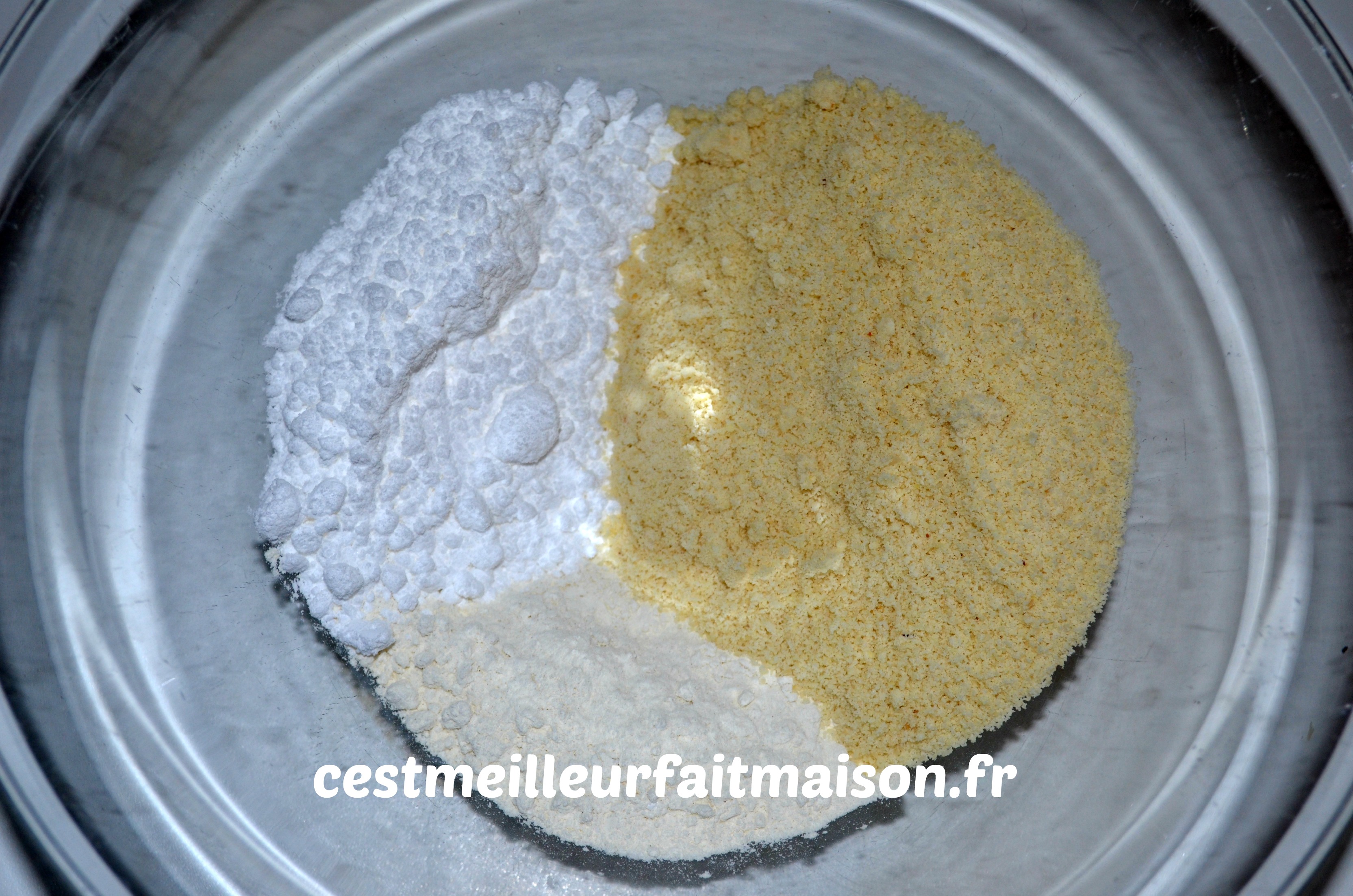 1- Dans un récipient, mélanger la farine, la levure, le sucre glace et la poudre d’amande.