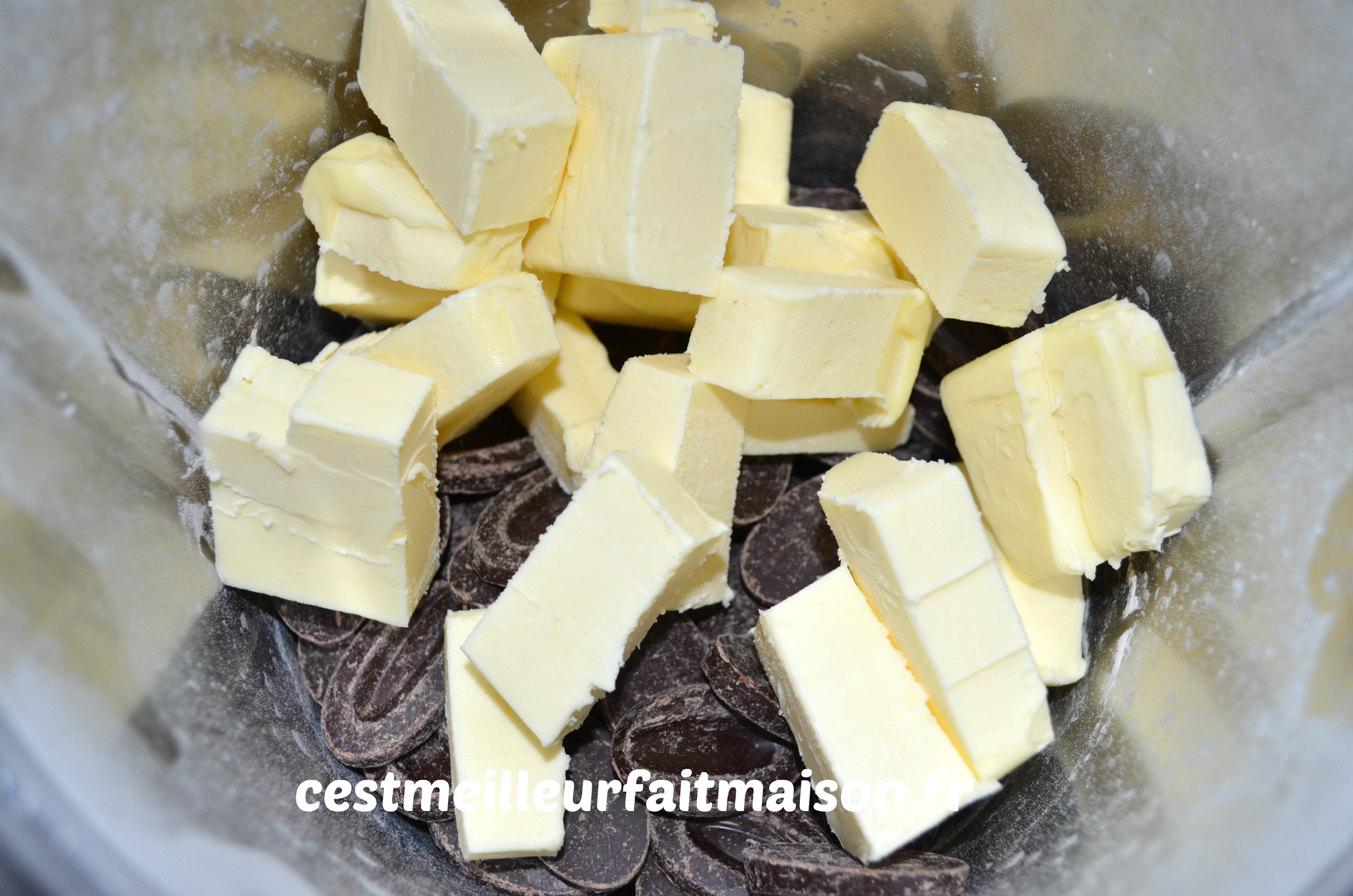 2- Dans le bol du Thermomix, mettre le beurre coupé en morceaux et le chocolat. Programmer 10 min/50°C/Vit 2. Etape qui peut, bien entendu, se faire au bain marie ou au micro-ondes.