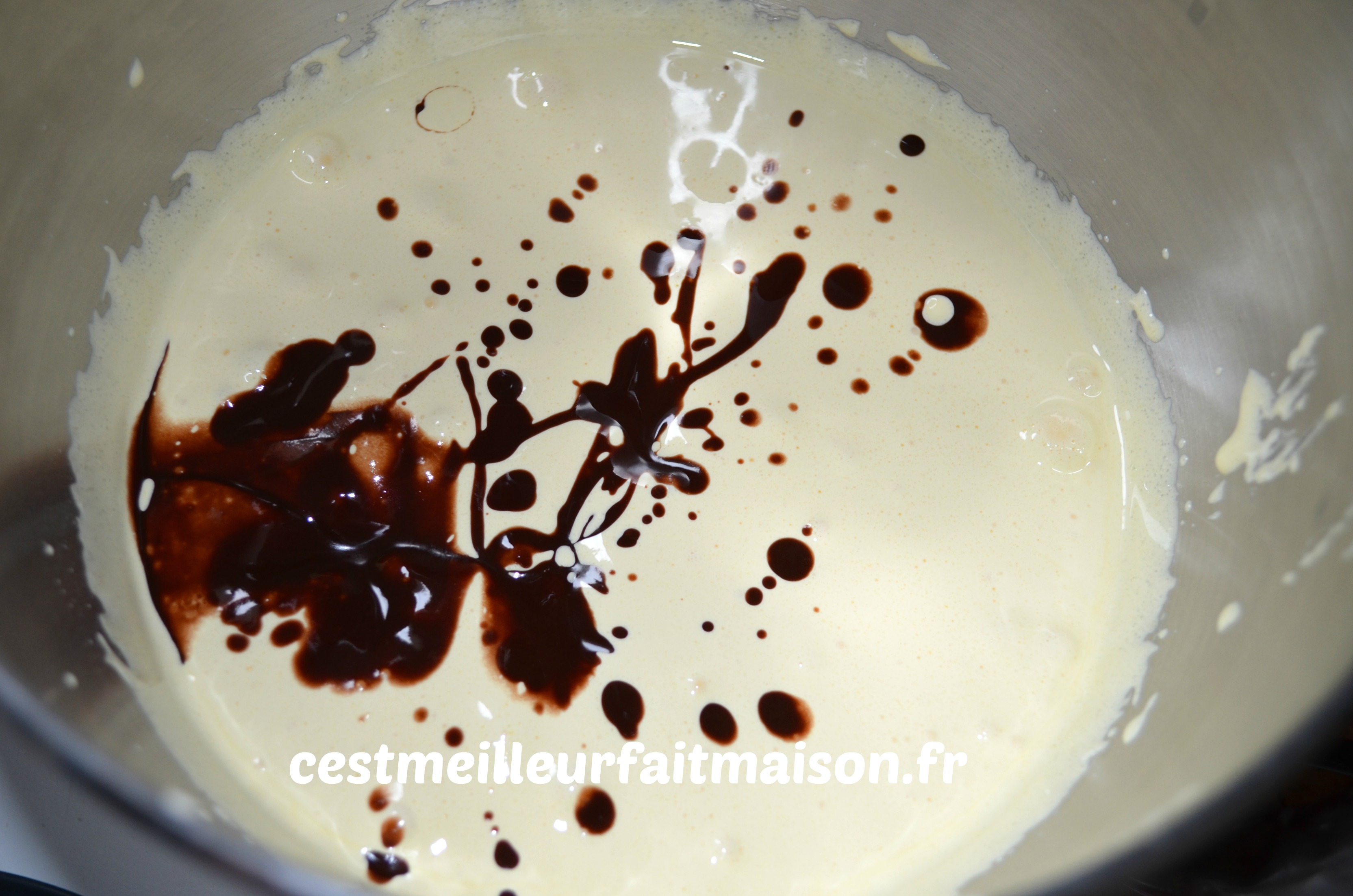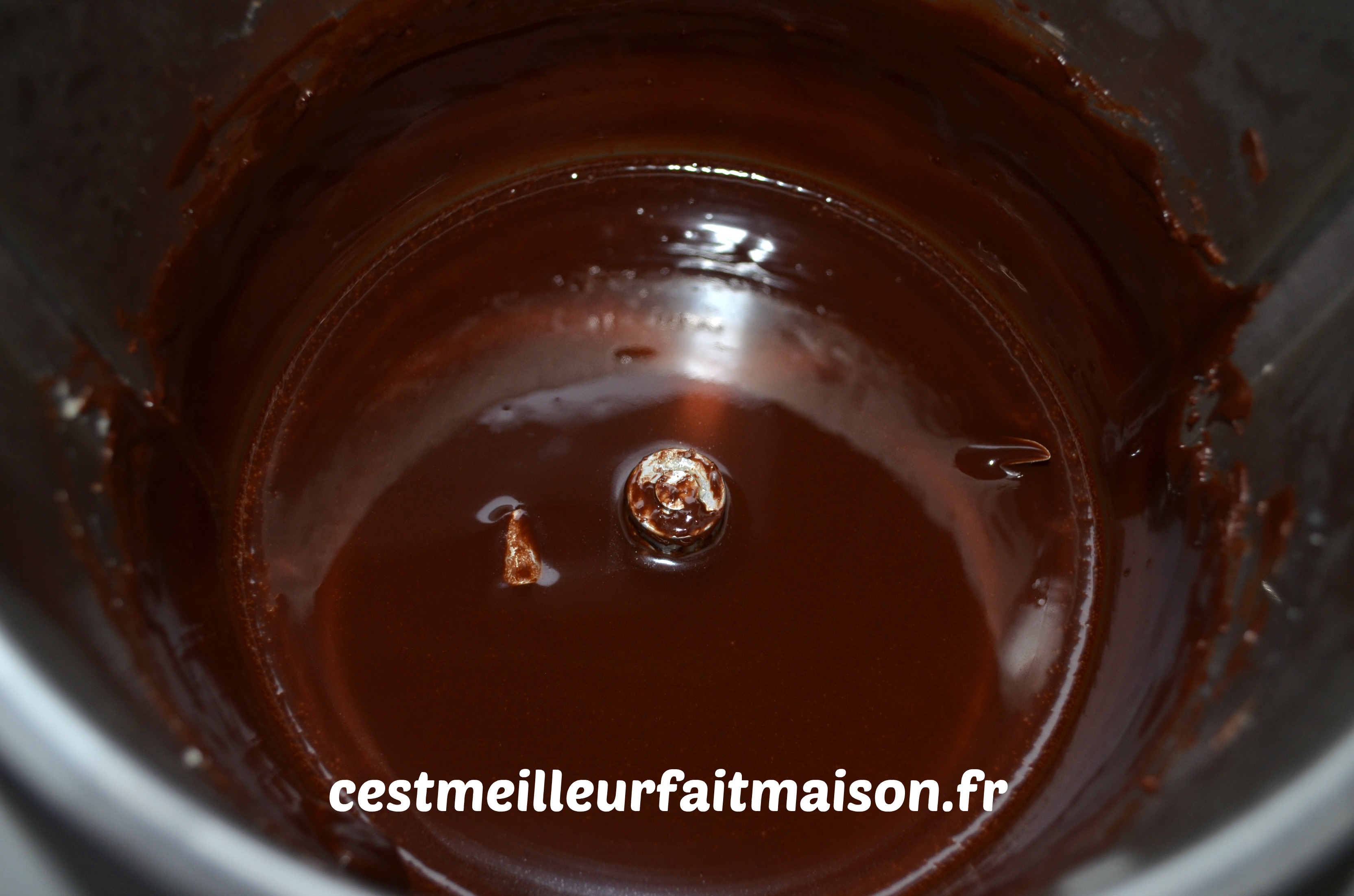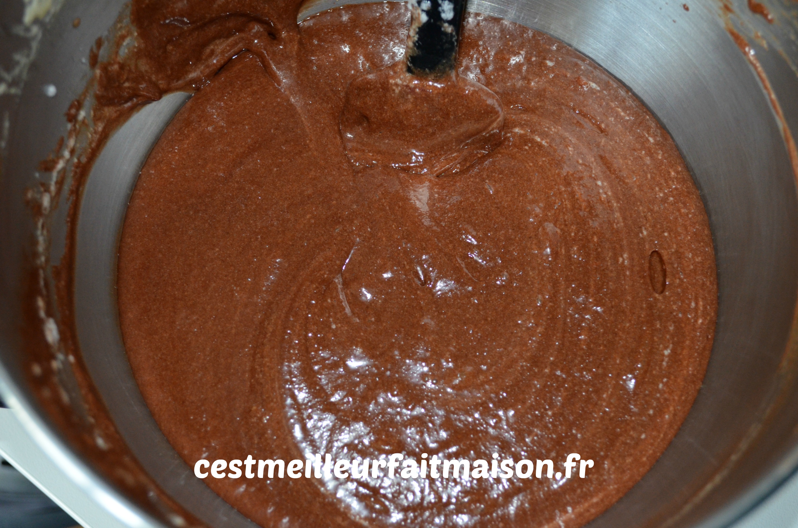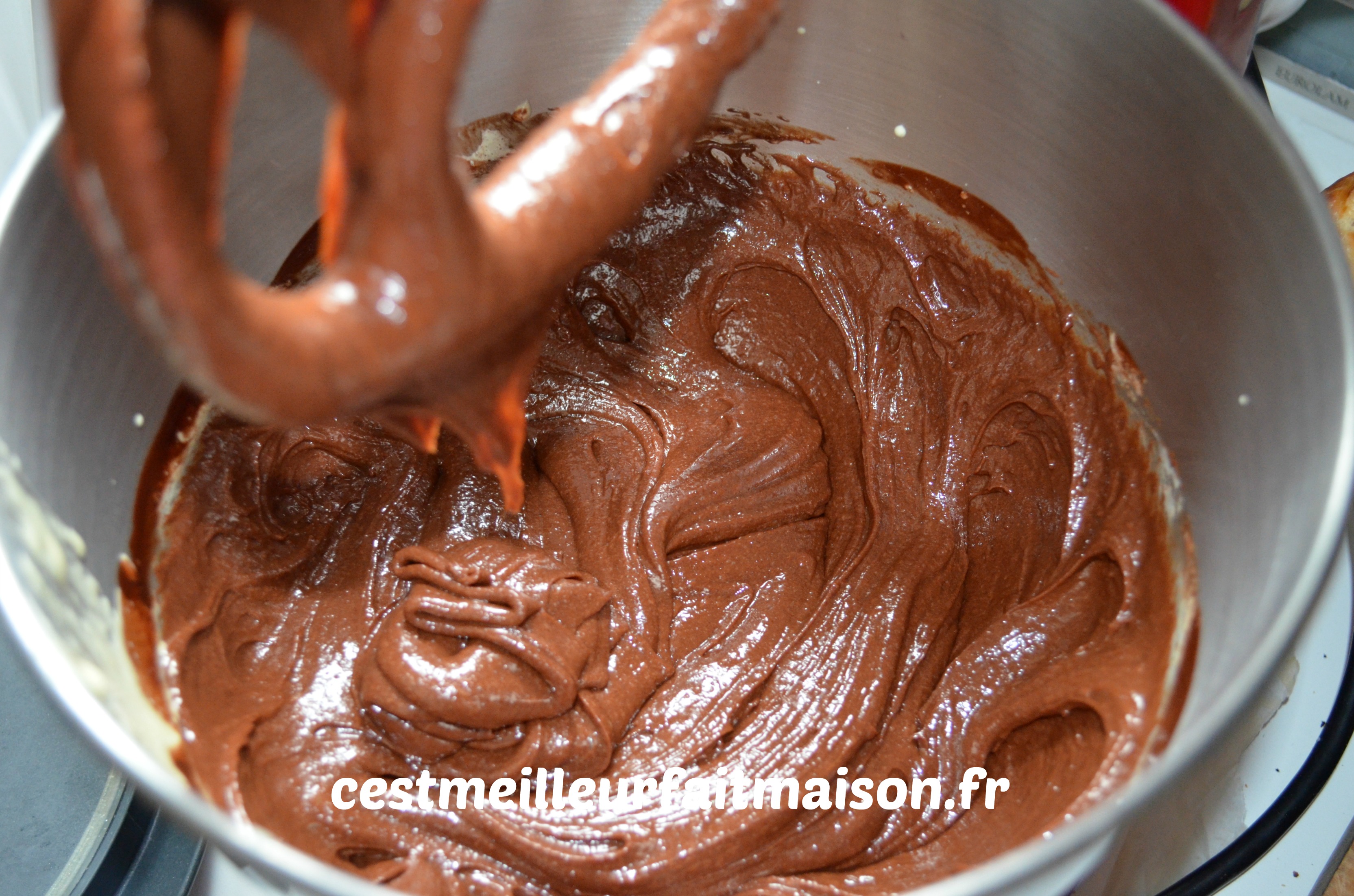5- Ajouter le mélange chocolat beurre et mettre la feuille à la place du fouet. Mélanger 3 min.