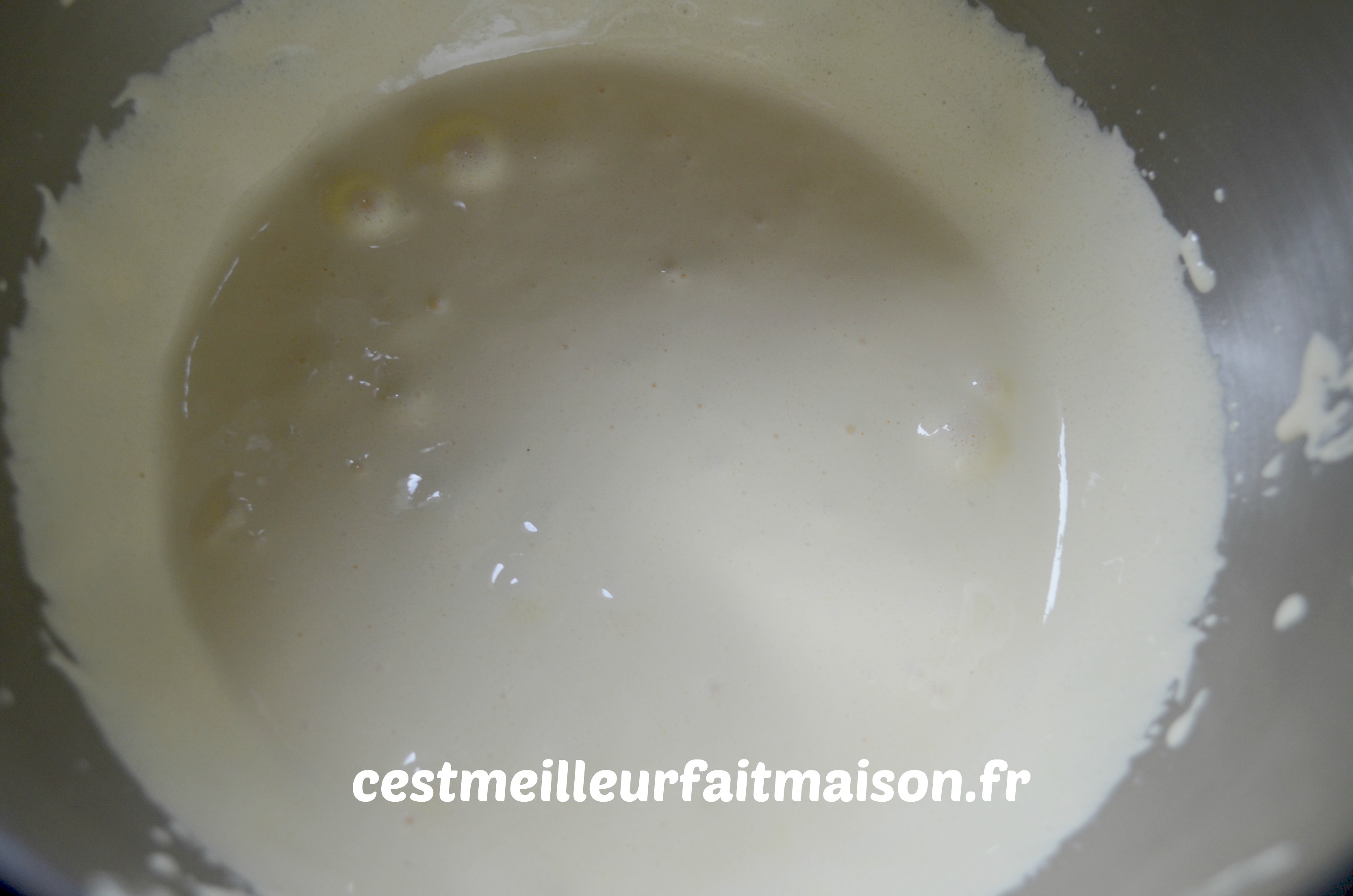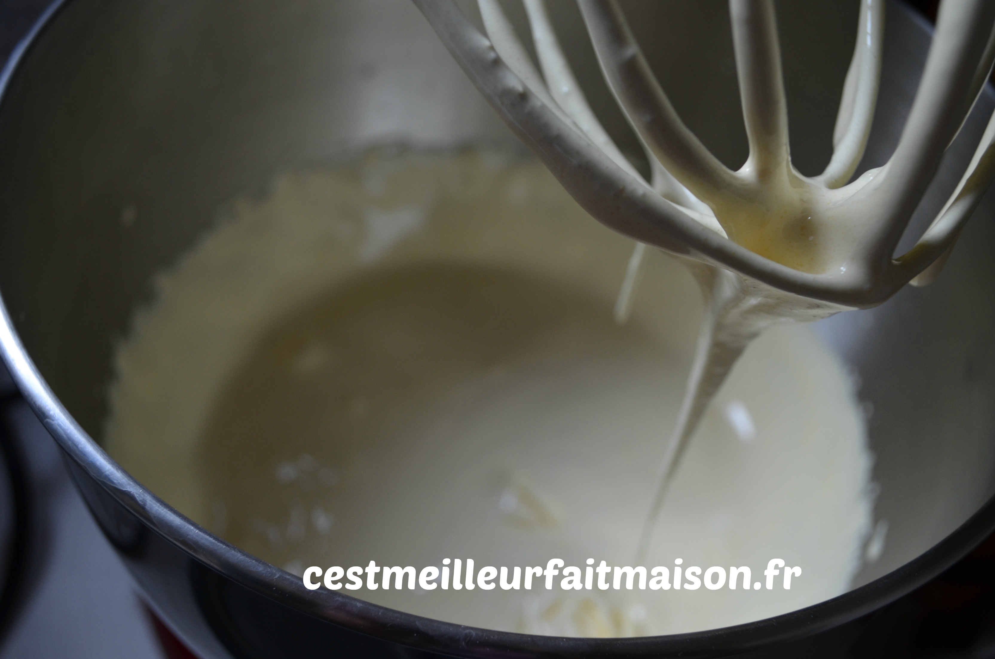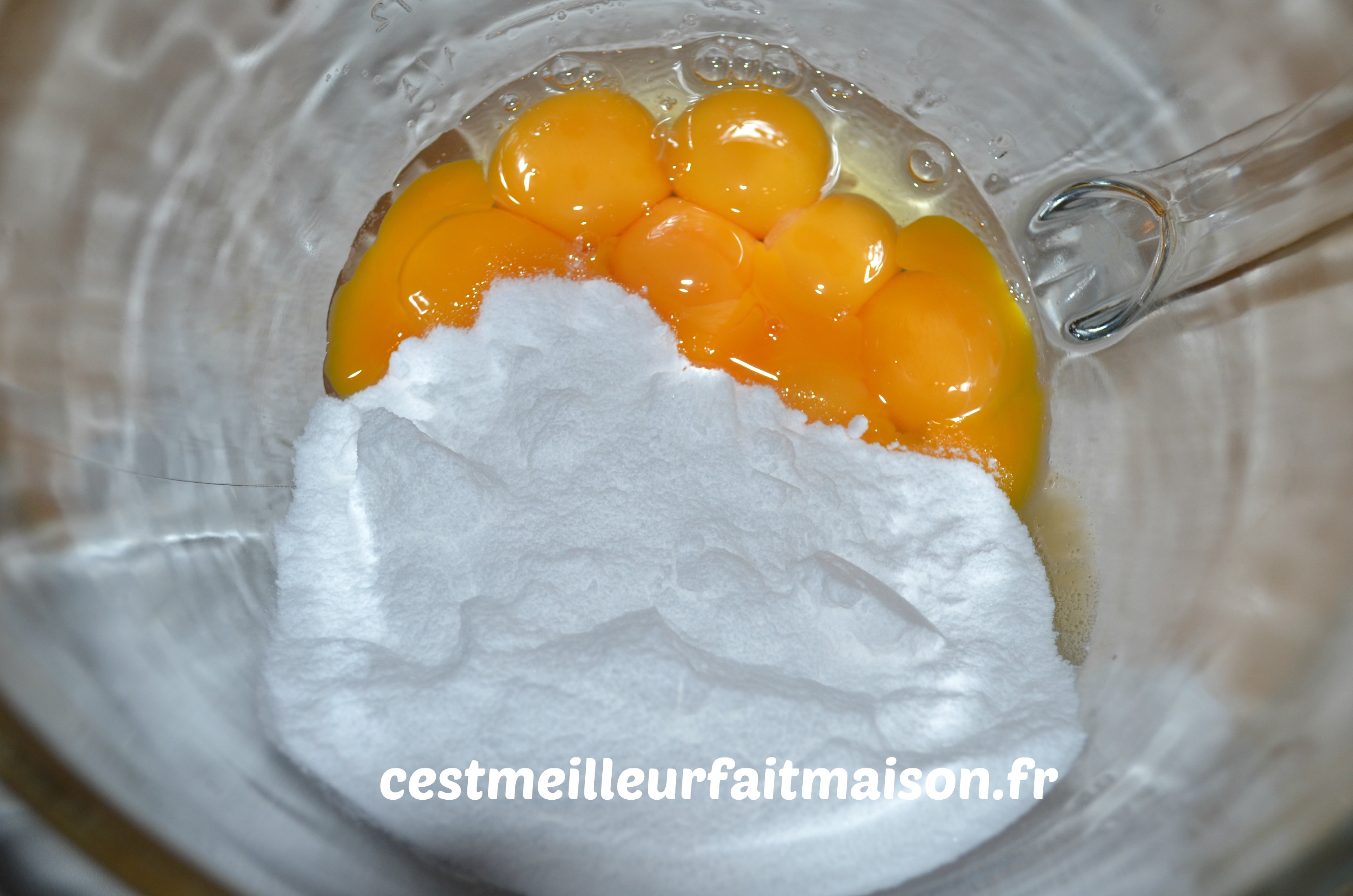 4- Dans le bol du robot (Kitchenaid pour moi), mettre les jaunes d’œufs et le sucre. Fouetter Vit 10 pendant 5 min.