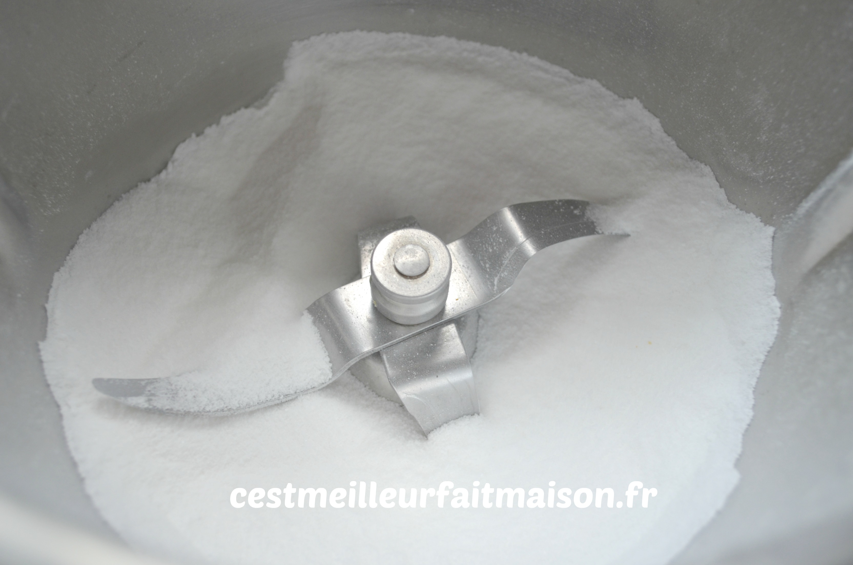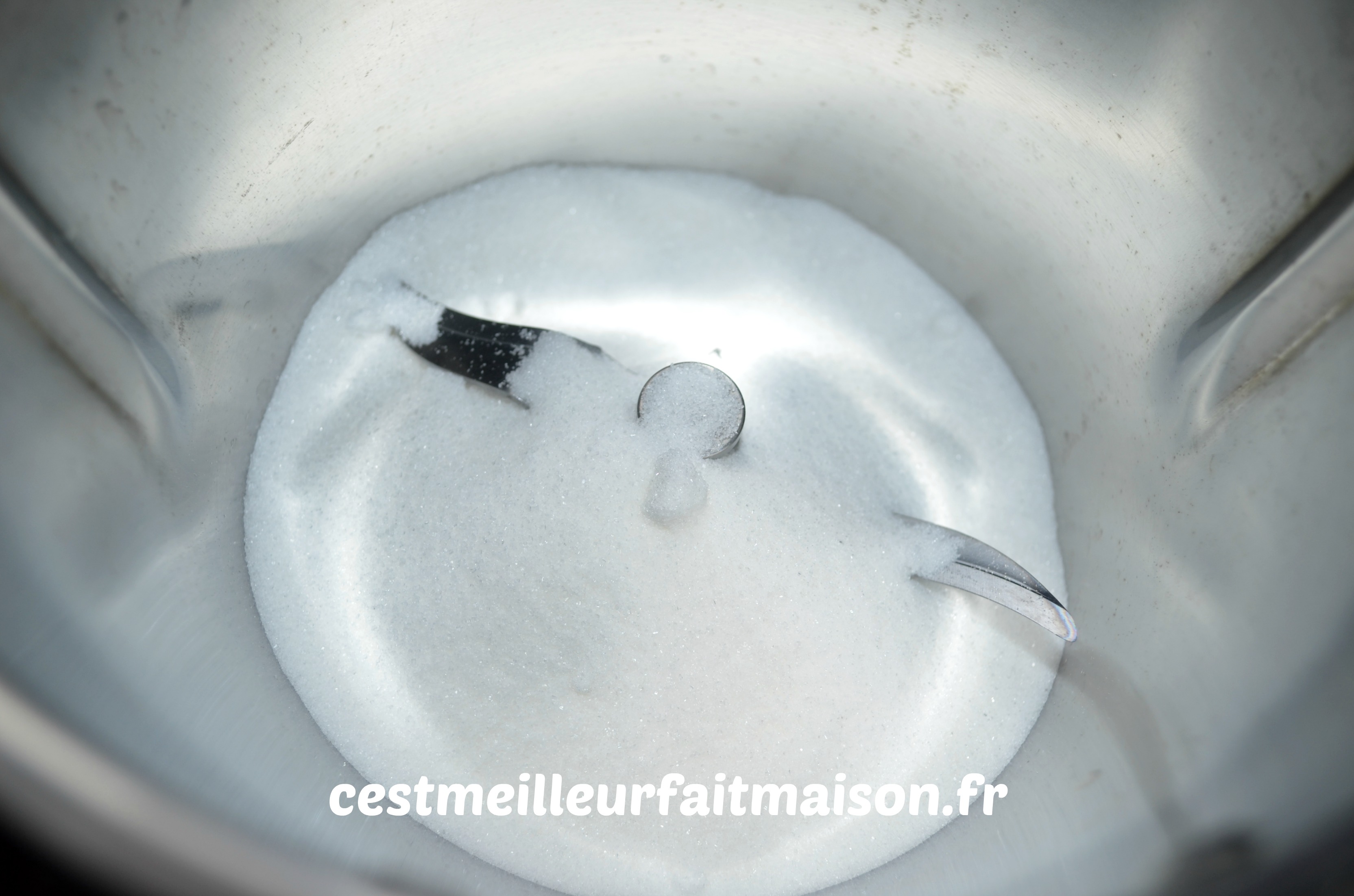 1- Si vous n’avez pas de sucre fin, commencer par en faire au Thermomix en mixant quelques secondes à Vitesse 8. Réserver.