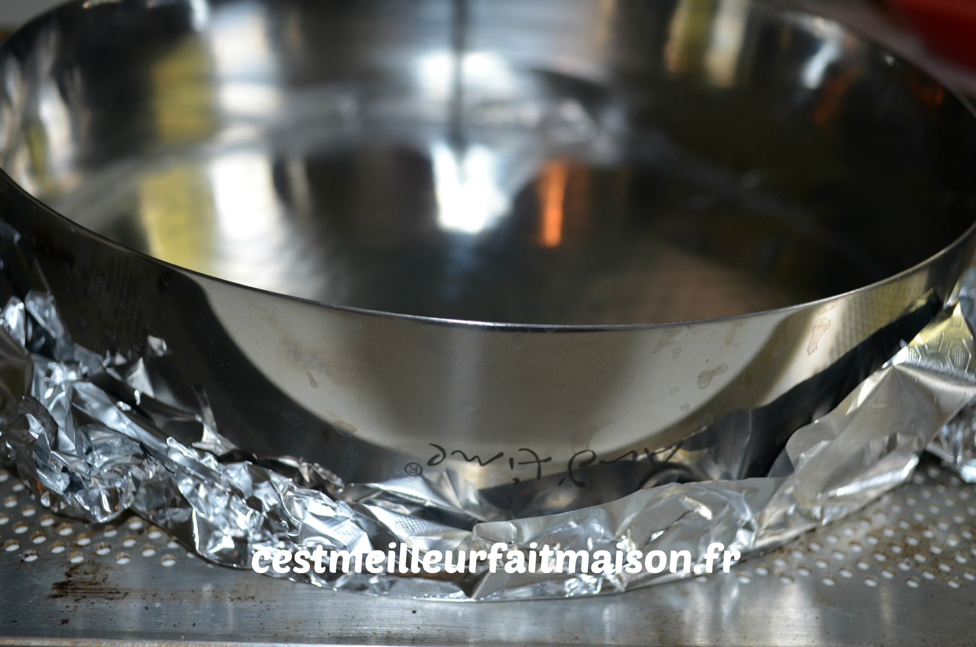 Beurrer un cercle à gâteau. Le mien fait 24 cm de diamètre. Avec un cercle plus petit le gâteau sera plus haut. Le déposer sur du papier alu et bien refermer autour pour éviter que la pâte s’échappe. Déposer le tout sur une plaque perforée.