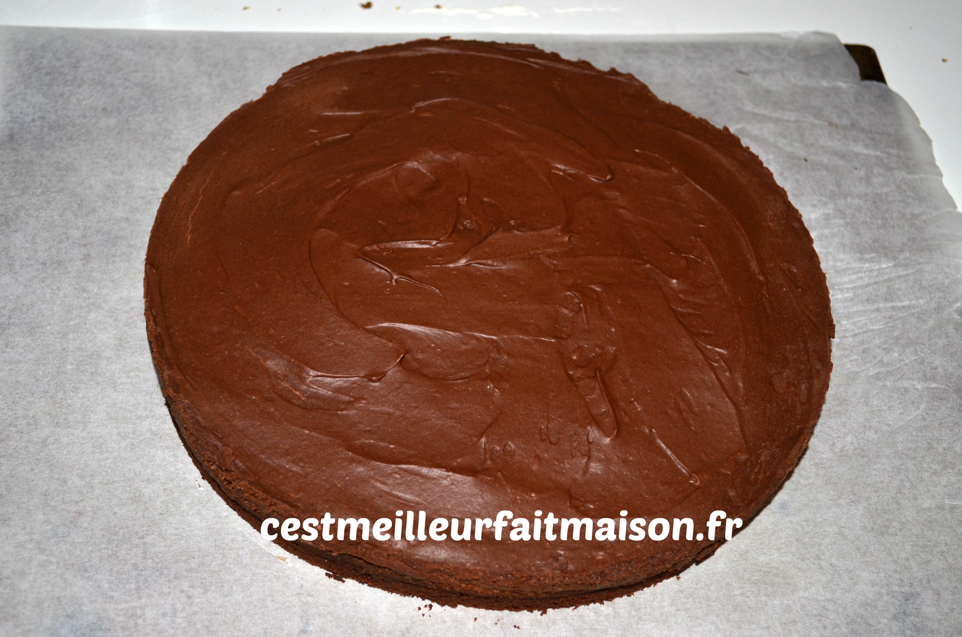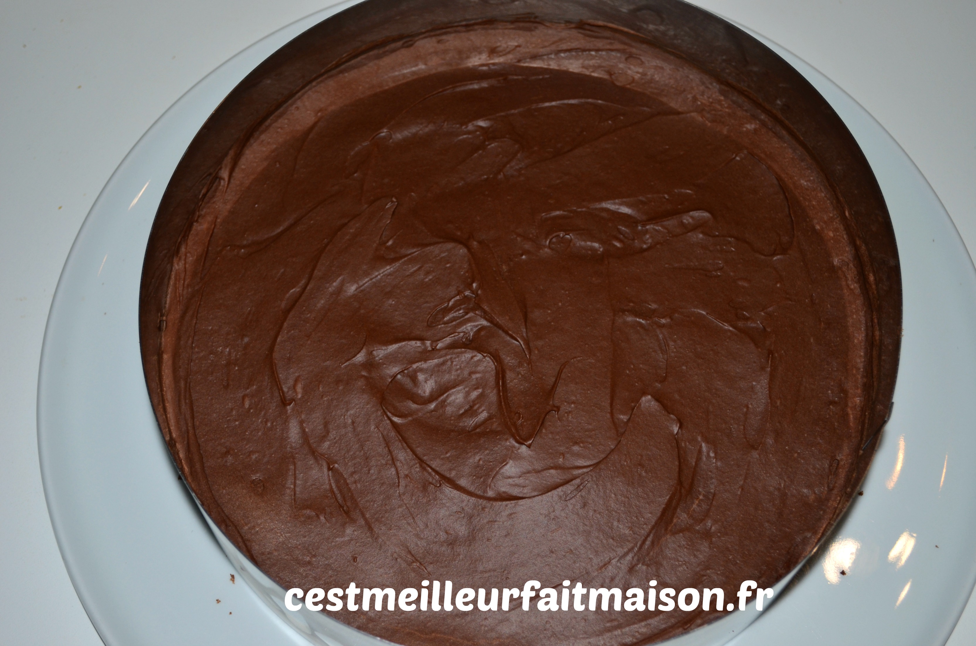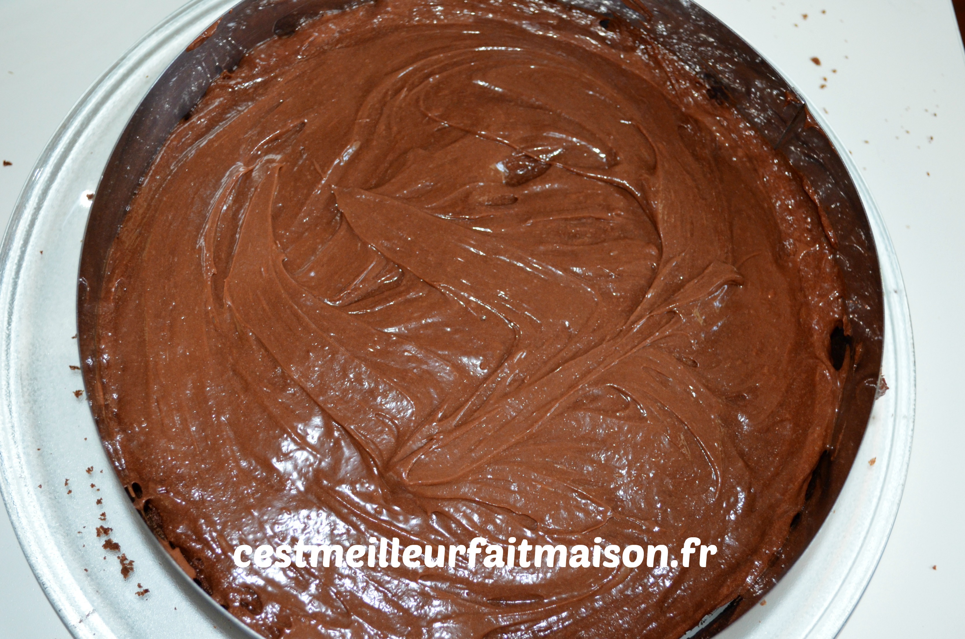 Verser la mousse restante et égaliser comme vous pouvez car ce n’est pas évident dans un cercle. Mettre au réfrigérateur plusieurs heures (2 jours pour moi).
