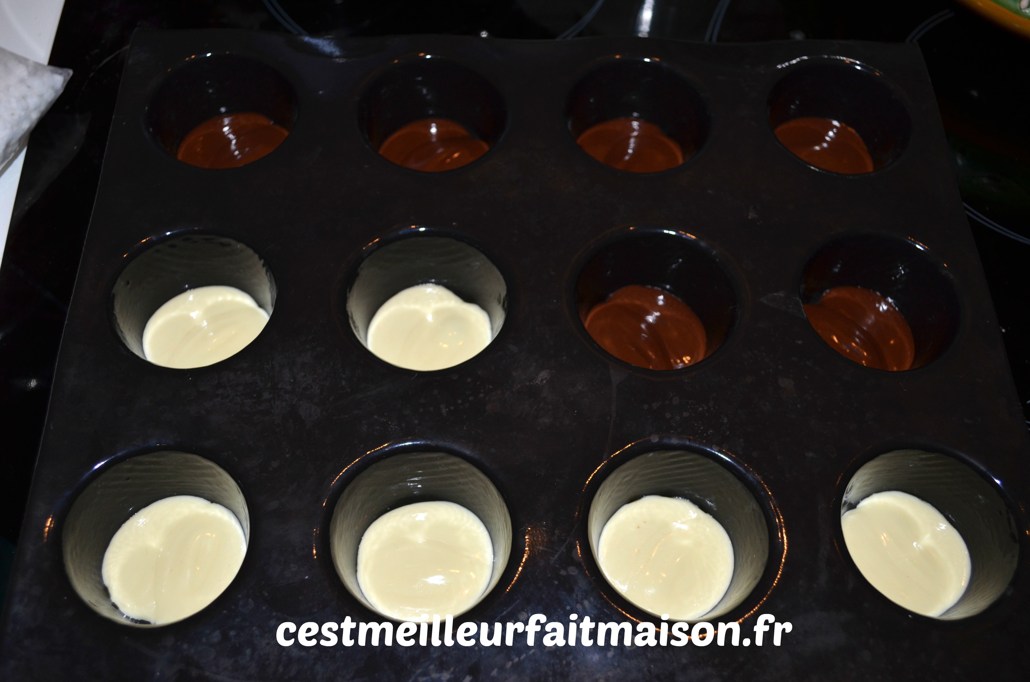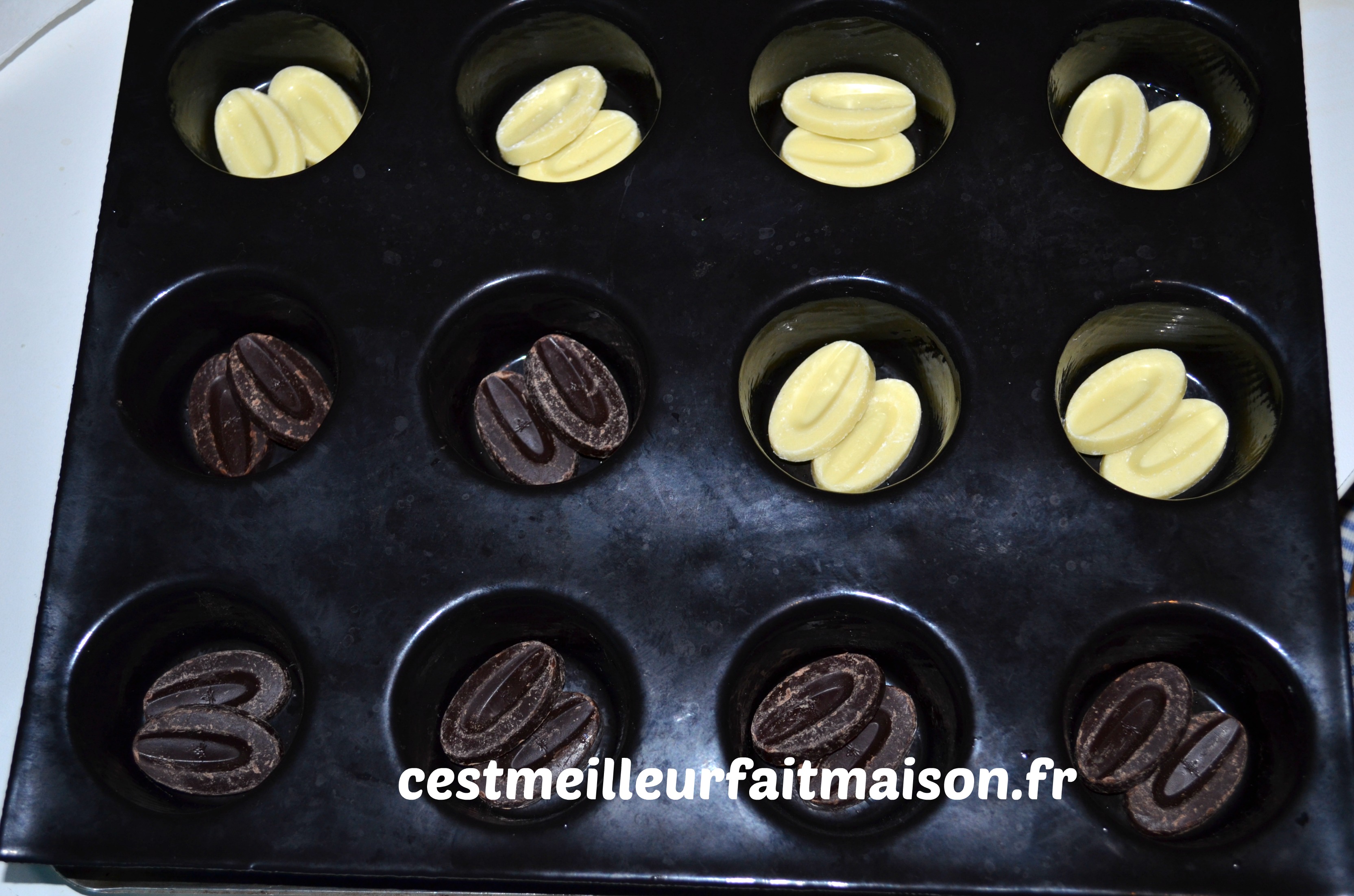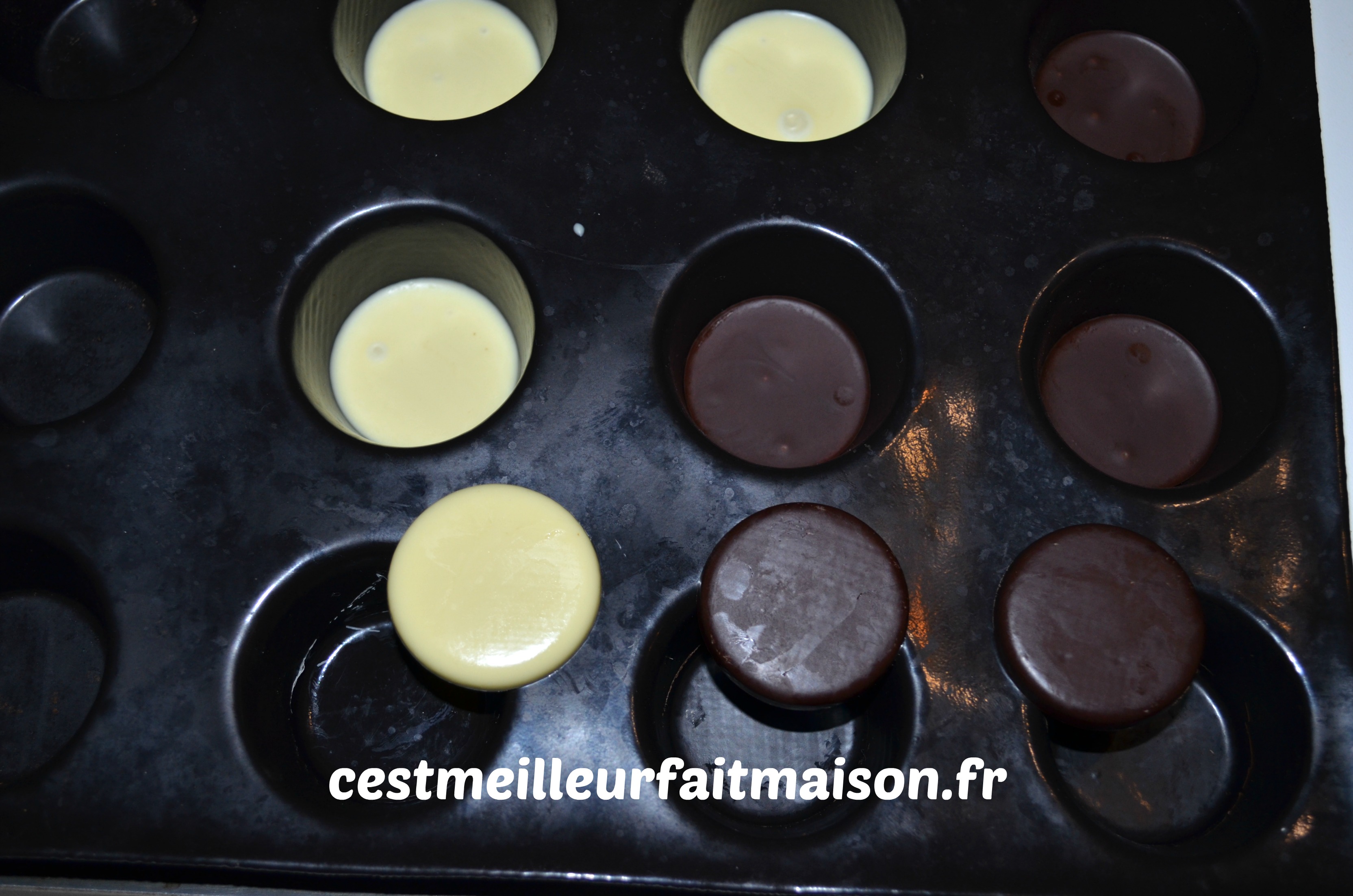 Préparer les disques de chocolat en mettant deux pistoles de chocolat dans chaque empreinte d’un moule à mini muffin. J’ai utilisé celui de Guy Demarle. Enfourner pour 3 min.