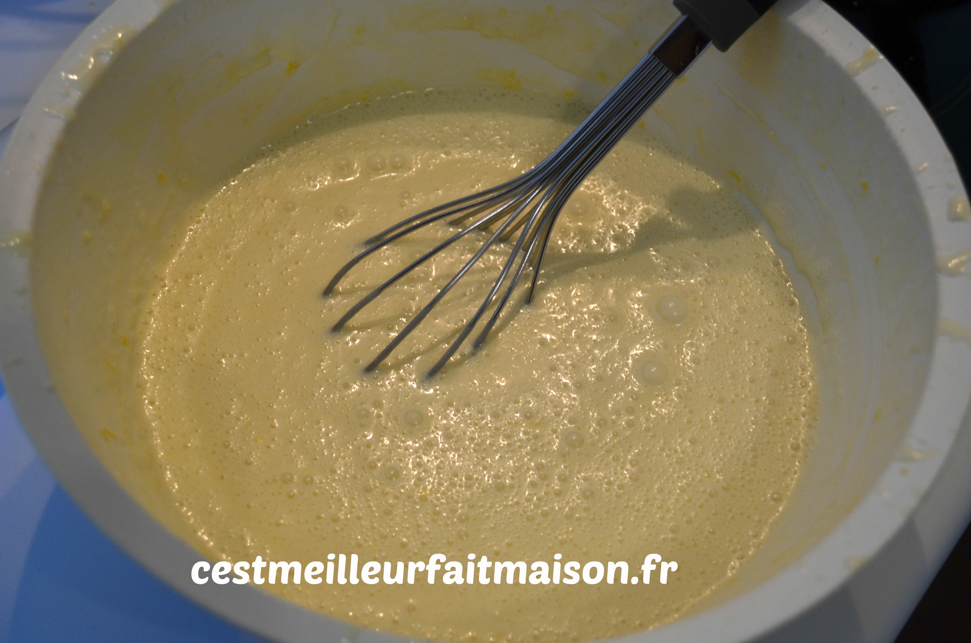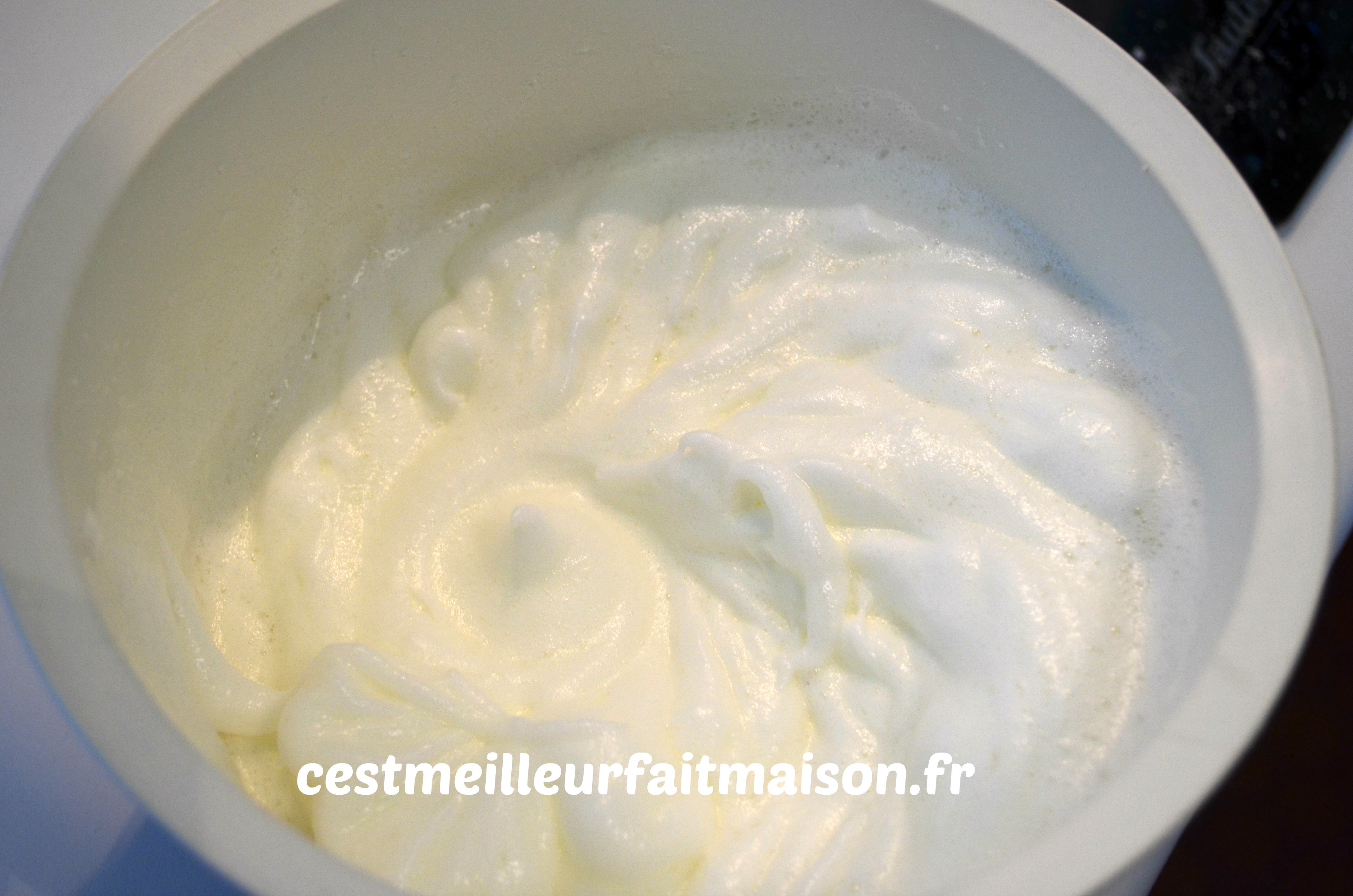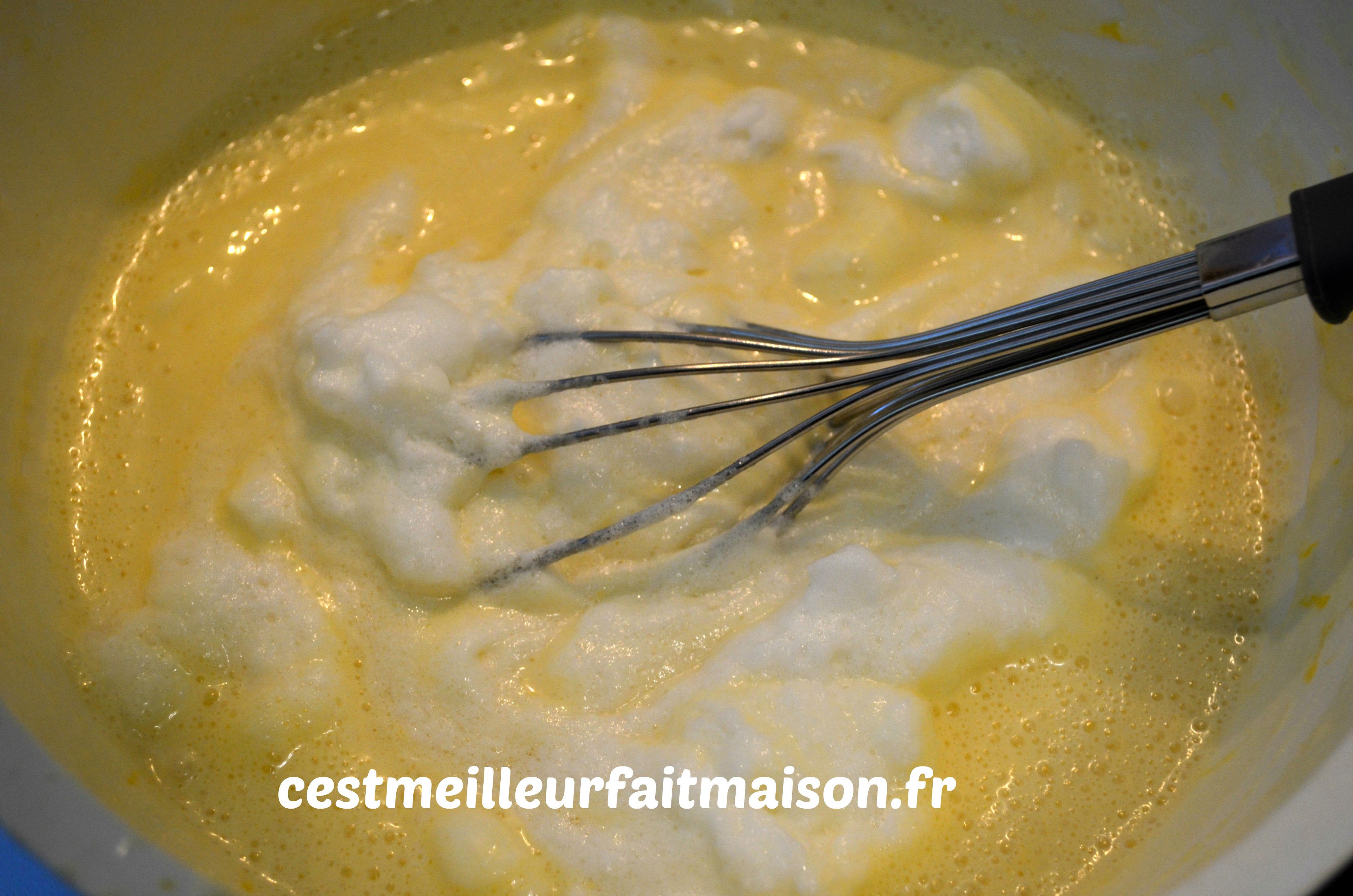 4- Ajouter, en trois fois, les blancs à la préparation précédente. Mélanger au fouet.