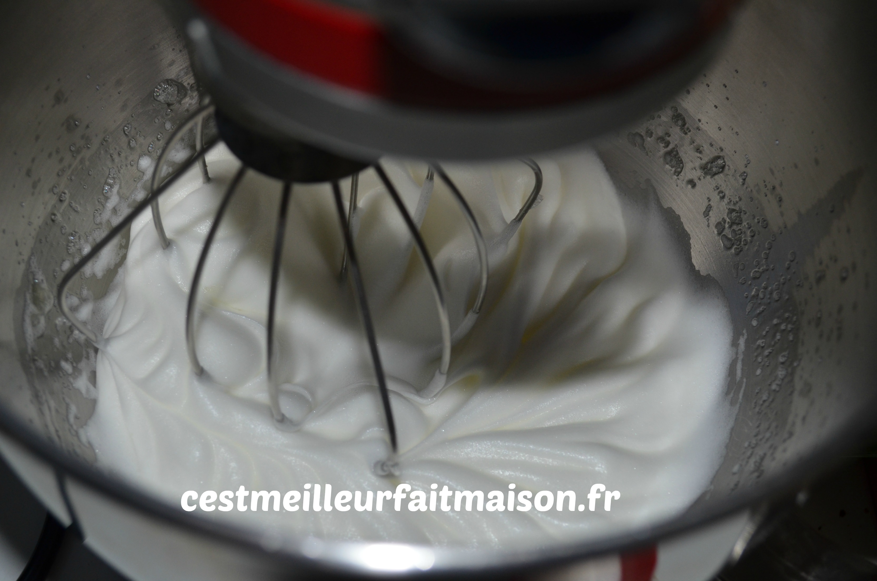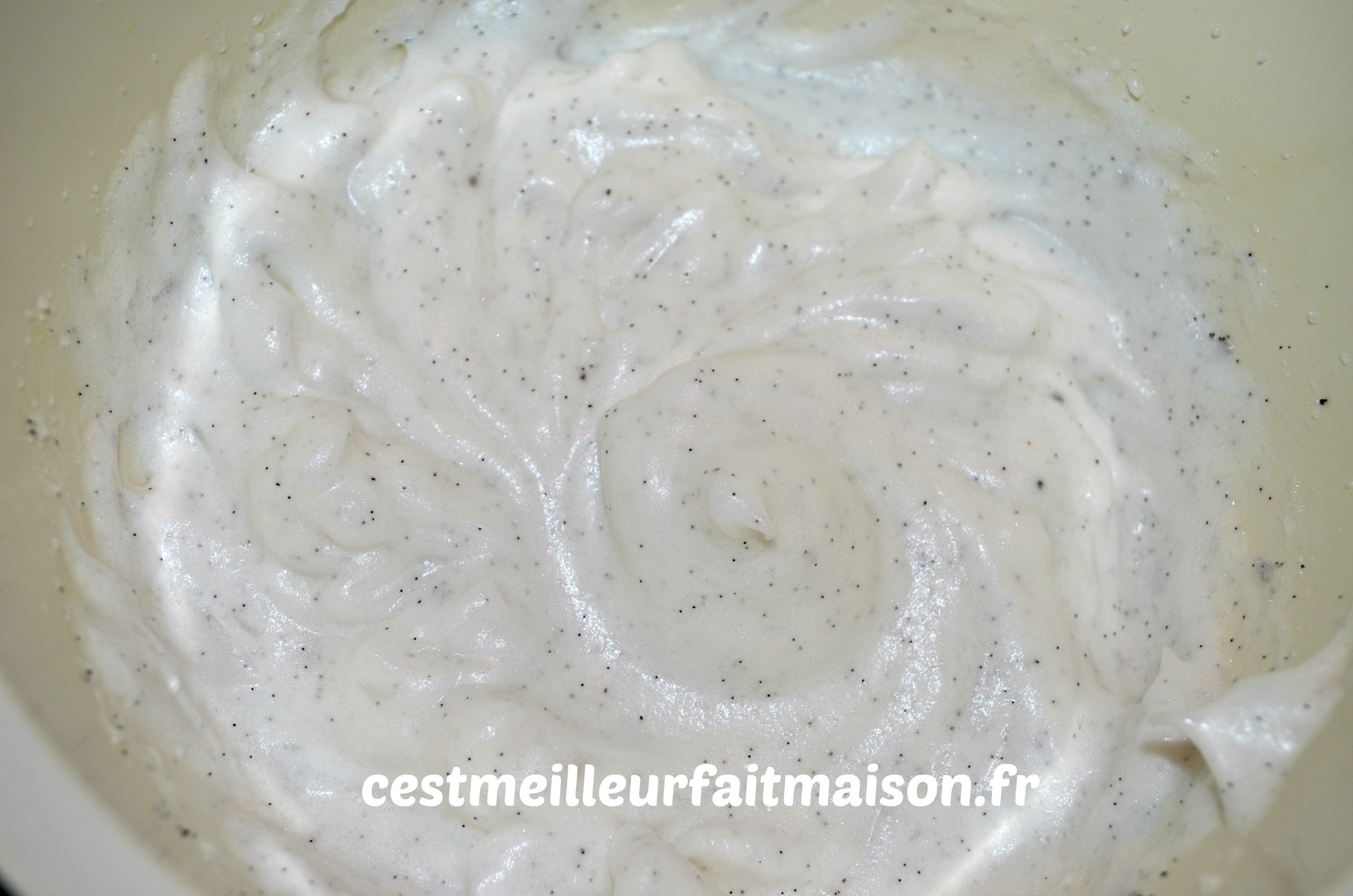 Fouetter les blancs en neige. Lorsqu’ils commencent à durcir, ajouter le sucre et les graines de la gousse de vanille.
