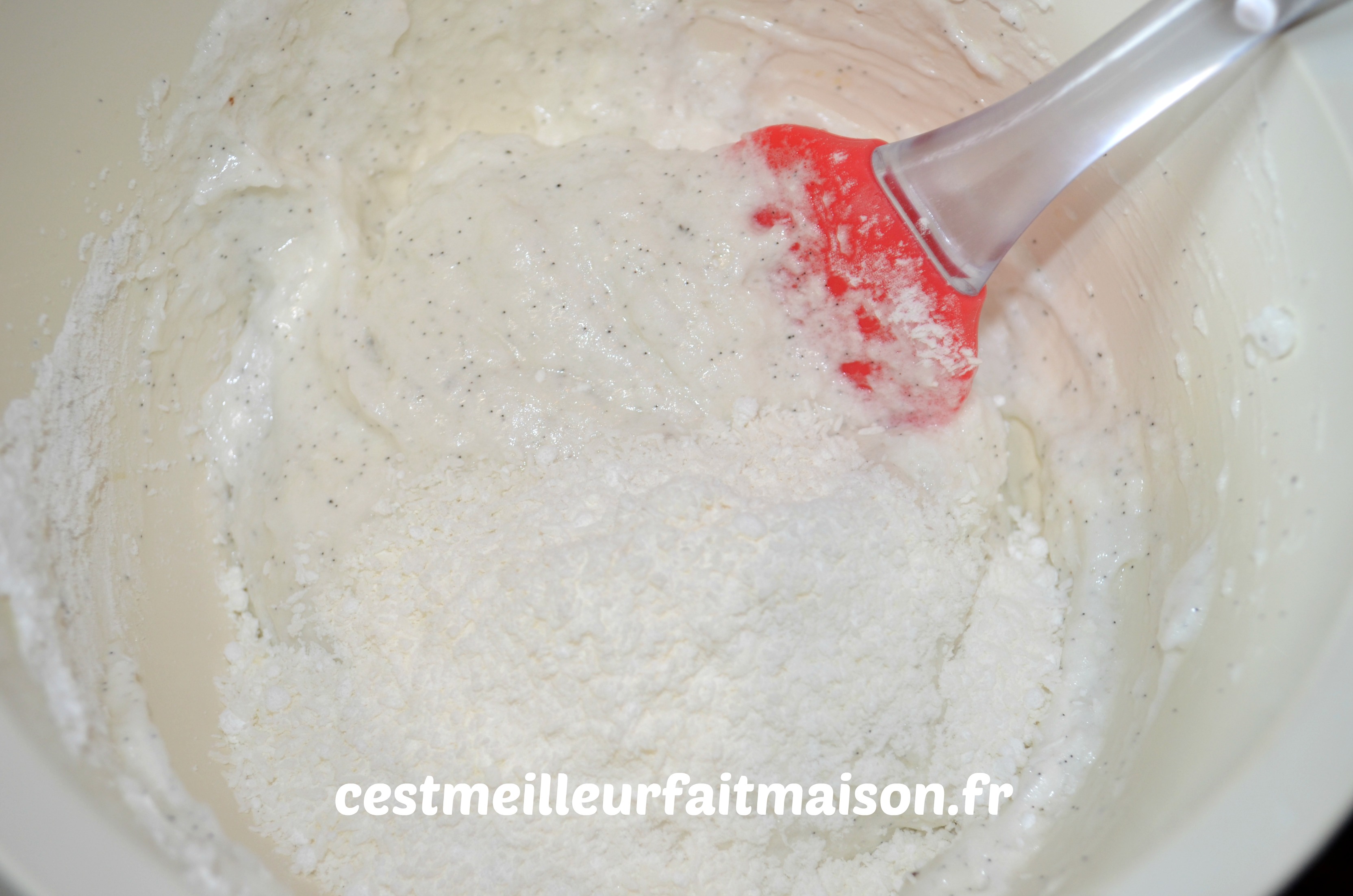 En deux fois, ajouter le mélange sucre glace-noix de coco-Maïzéna. Mélanger à la maryse.