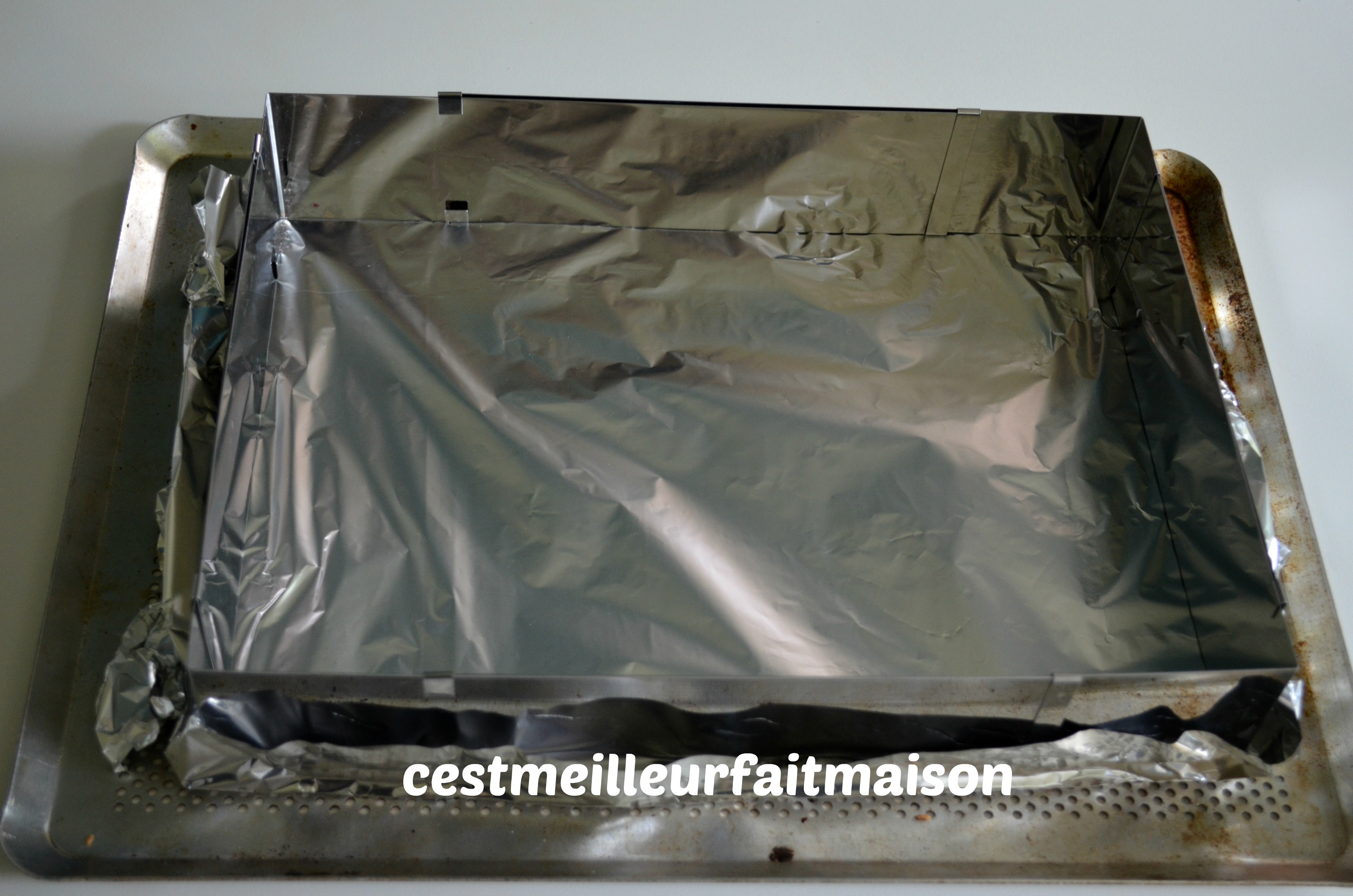 Préparer un cercle ou un cadre à gâteau. J’ai mis de l’aluminium en dessous pour éviter que la pâte coule sous le cercle ou le cadre.