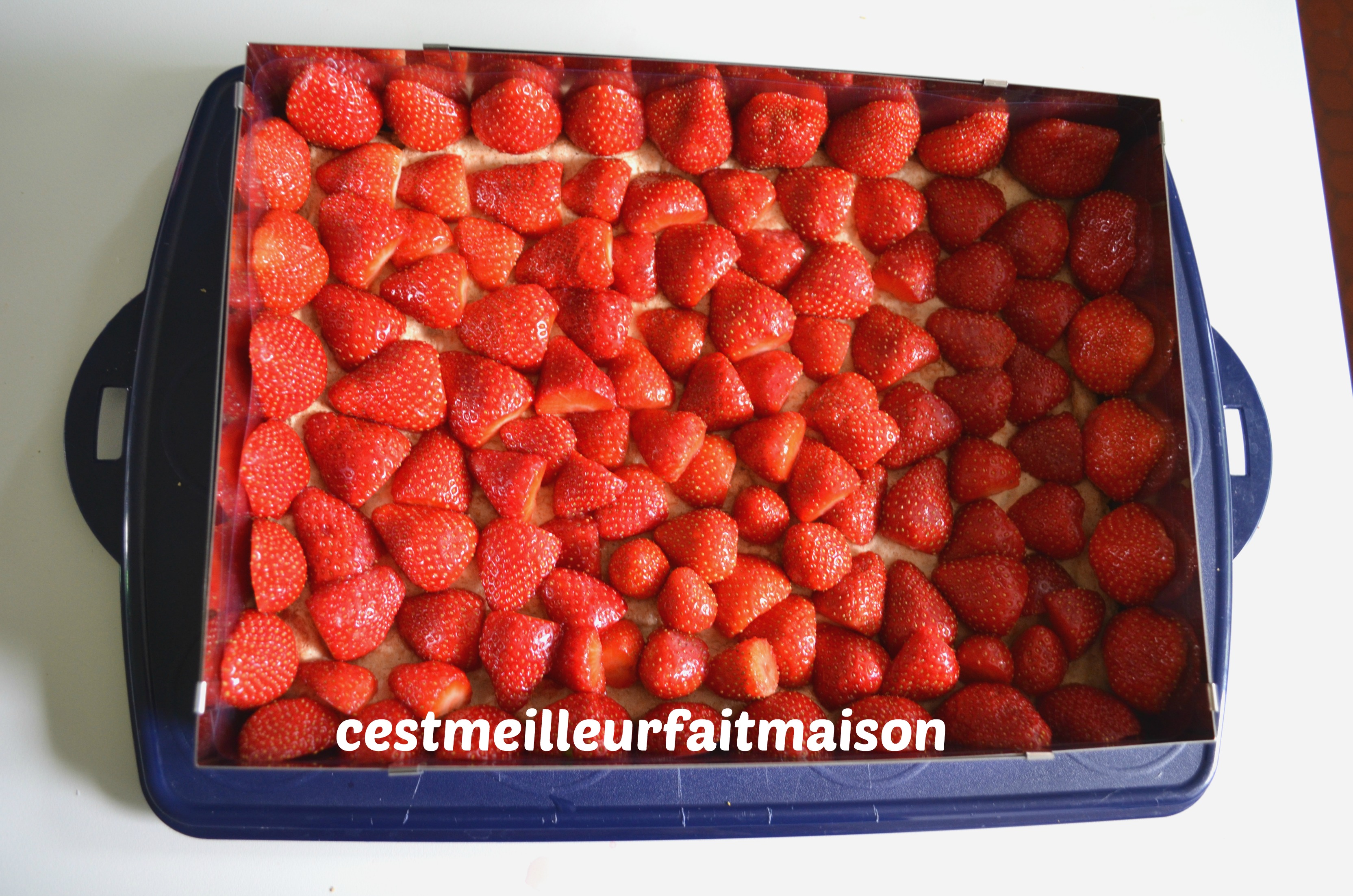 Remettre la dacquoise dans le cercle ou le cadre. Mettre du Rhodoïd à l’intérieur, le démoulage sera plus facile. Disposer des fraises de même taille contre le cercle ou le cadre. Mettre le reste des fraises à l’intérieur. En réserver quelques unes pour la déco.