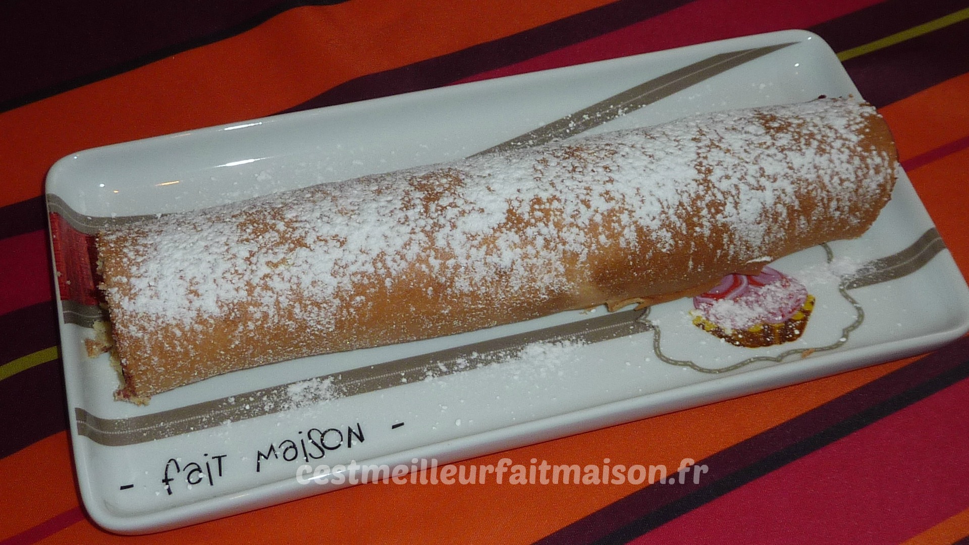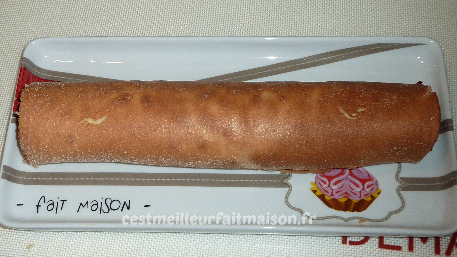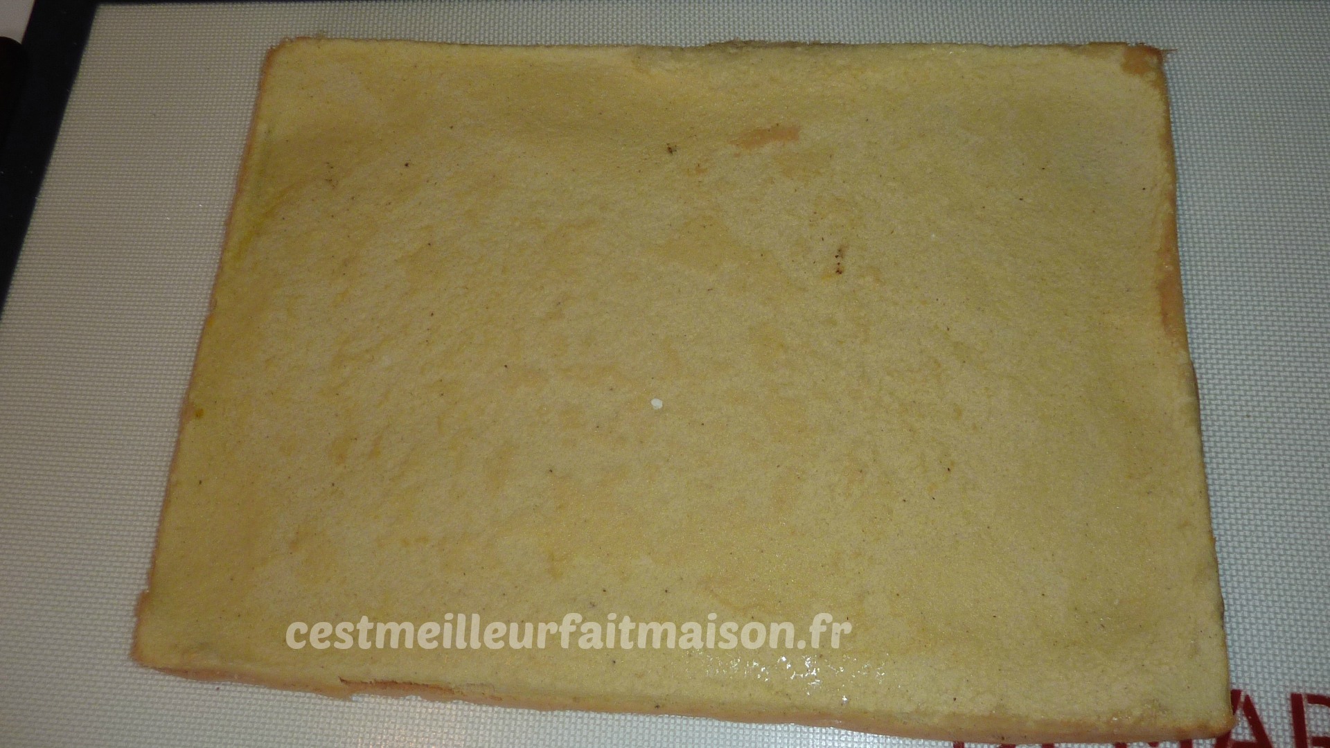 4- Démouler sur une toile ou la Roulepat et laisser refoidir un peu. Etaler de la confiture ou ce que vous voulez et rouler en s’aidant de la toile.