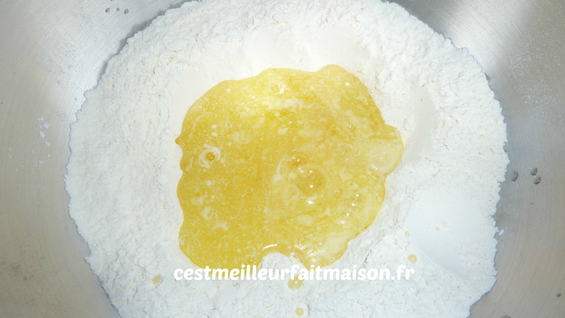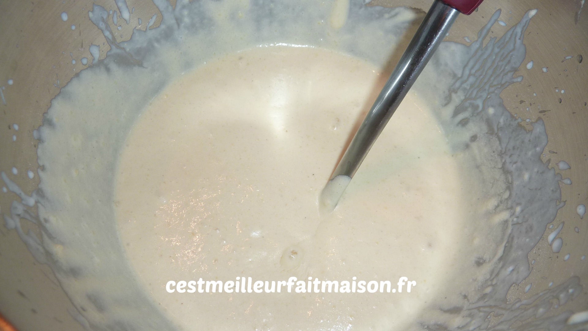 1- Dans un saladier, mélanger la farine, la levure, le sucre et le sel (si beurre doux). Ajouter au centre les oeufs battus, le beurre fondu et mélanger. Ajouter le lait tout en continuant à mélanger. J’ai utilisé la cuillère magique pour mélanger.