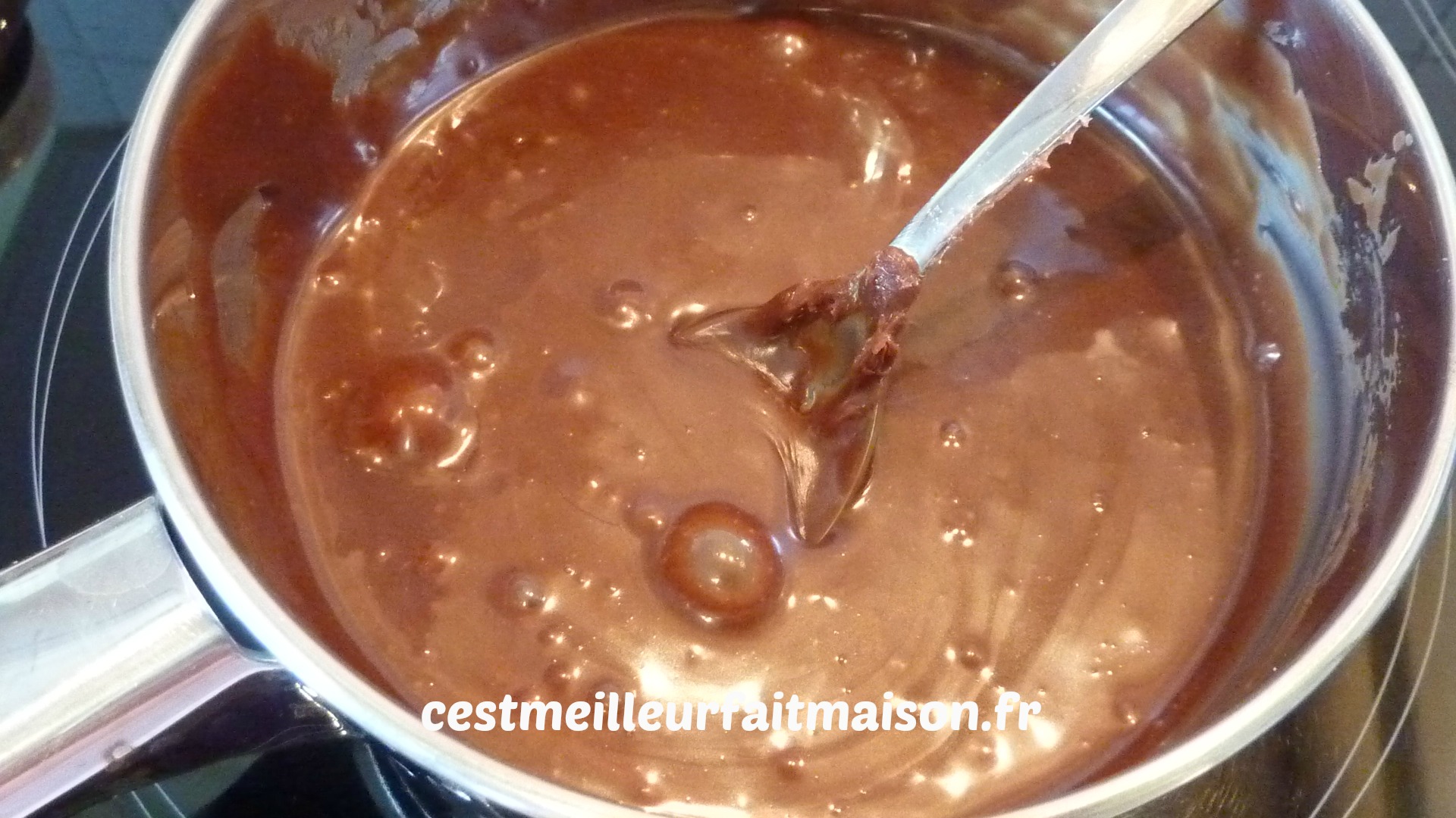 3- J’ai choisi de tartiner la moitié de mes gaufres avec une pâte à tartiner maison (recette ici). J’ai fait fondre la pâte dans une casserole et j’ai tartiné les gaufres au pinceau. (Attention aux doigts, c’est chaud!)
