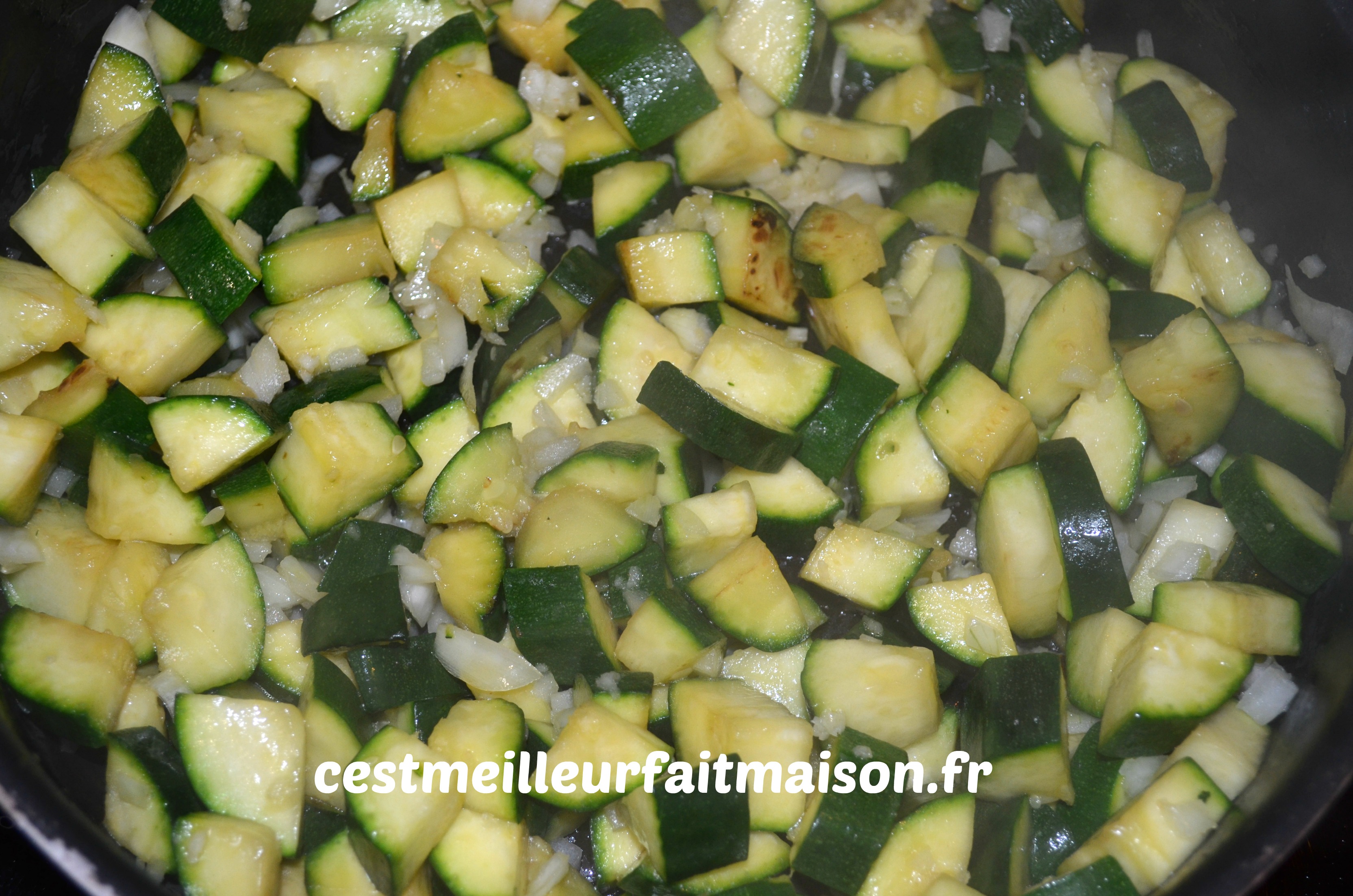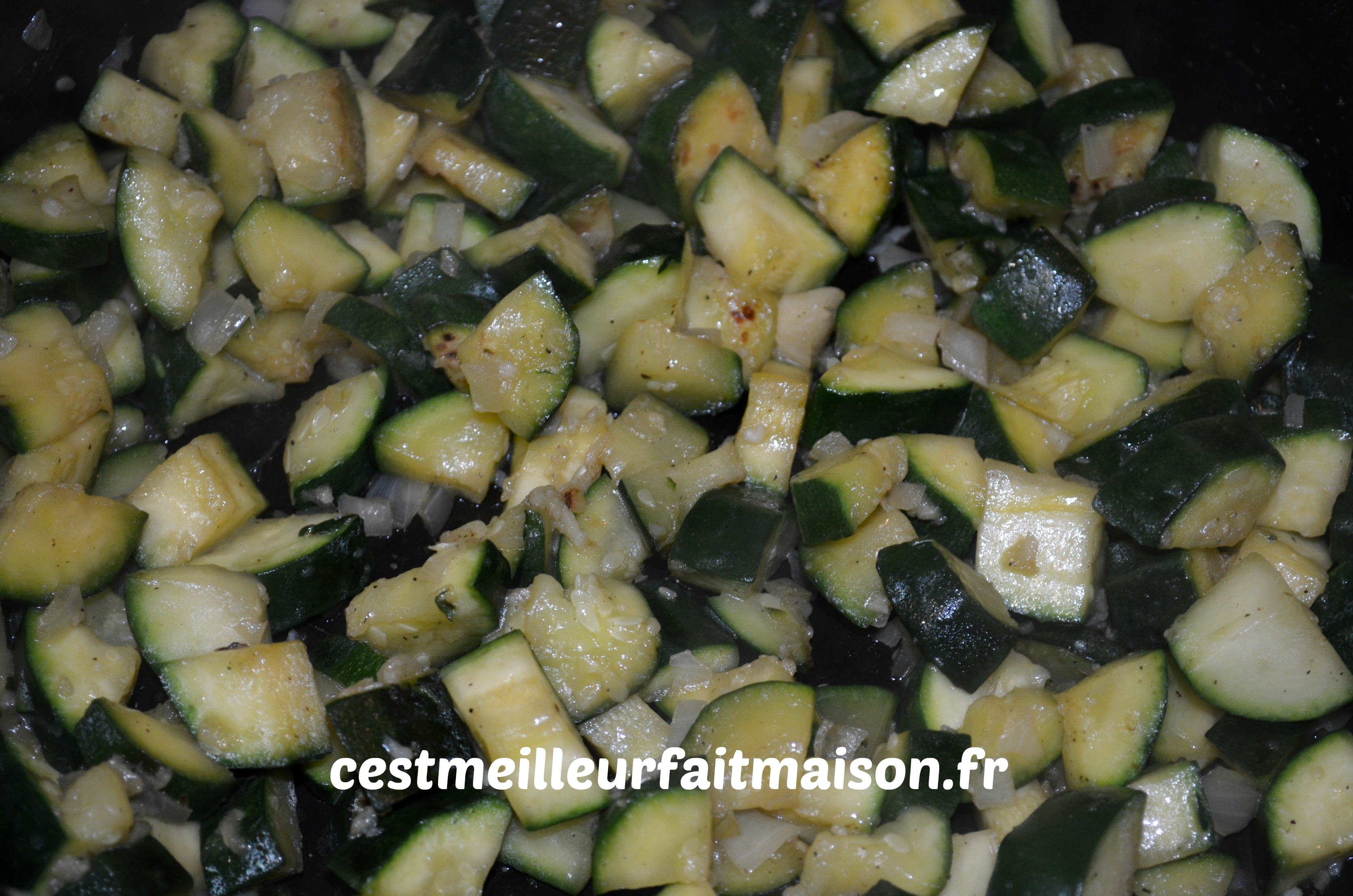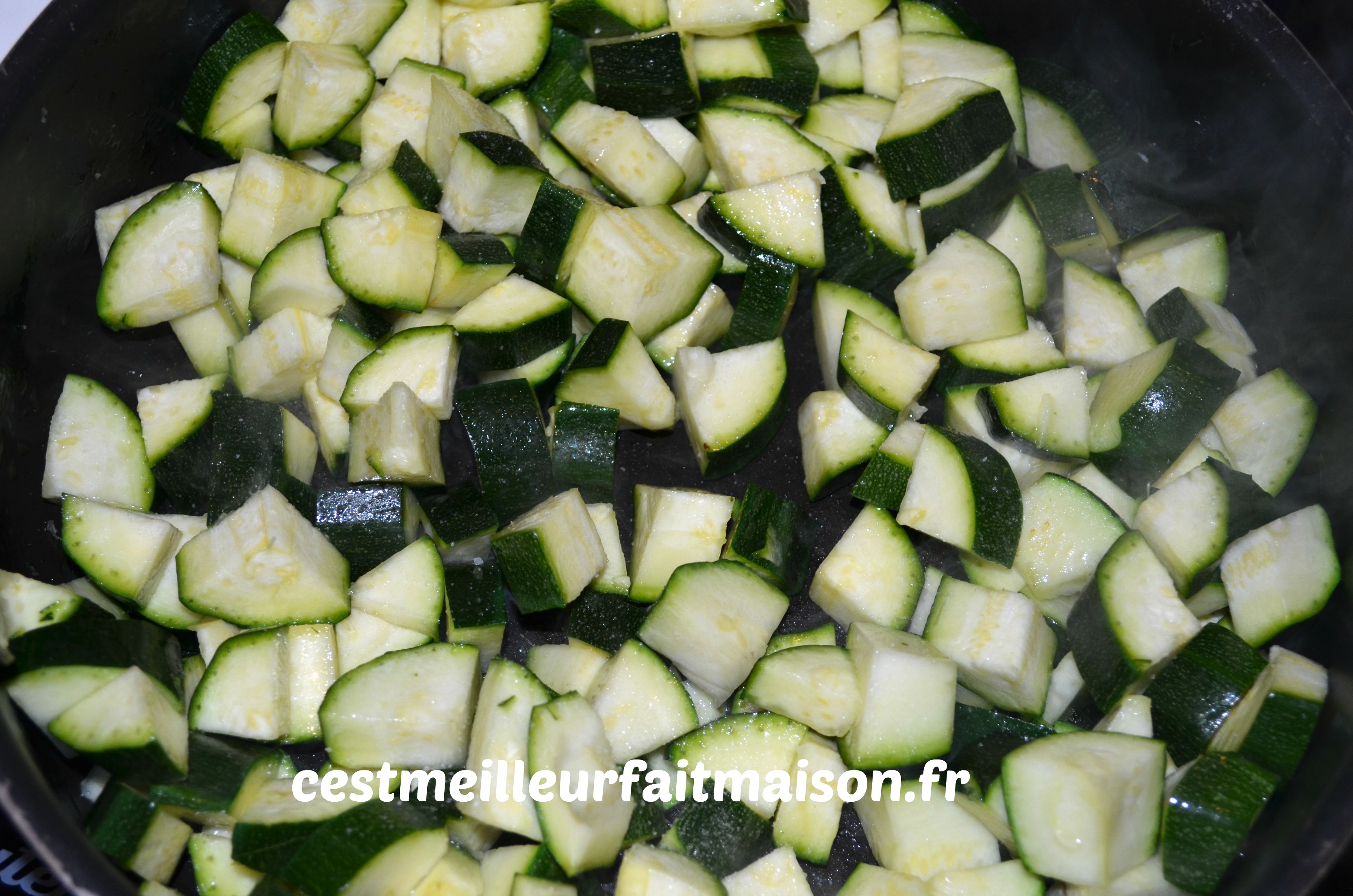 1- Couper les courgettes en cubes. Les faire revenir dans l’huile d’olive. Saler et poivrer.