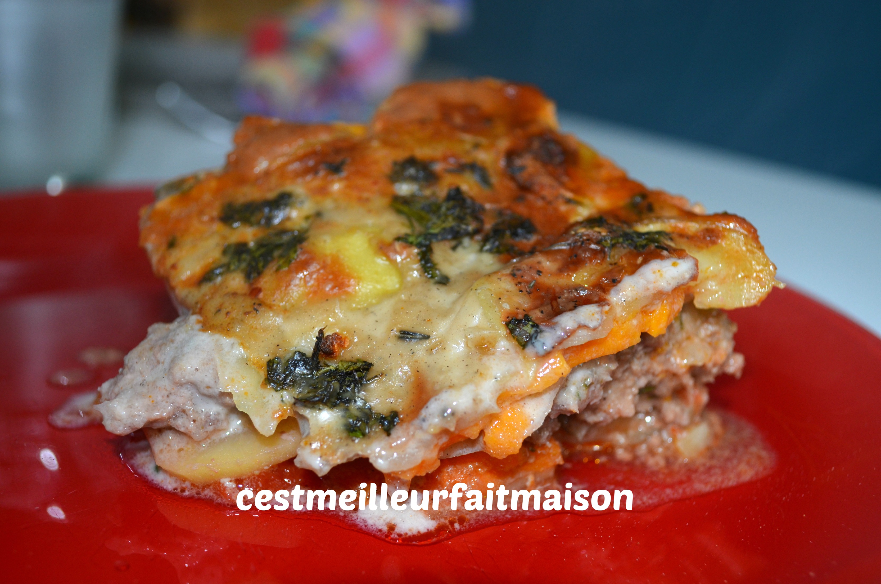 Je ne me suis pas trop cassée la tête pour donner un nom à ce gratin. C’est ma cousine qui m’a donnée cette recette alors, à la maison, on parle de ce gratin délicieux en le nommant Le Gratin de Laure 🙂 . Comme Laure ne note rien, au moins, elle pourra refaire ce plat 😉 . J’ai copié cette recette quand c’était encore dans sa tête, elle l’avait fait la veille. Bien entendu, elle n’a pas été précise du tout sur les quantités car elle cuisine “au pif” 🙂 . Les quantités sont les miennes après deux essais.