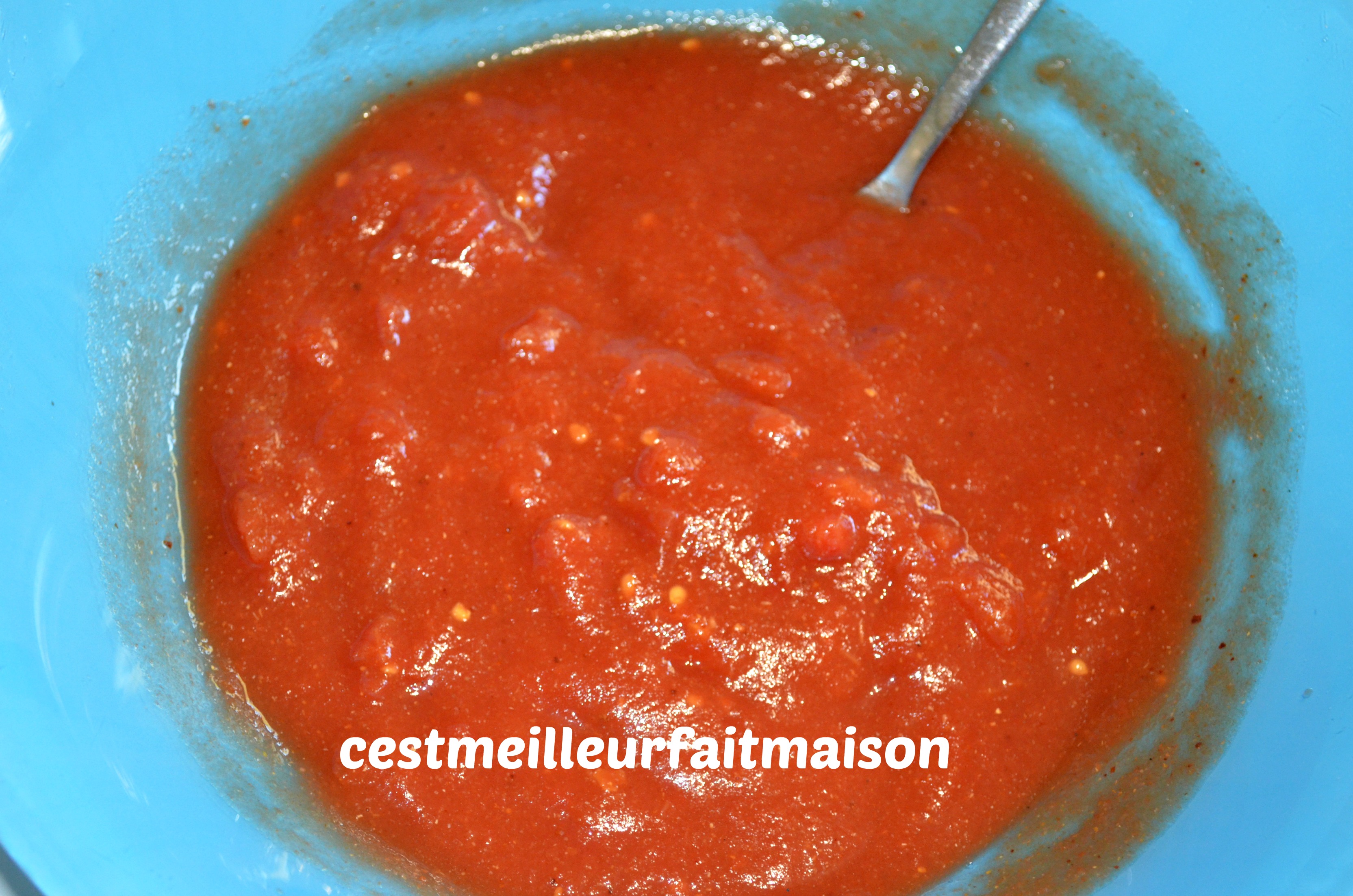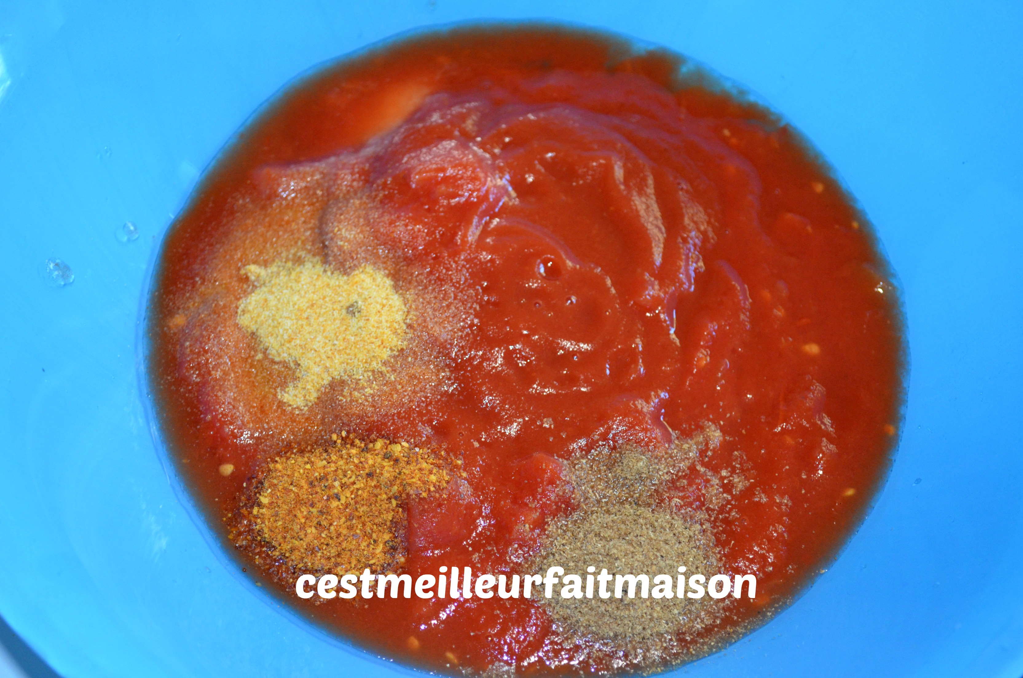3- Dans un récipient, mélanger le coulis, la boite de tomates concassées, l’ail, le sel, le piment d’Espelette et la coriandre en poudre.