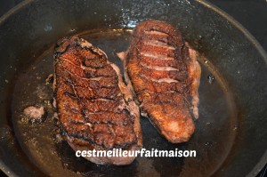2- Retourner les magrets et les dorer rapidement à feu vif. Les retirer de la poêle et découper des tranches de 1 cm. Réserver avec le jus qui s’écoule.