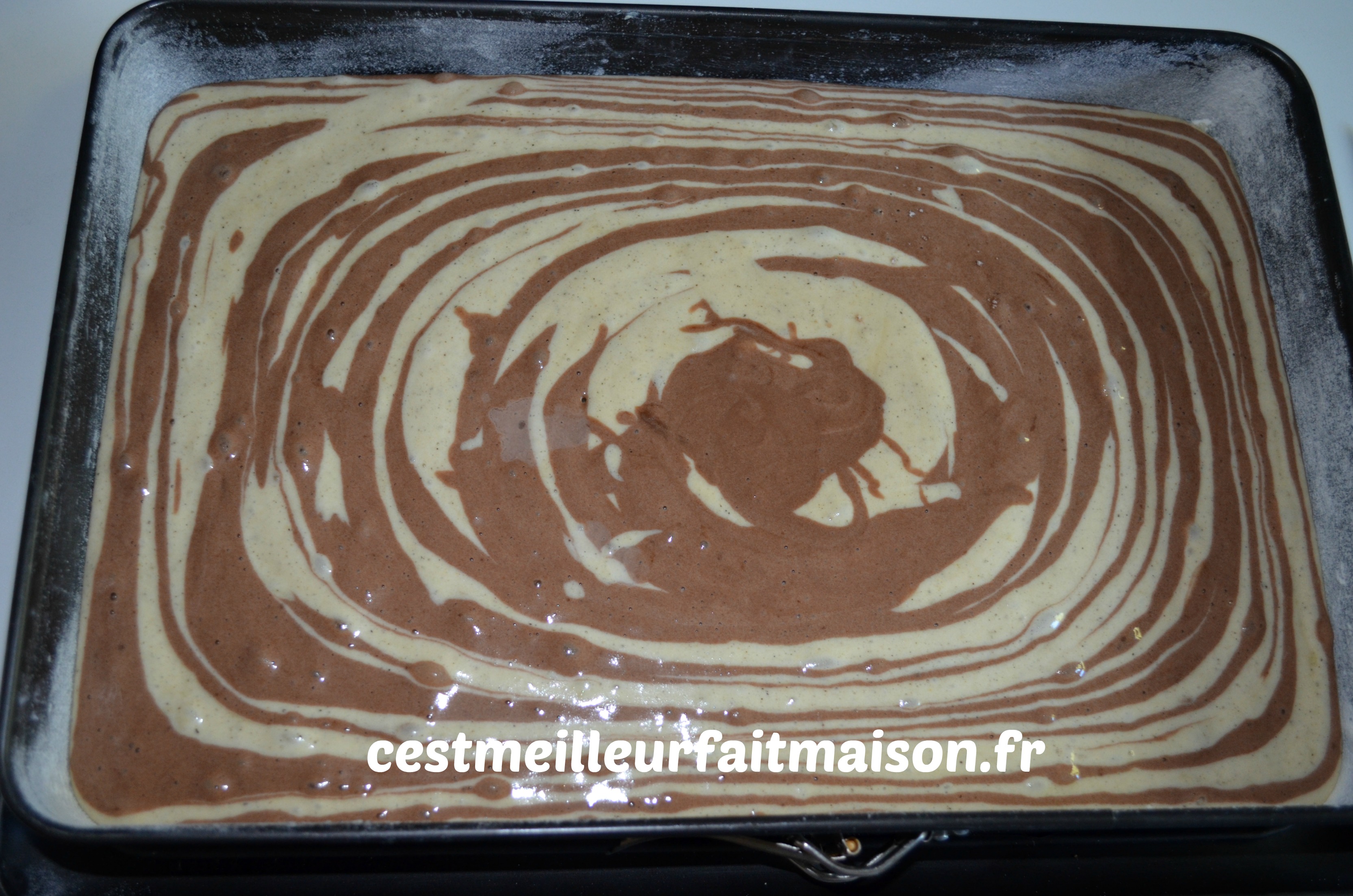 J’ai découvert ce gâteau chez Piroulie mais je ne me suis décidée à le faire qu’après sa publication chez C’est ma fournée. J’ai profité des trucs et astuces dans les commentaires. Je fais donc deux pâtes distinctes, une blanche à la vanille et une marron au chocolat. Dans celle au chocolat, je déduis le poids du cacao de celui de la farine. De cette façon, mes deux pâtes ont la même texture.