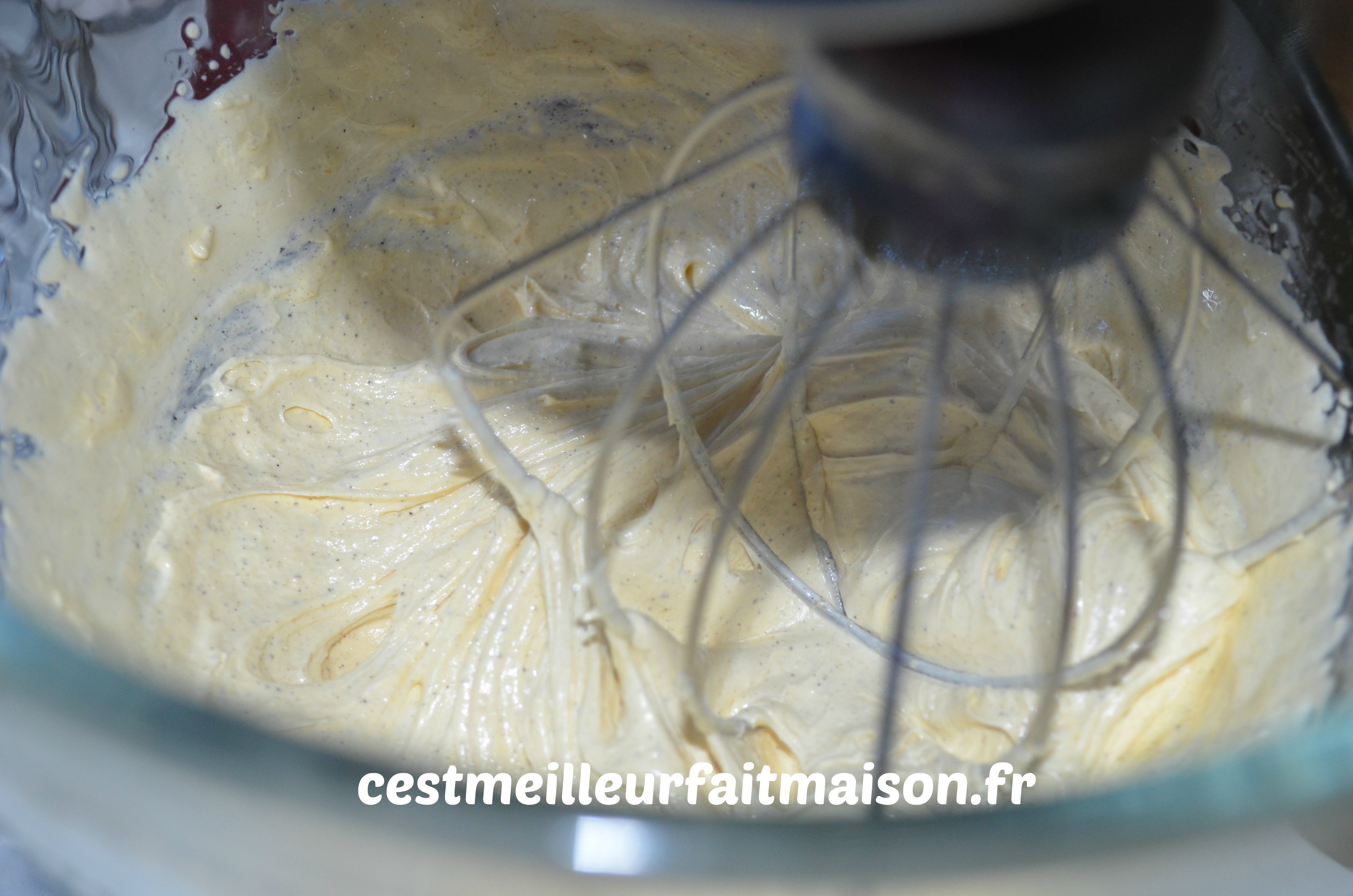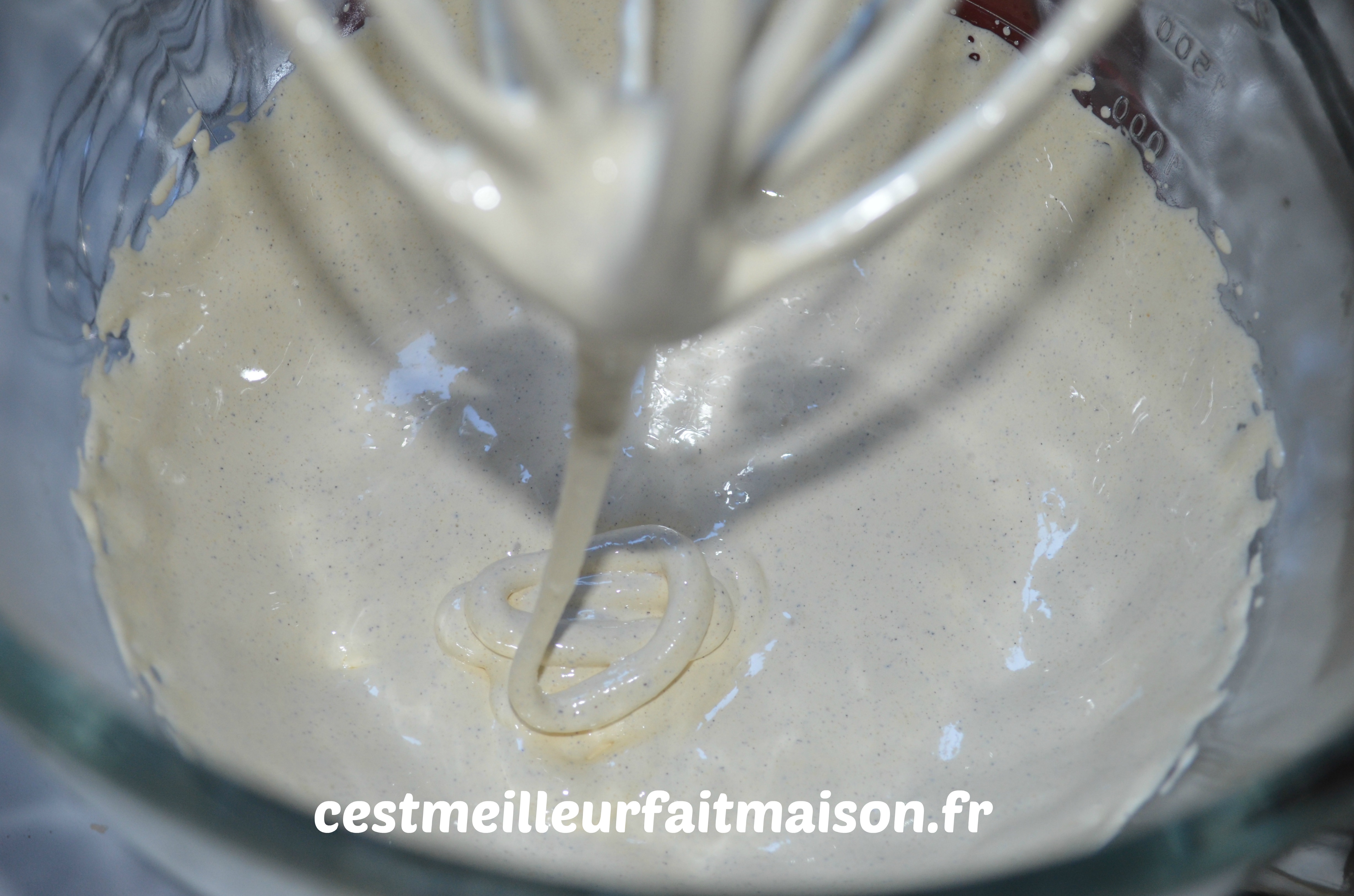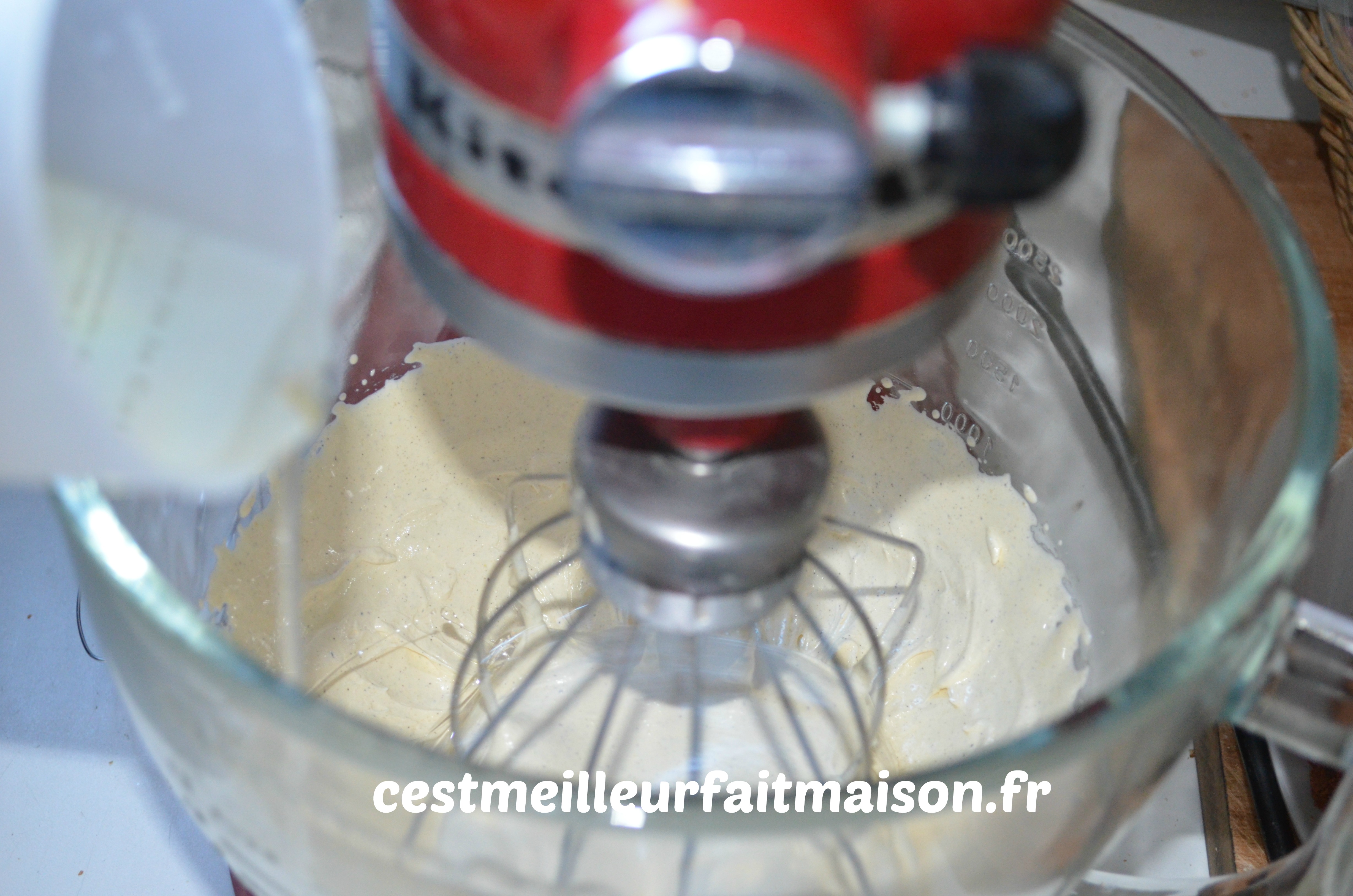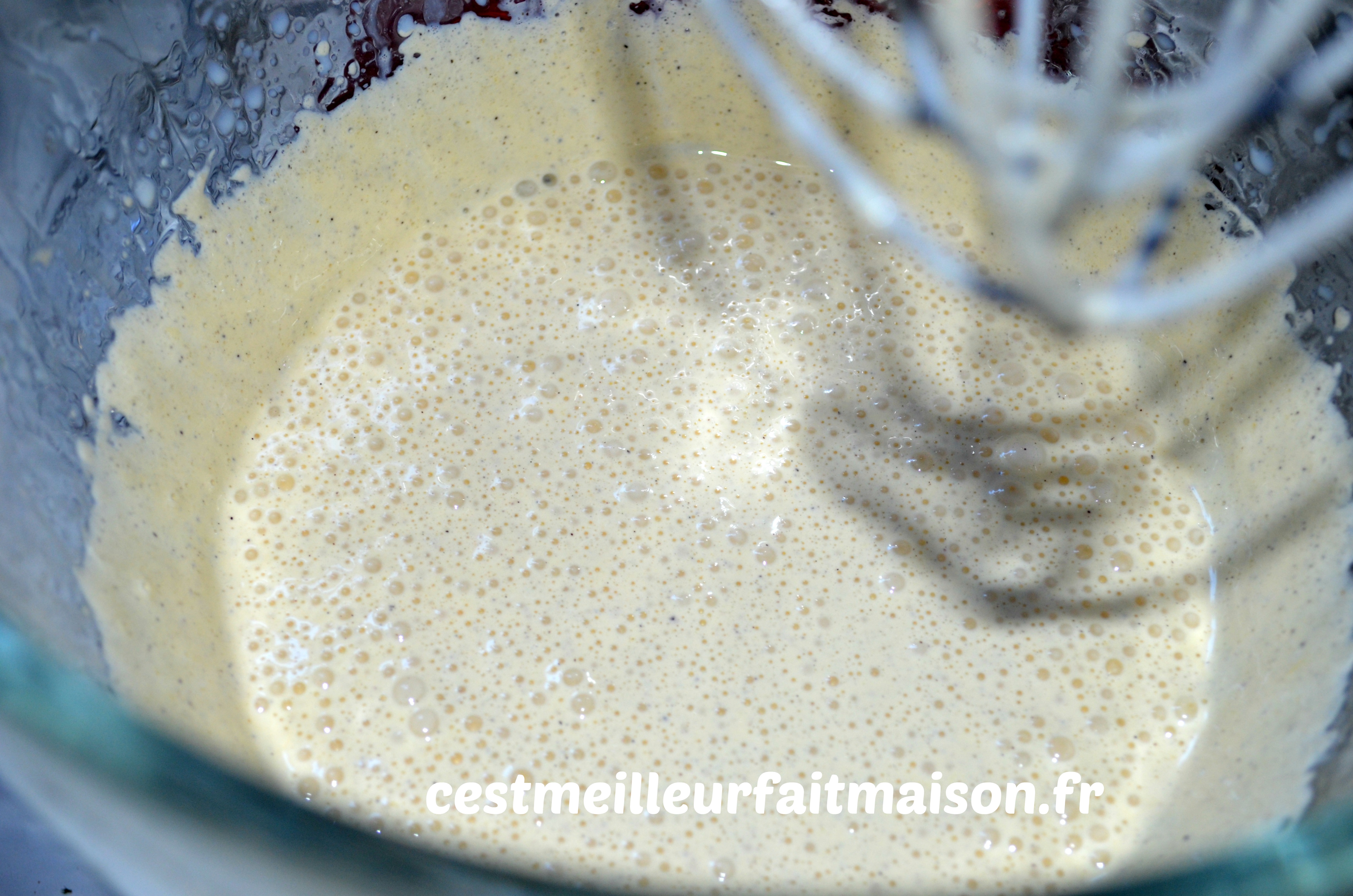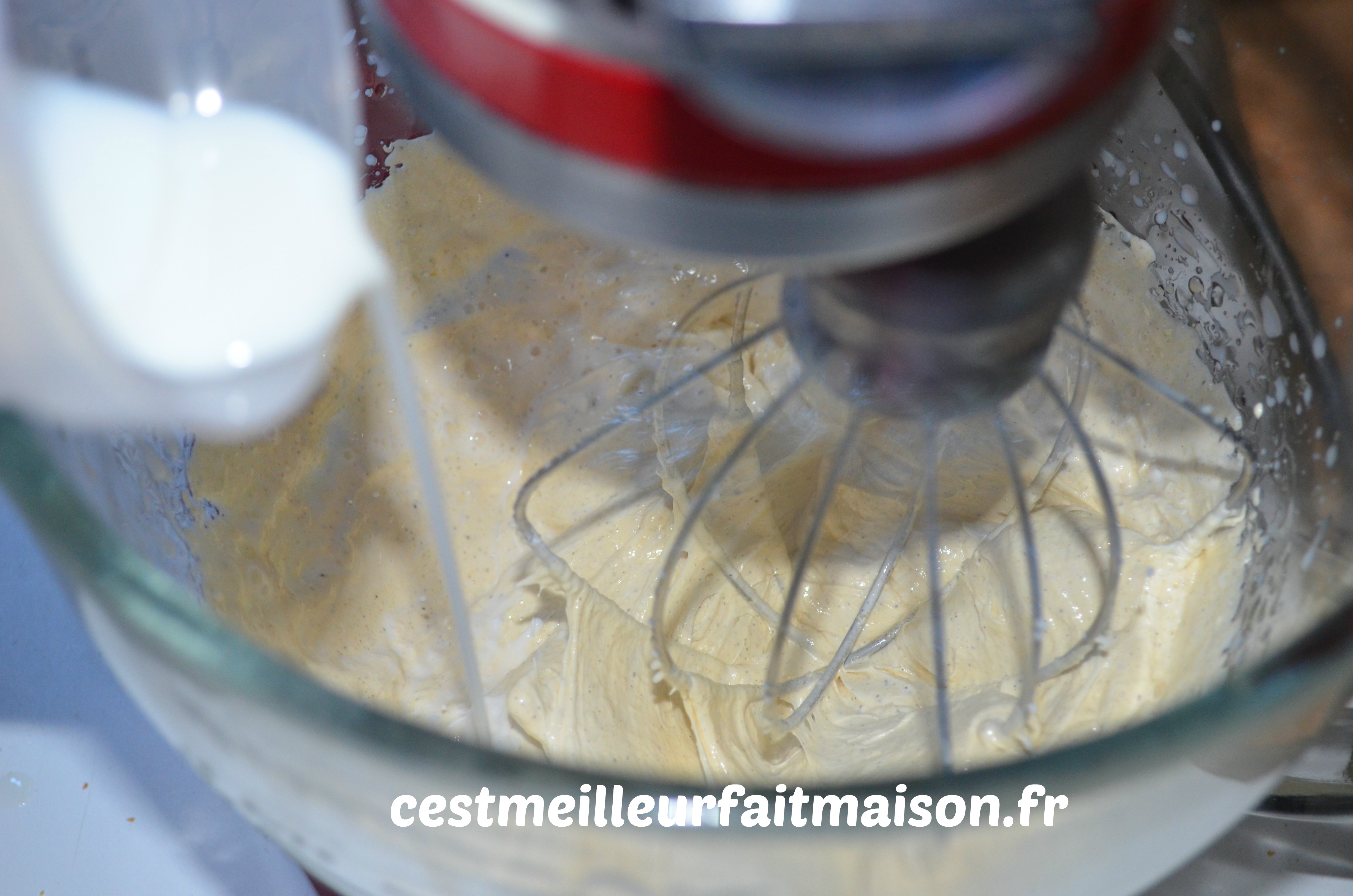 3- Toujours en fouettant, ajouter le lait.