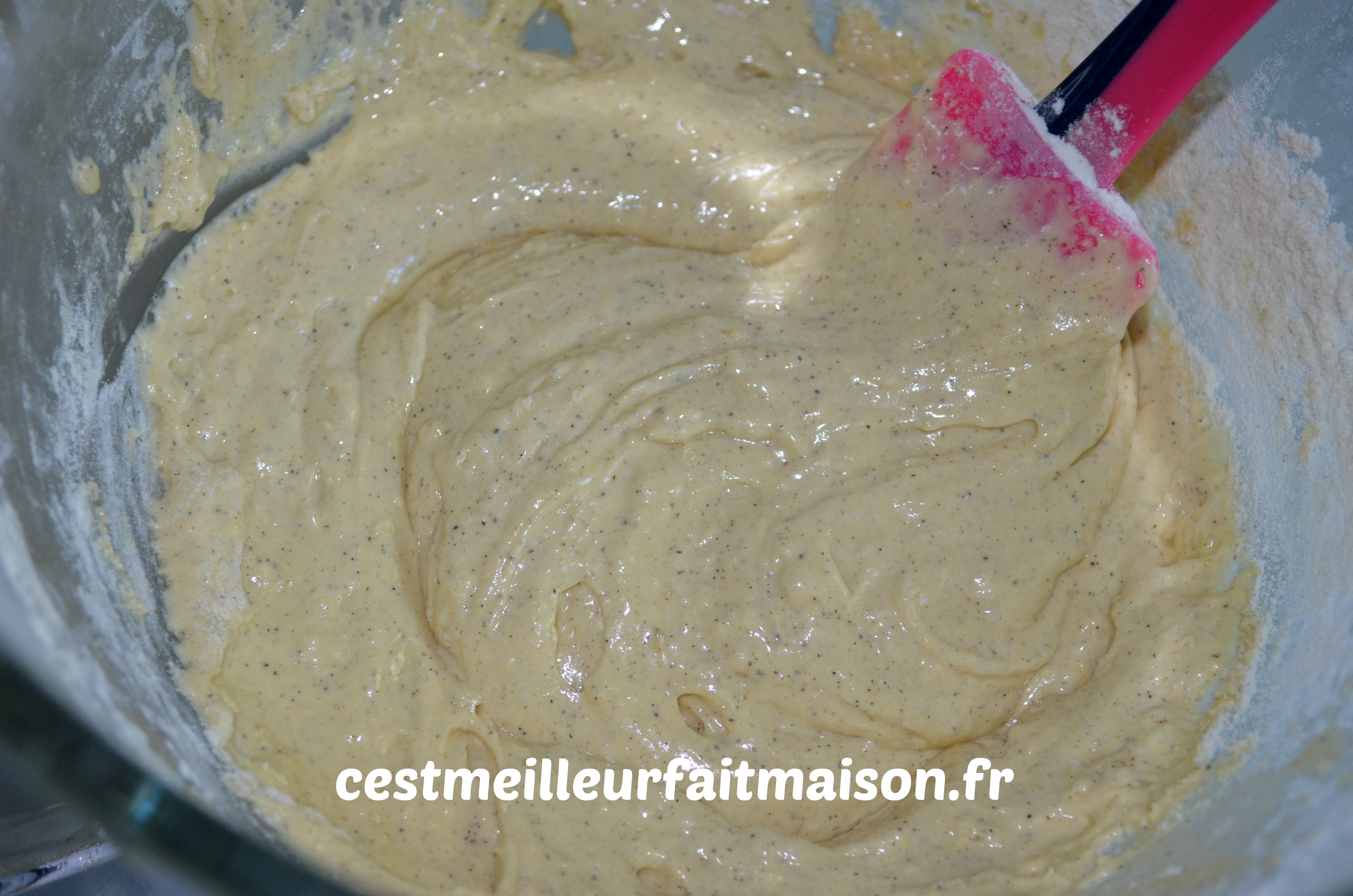 4- Verser la farine tamisée et la levure. Mélanger à la maryse.