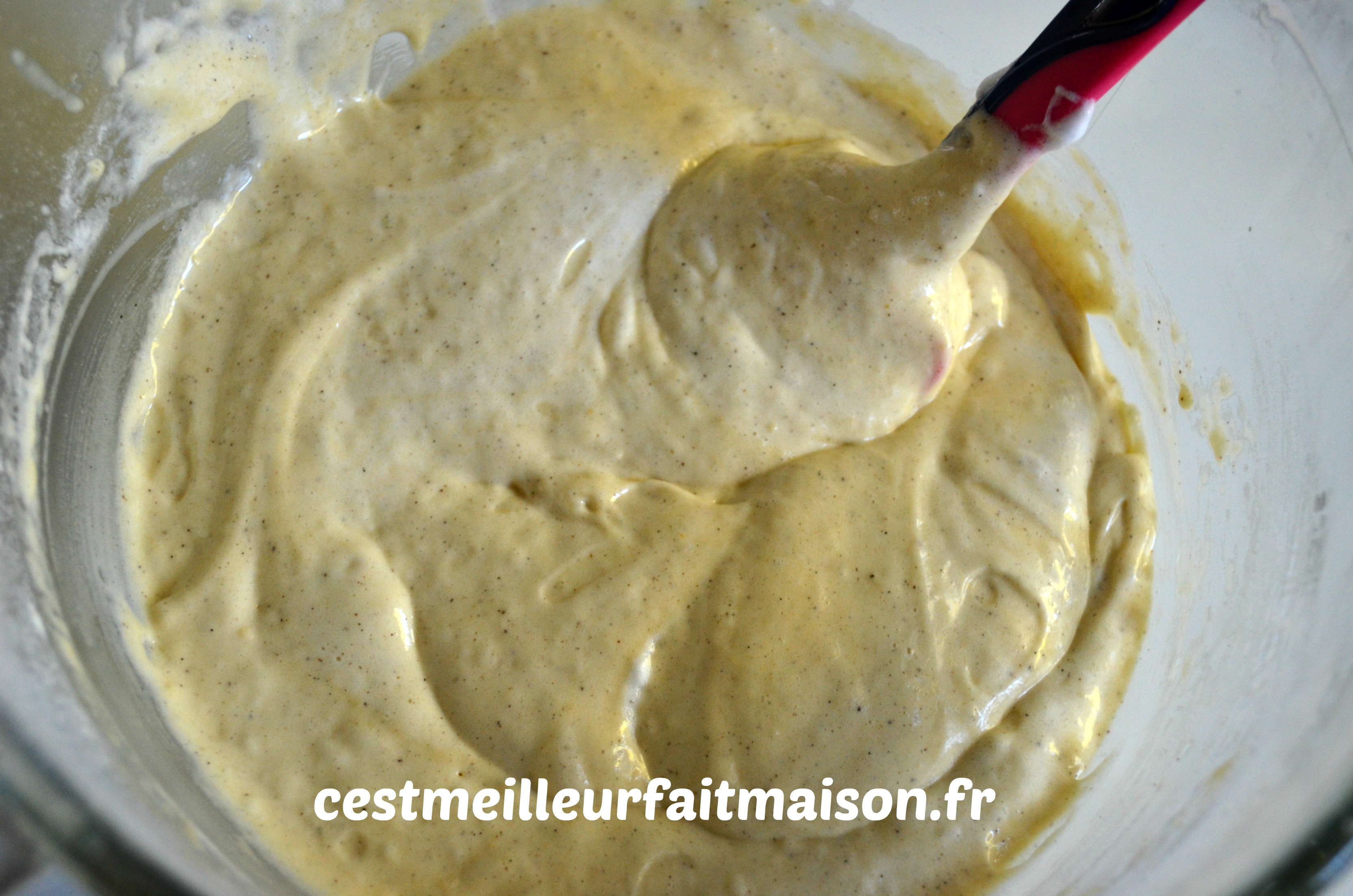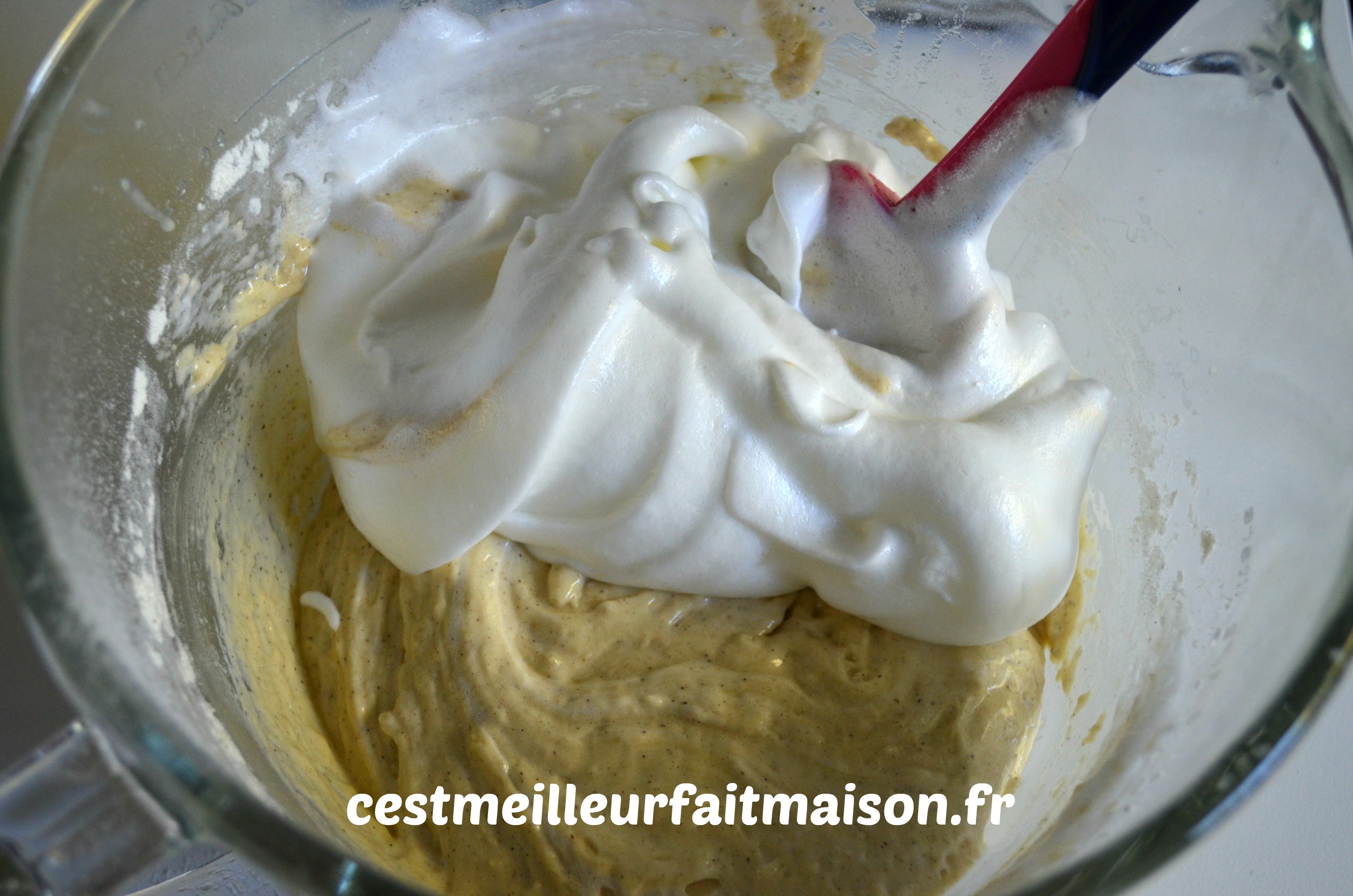 6- Verser les blancs dans la préparation à la vanille et mélanger délicatement. Réserver ensuite cette pâte dans un récipient.