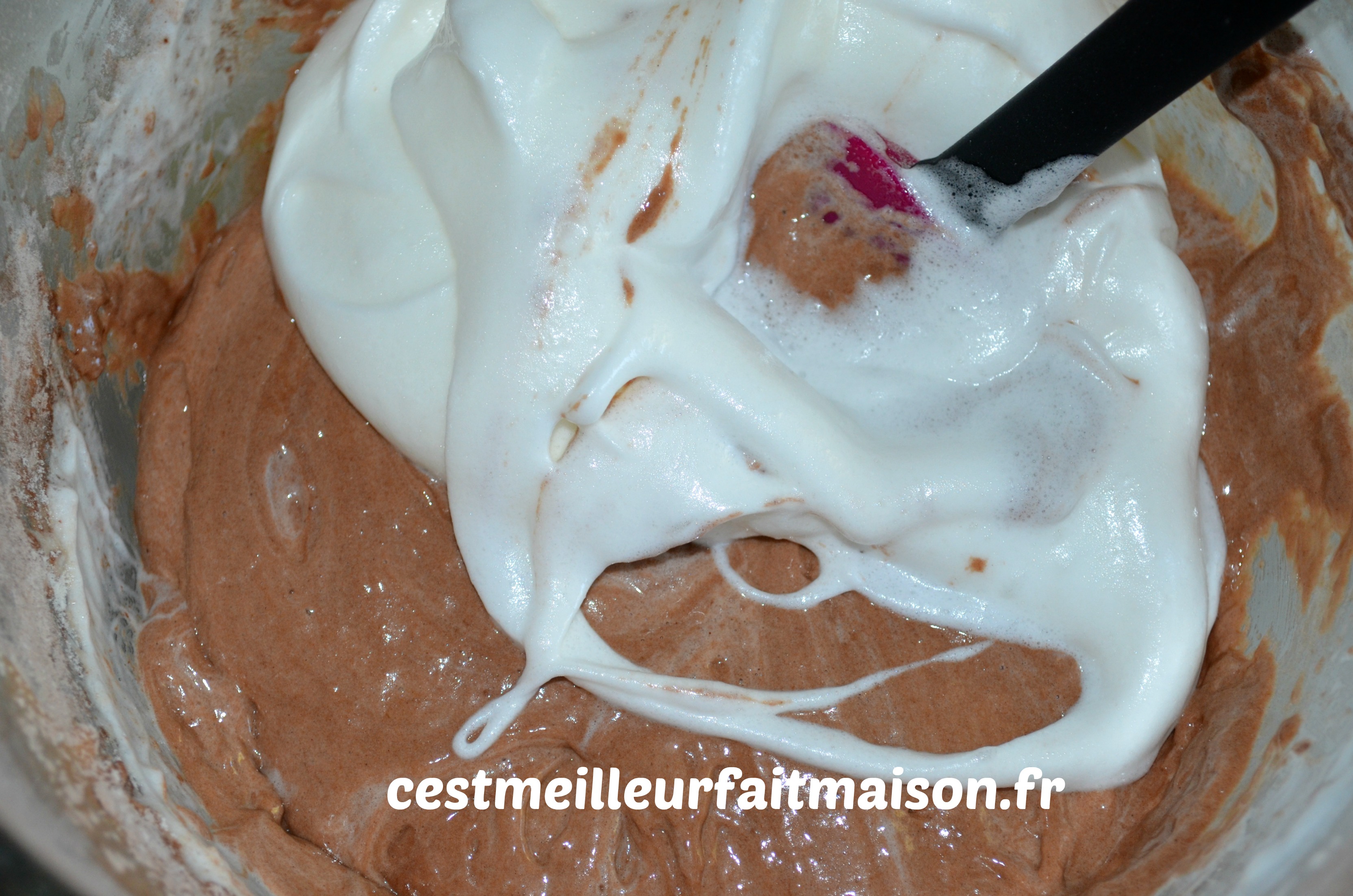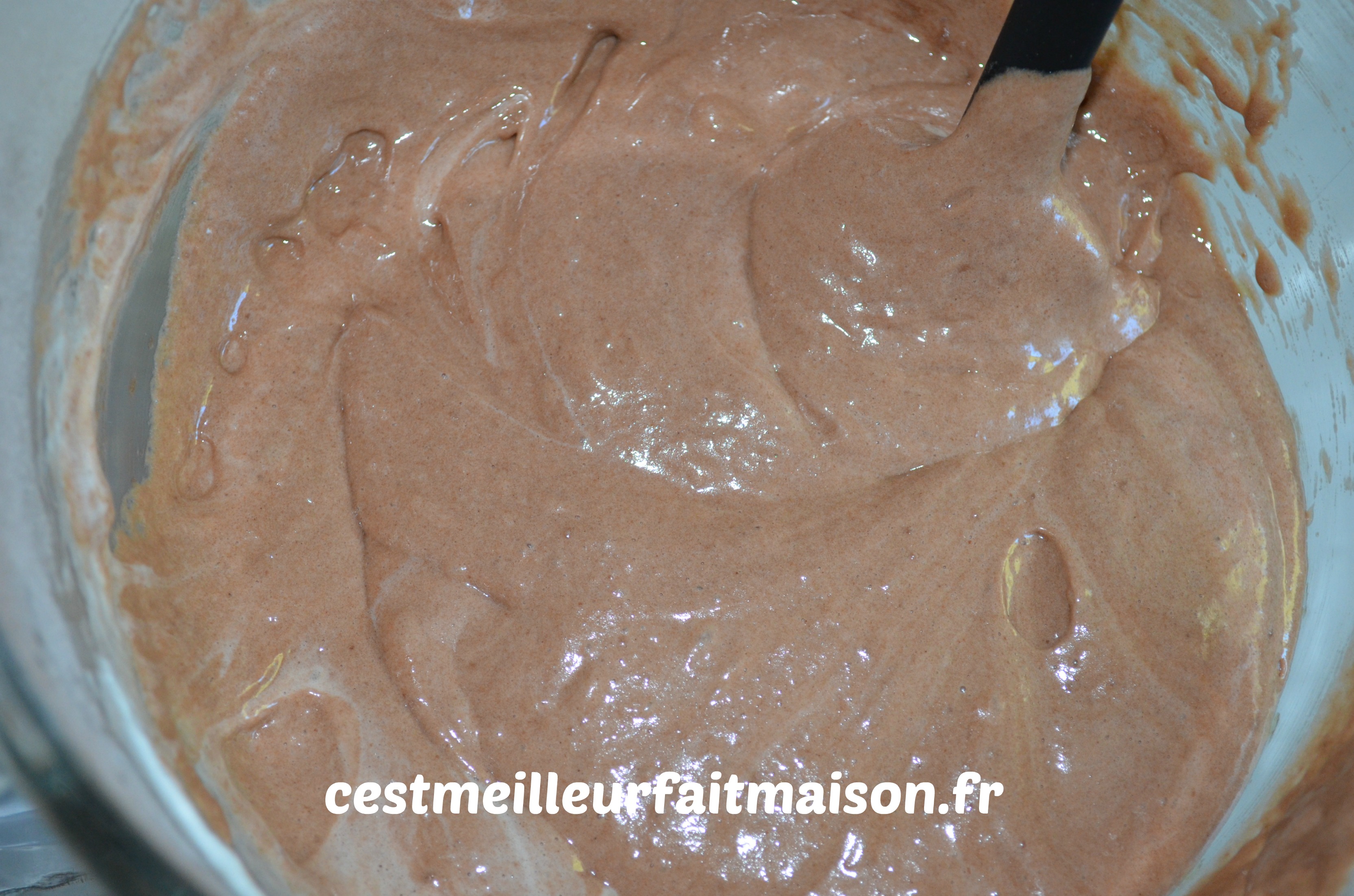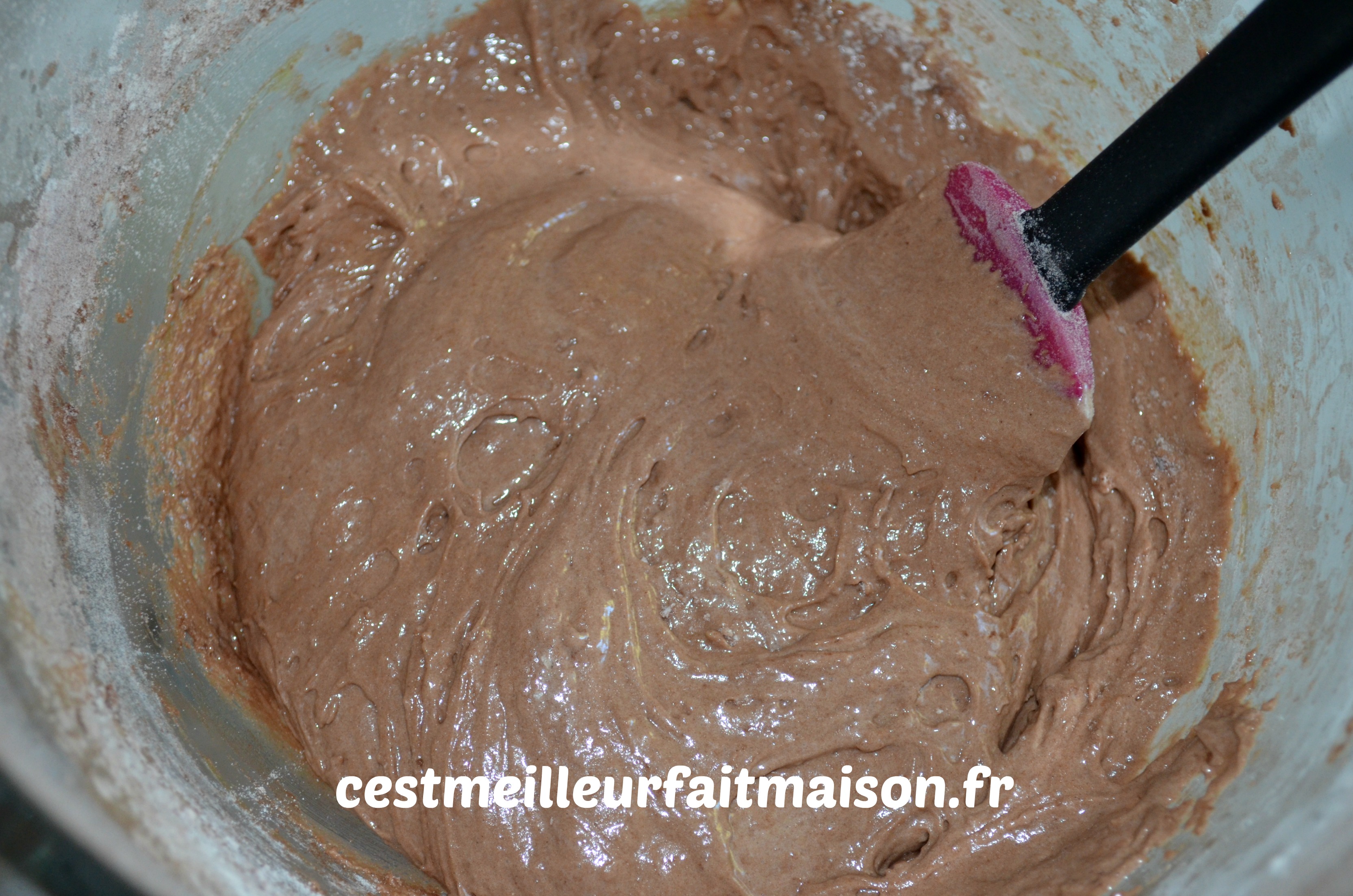 Recommencer les étapes 1 à 6 pour la pâte au chocolat. Attention, à l’étape 4, on tamise la farine, le cacao et la levure.