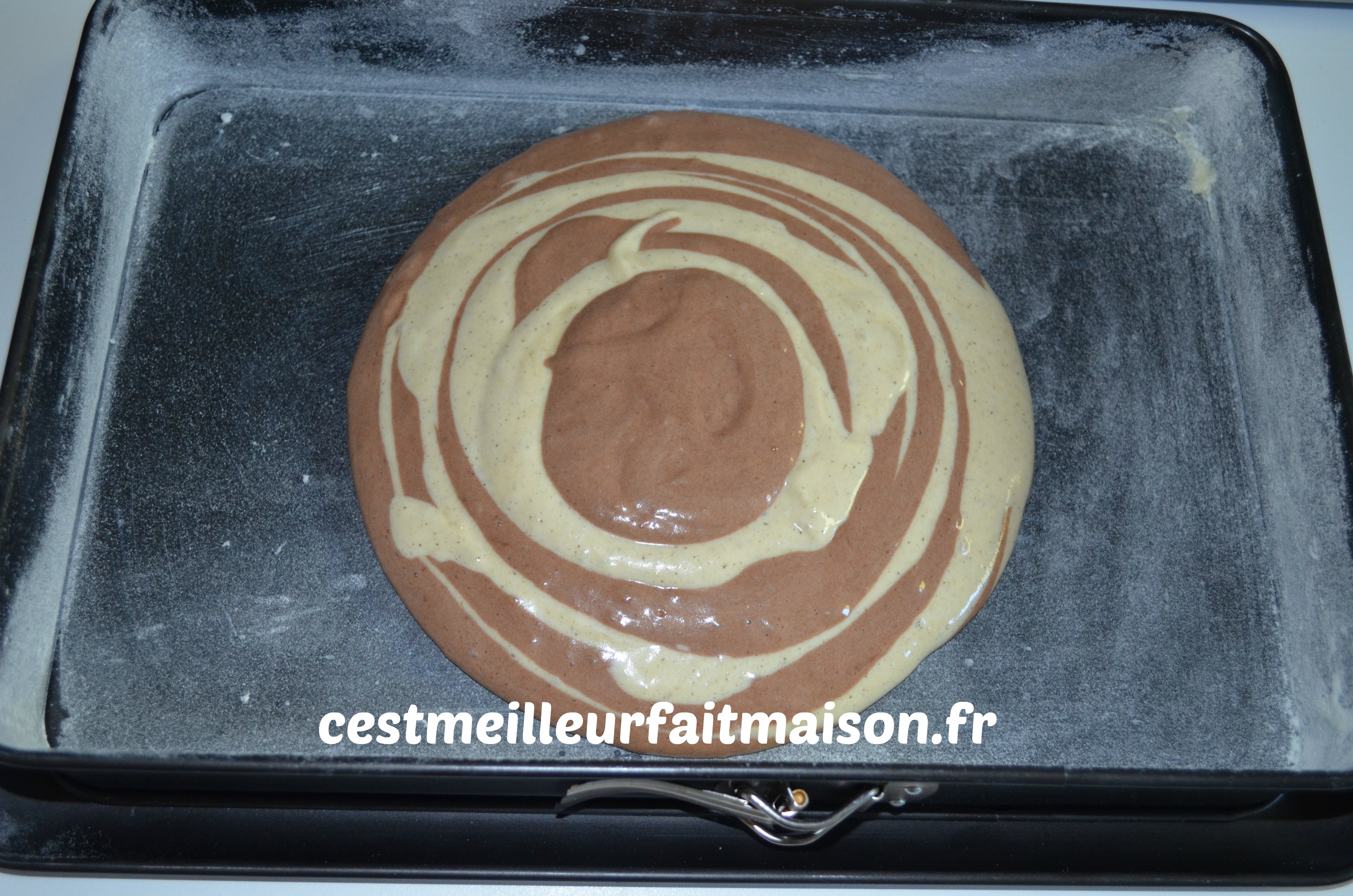9- Verser la pâte à la vanille et la pâte au chocolat en alternant les couleurs. Si vous êtes très patients vous pouvez le faire avec une cuillère à soupe. Mes pâtes étaient dans des récipients avec becs verseurs donc j’ai versé un peu de pâte de chaque couleur de façon à obtenir des zébrures. Il faut commencer au centre du moule et verser la pâte au fur et à mesure toujours au centre de la couleur précédente.