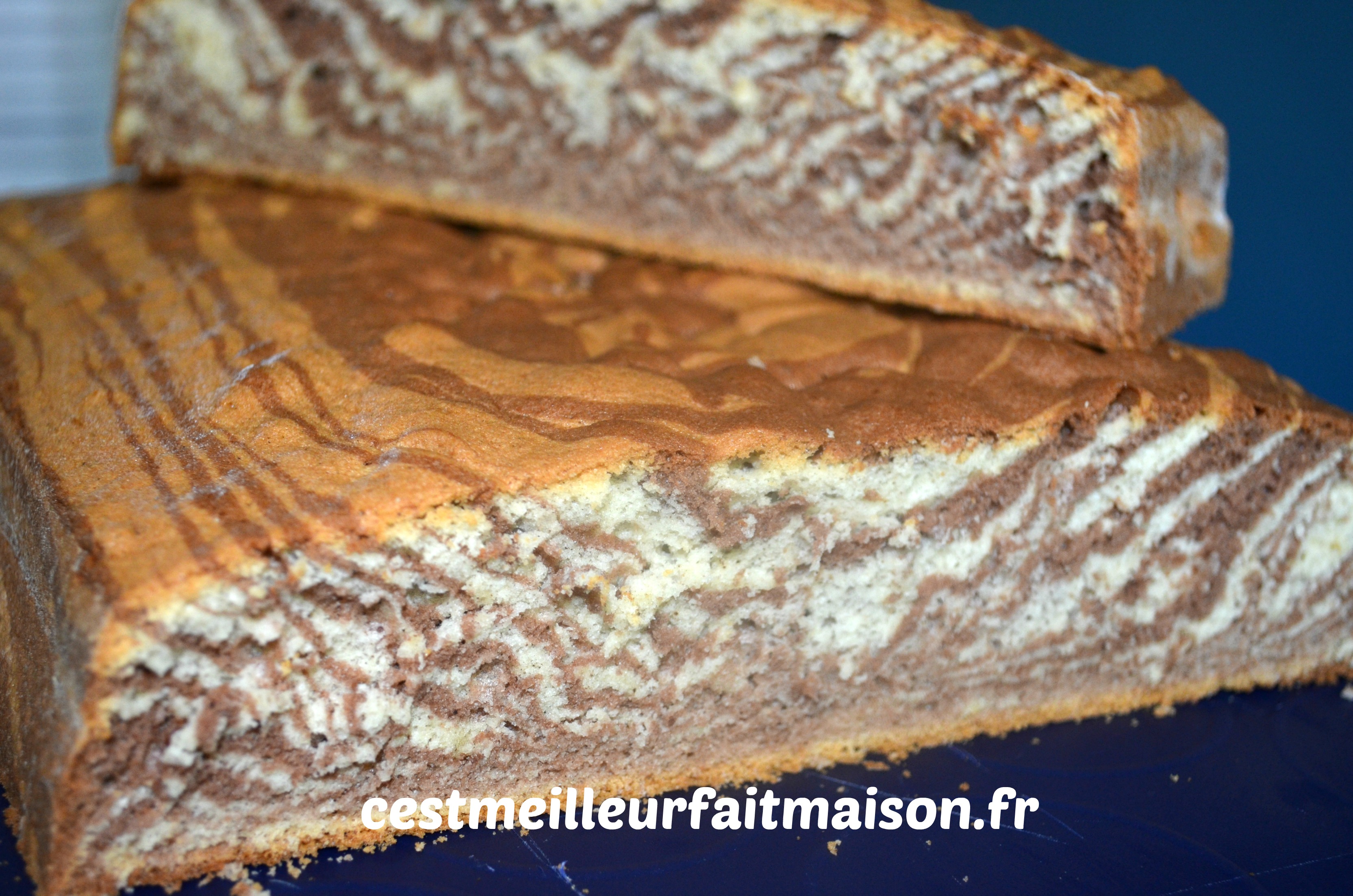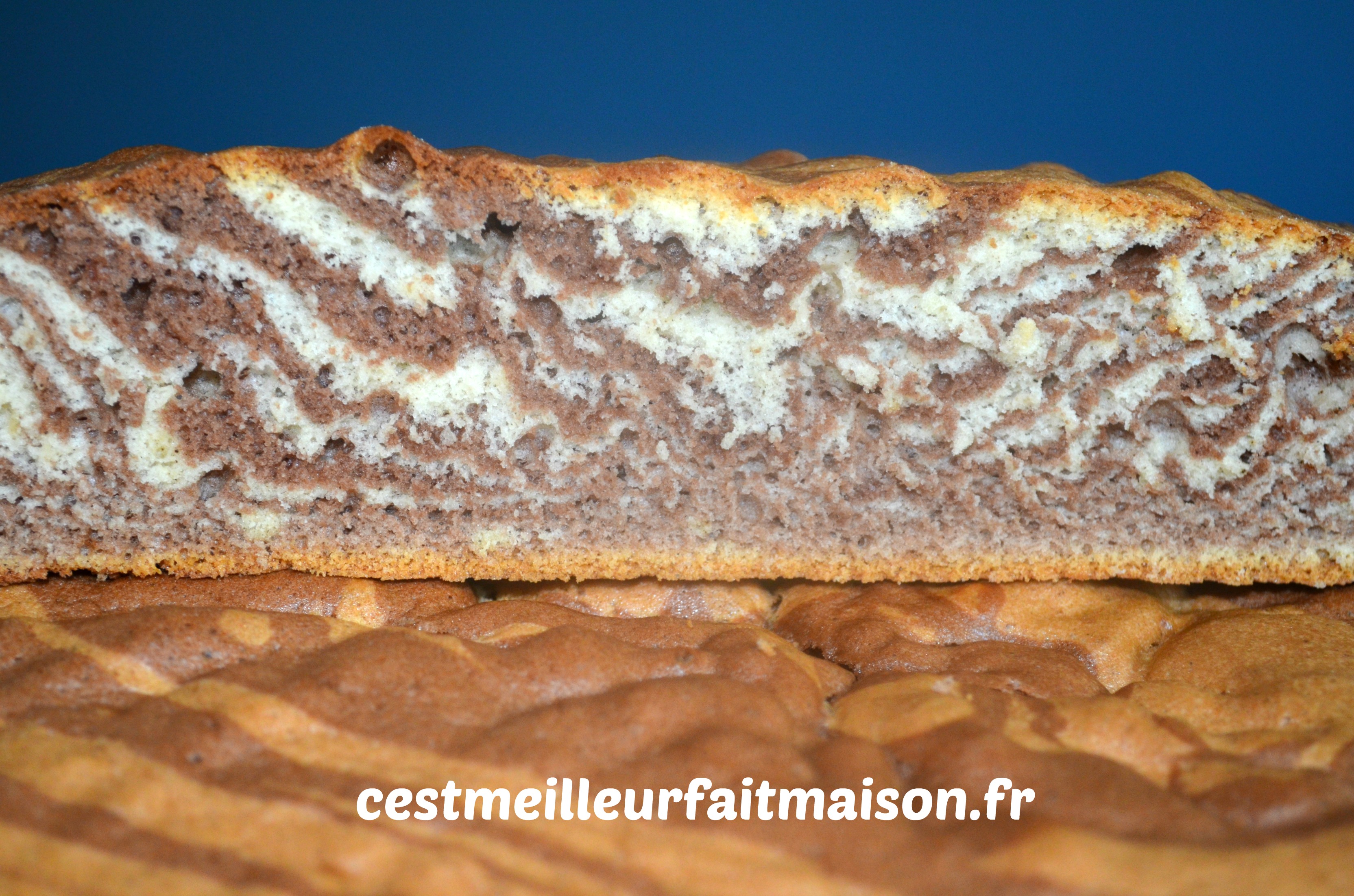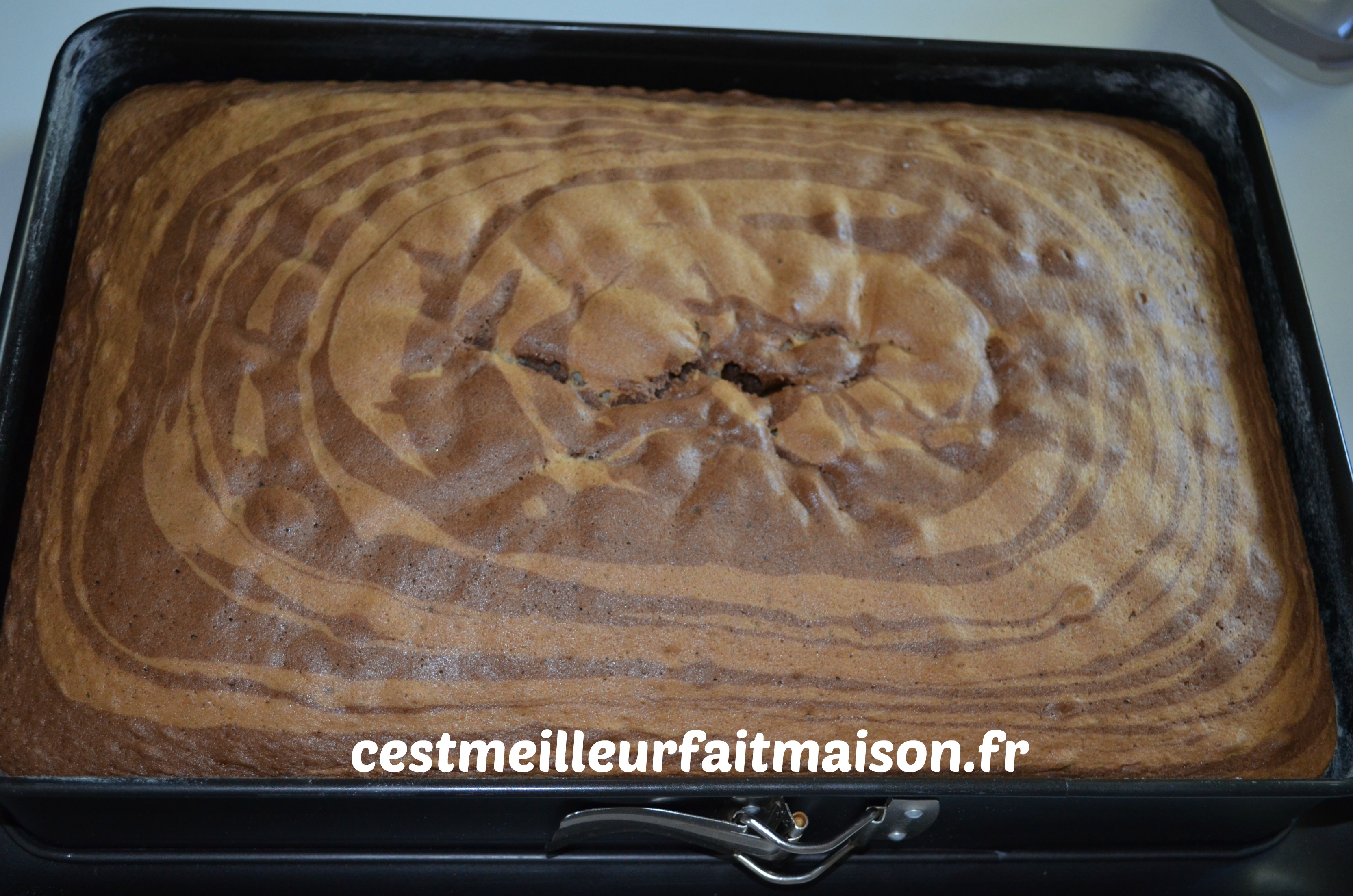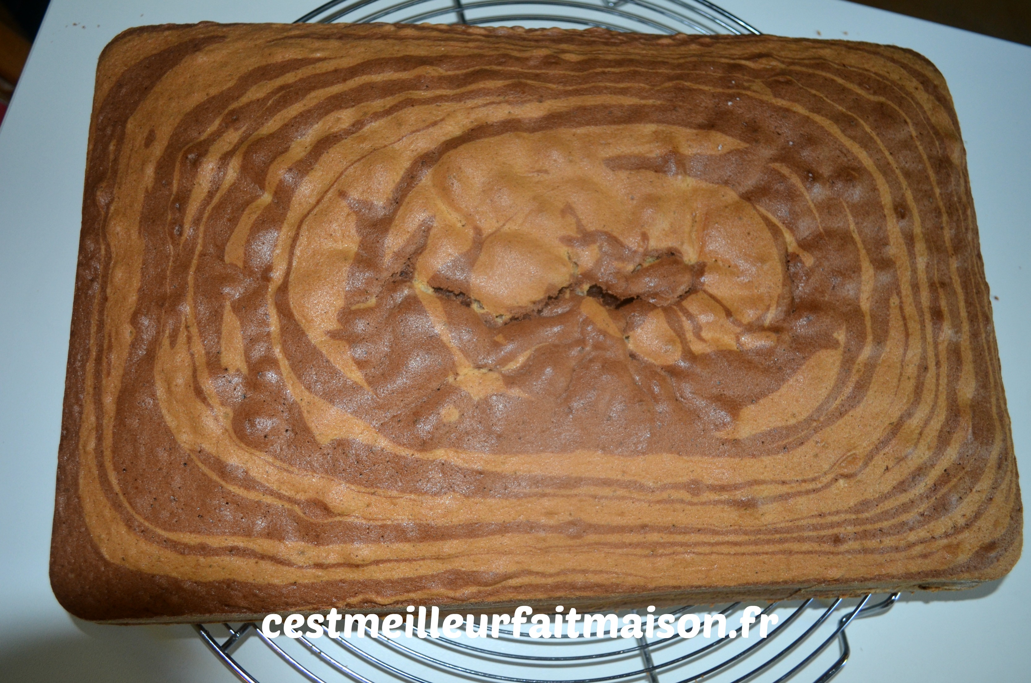 J’ai découvert ce gâteau chez Piroulie mais je ne me suis décidée à le faire qu’après sa publication chez C’est ma fournée. J’ai profité des trucs et astuces dans les commentaires. Je fais donc deux pâtes distinctes, une blanche à la vanille et une marron au chocolat. Dans celle au chocolat, je déduis le poids du cacao de celui de la farine. De cette façon, mes deux pâtes ont la même texture.