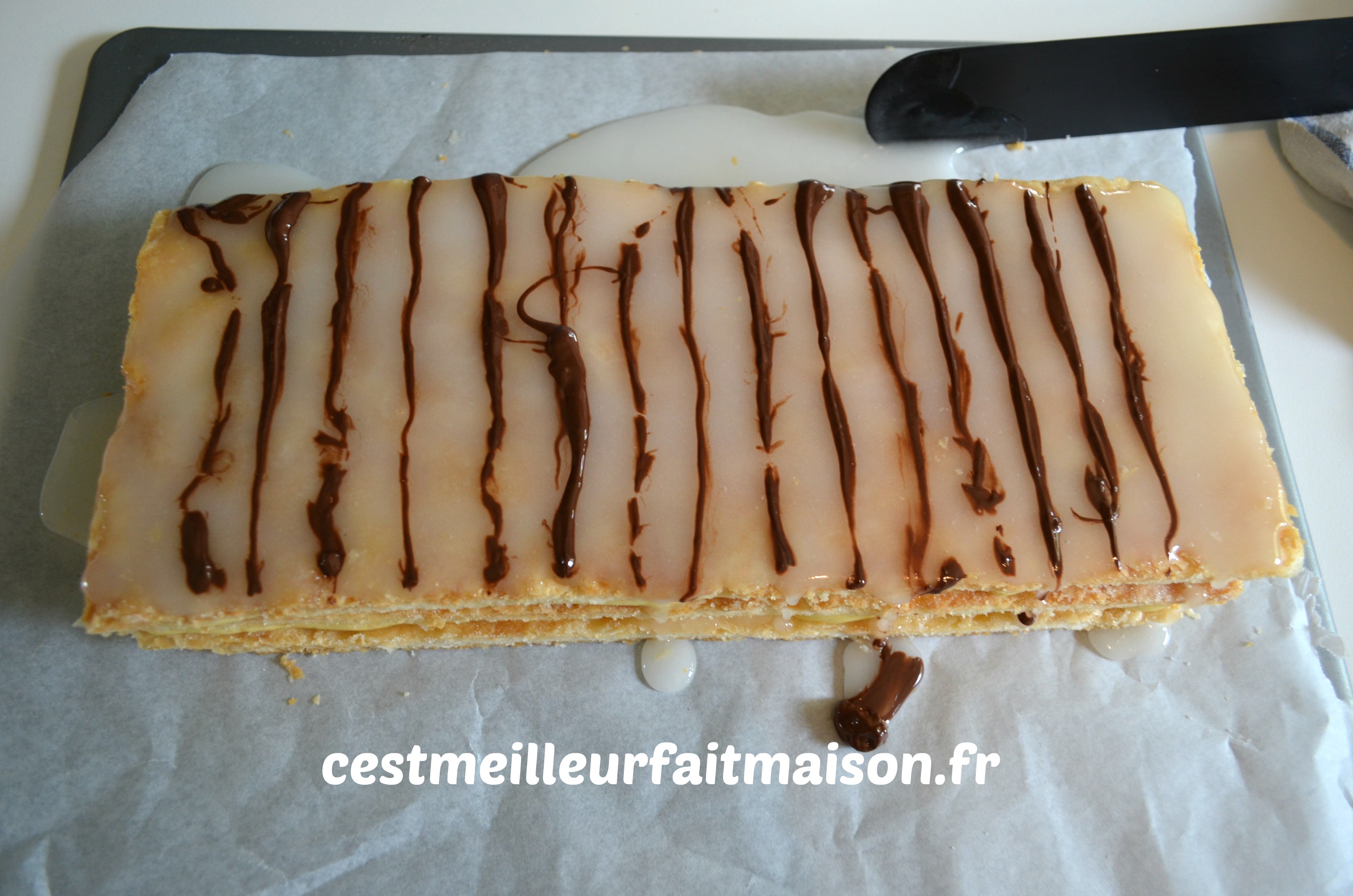 8- Faire fondre le chocolat au micro onde ou au bain marie. Je n’ai pas réussi à faire un cornet avec du papier cuisson pour le verser sur le millefeuille. J’ai donc fait les traits de chocolat avec une petite cuillère. Du coup, ce n’est pas très beau.