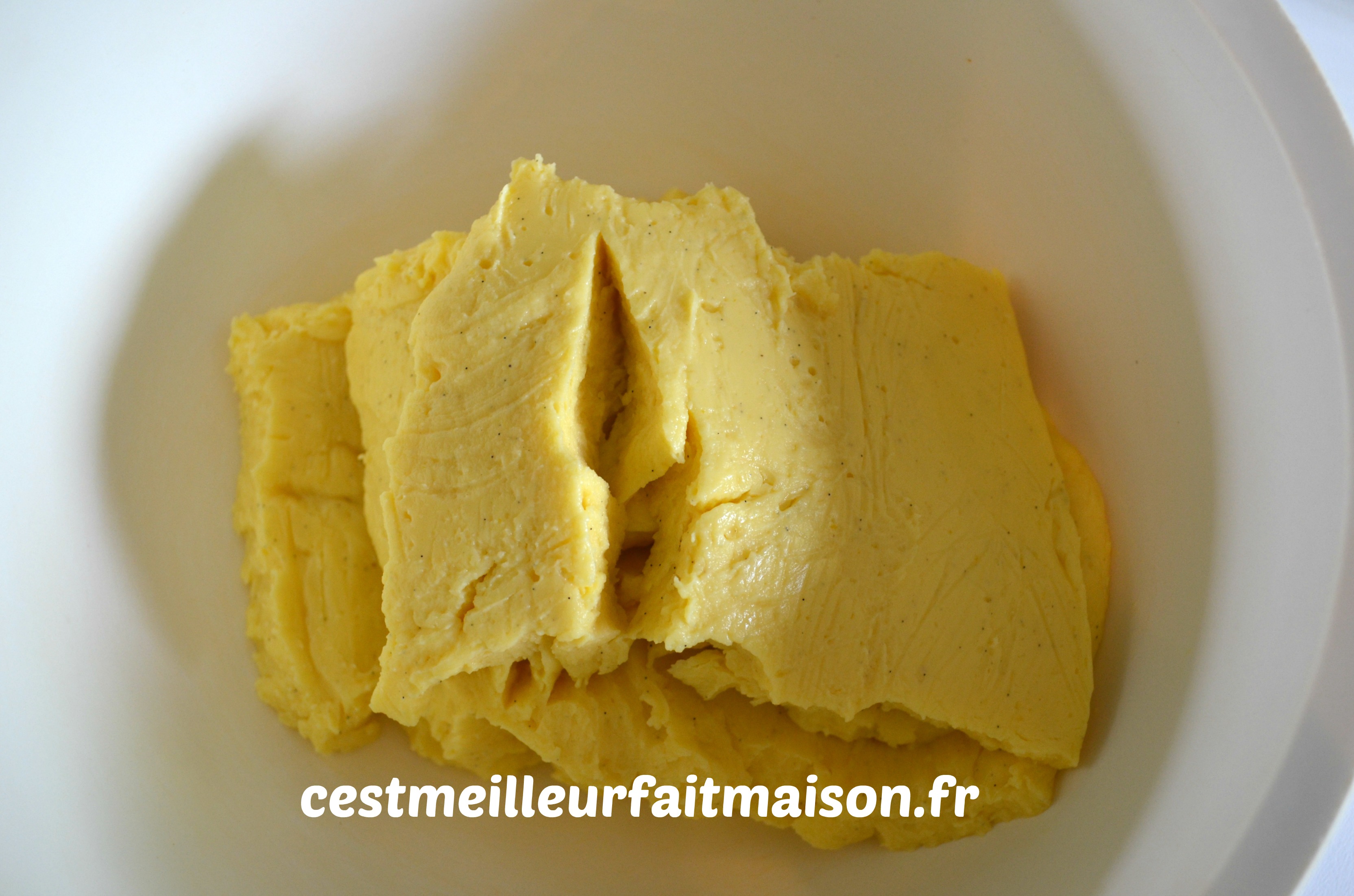 Remettre dans la casserole et mélanger sans cesse jusqu’à ce que la crème épaississe. Mettre le beurre dans la crème chaude et remuer.