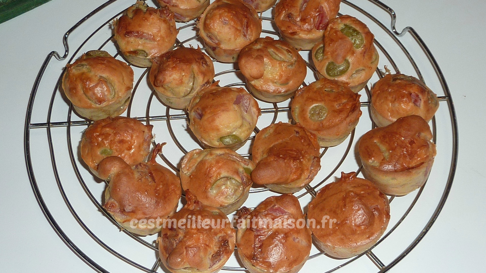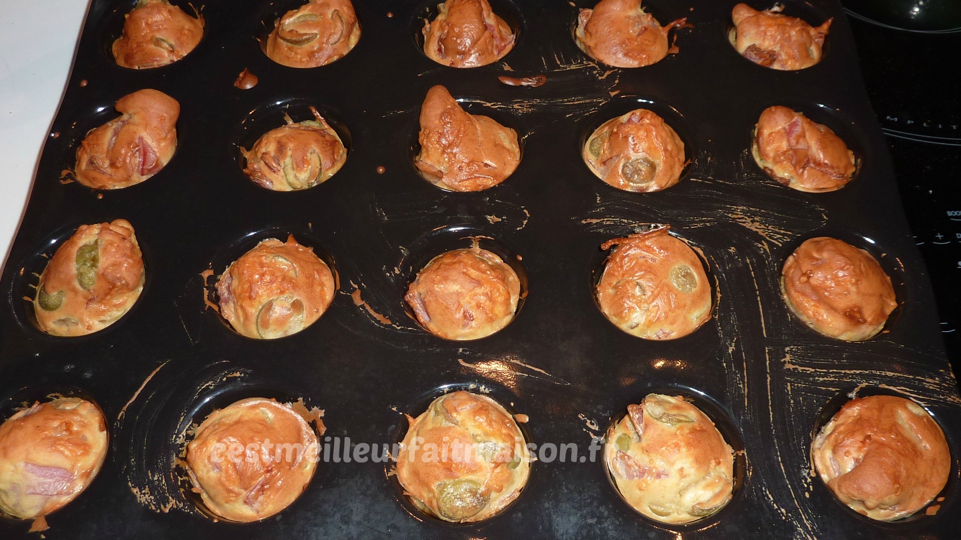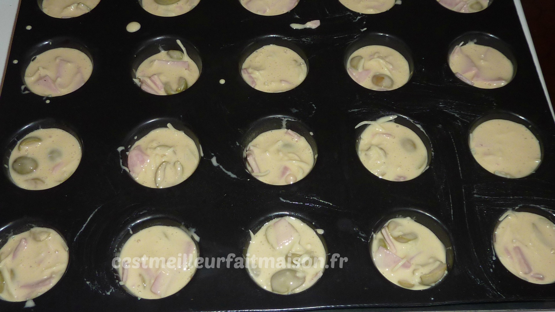 2- Ajouter le jambon coupé en petits morceaux, les olives rincées et coupées en deux et le fromage. Mélanger et verser dans des petits moules. J’ai utilisé la plaque Guy Demarle mini muffins.