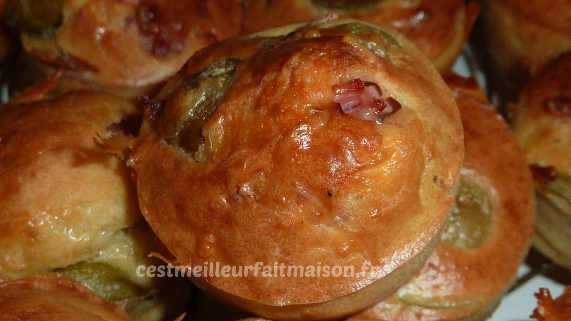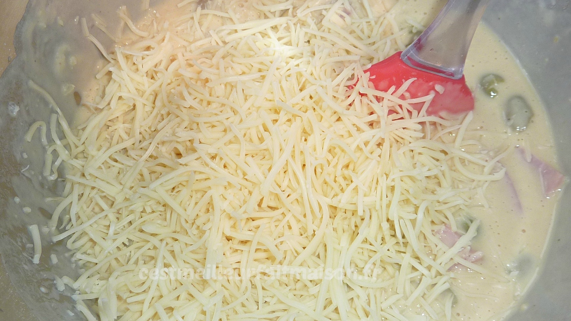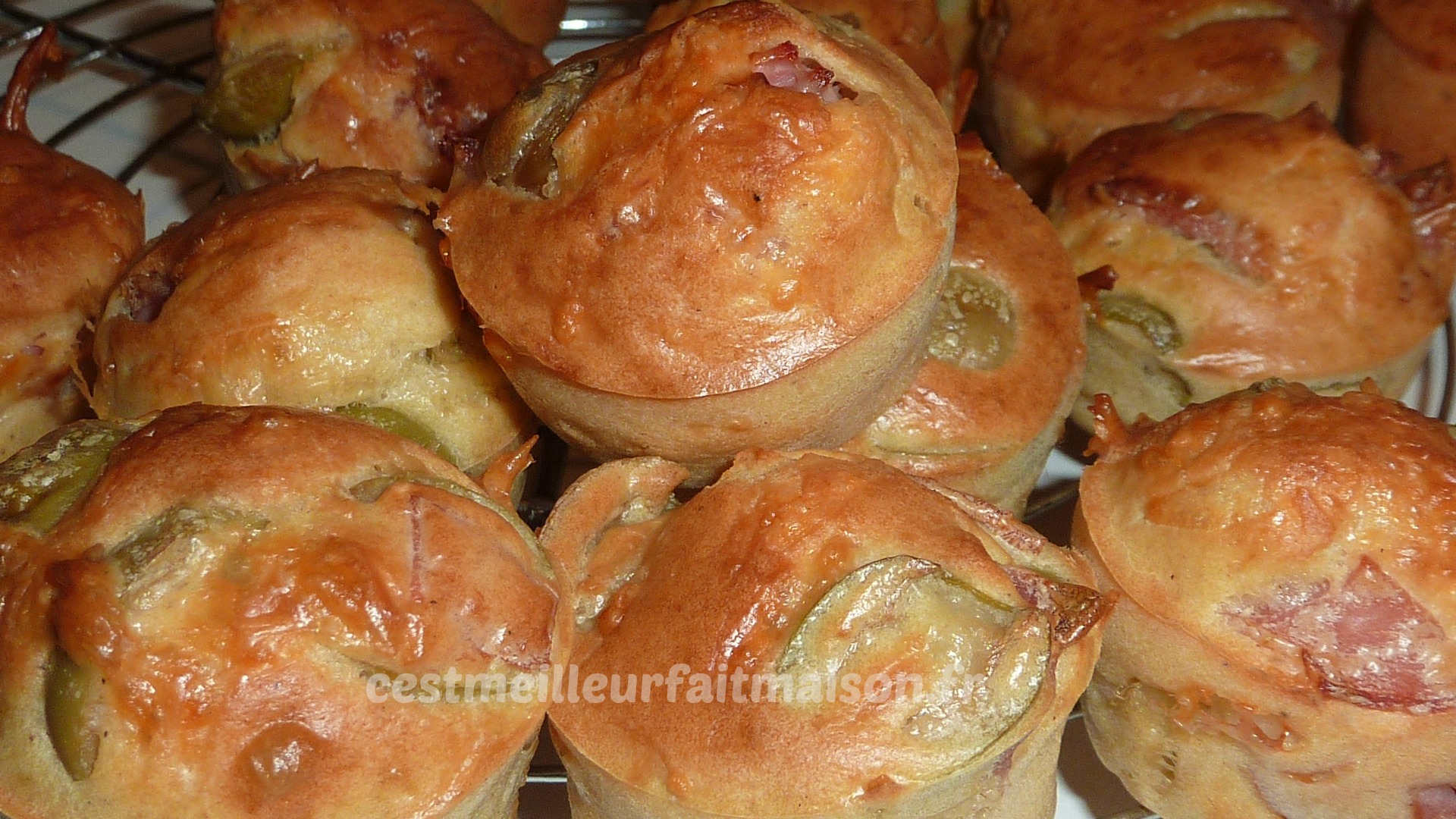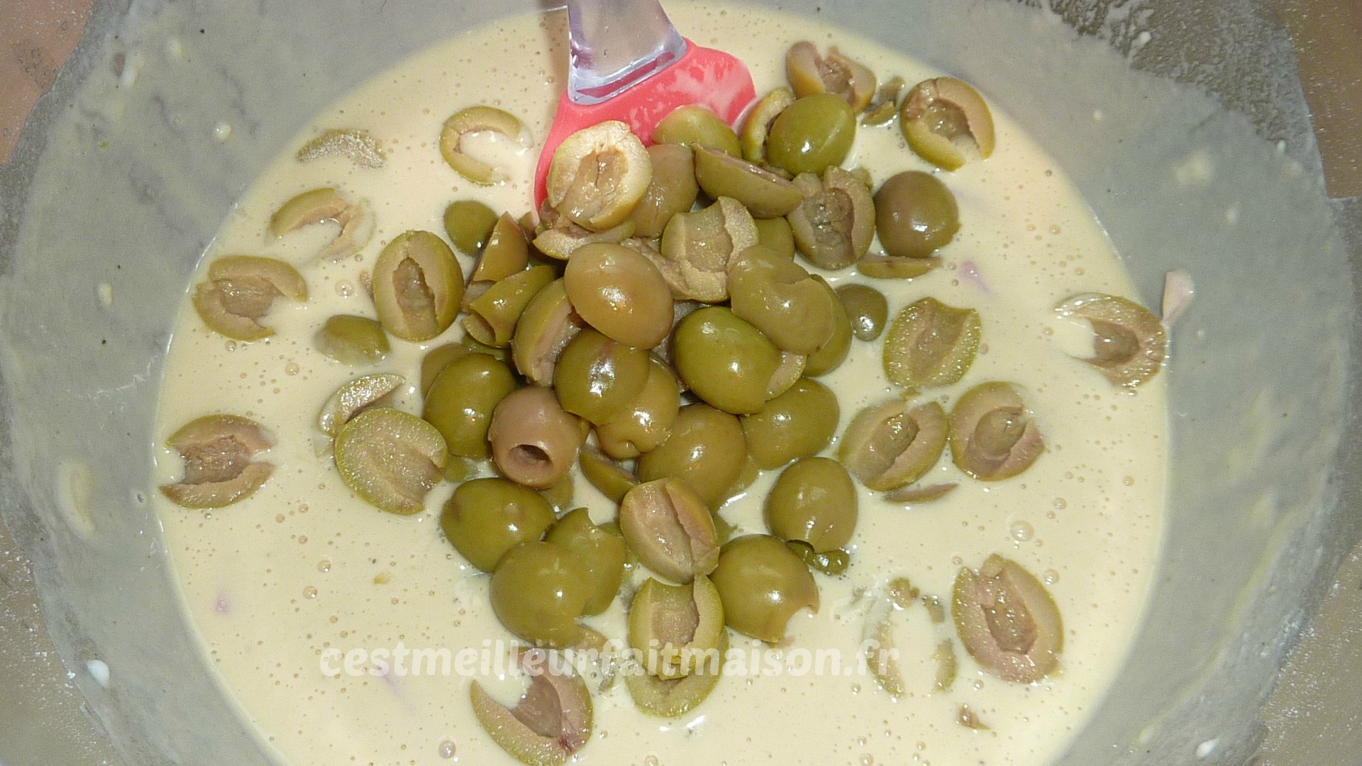 2- Ajouter le jambon coupé en petits morceaux, les olives rincées et coupées en deux et le fromage. Mélanger et verser dans des petits moules. J’ai utilisé la plaque Guy Demarle mini muffins.