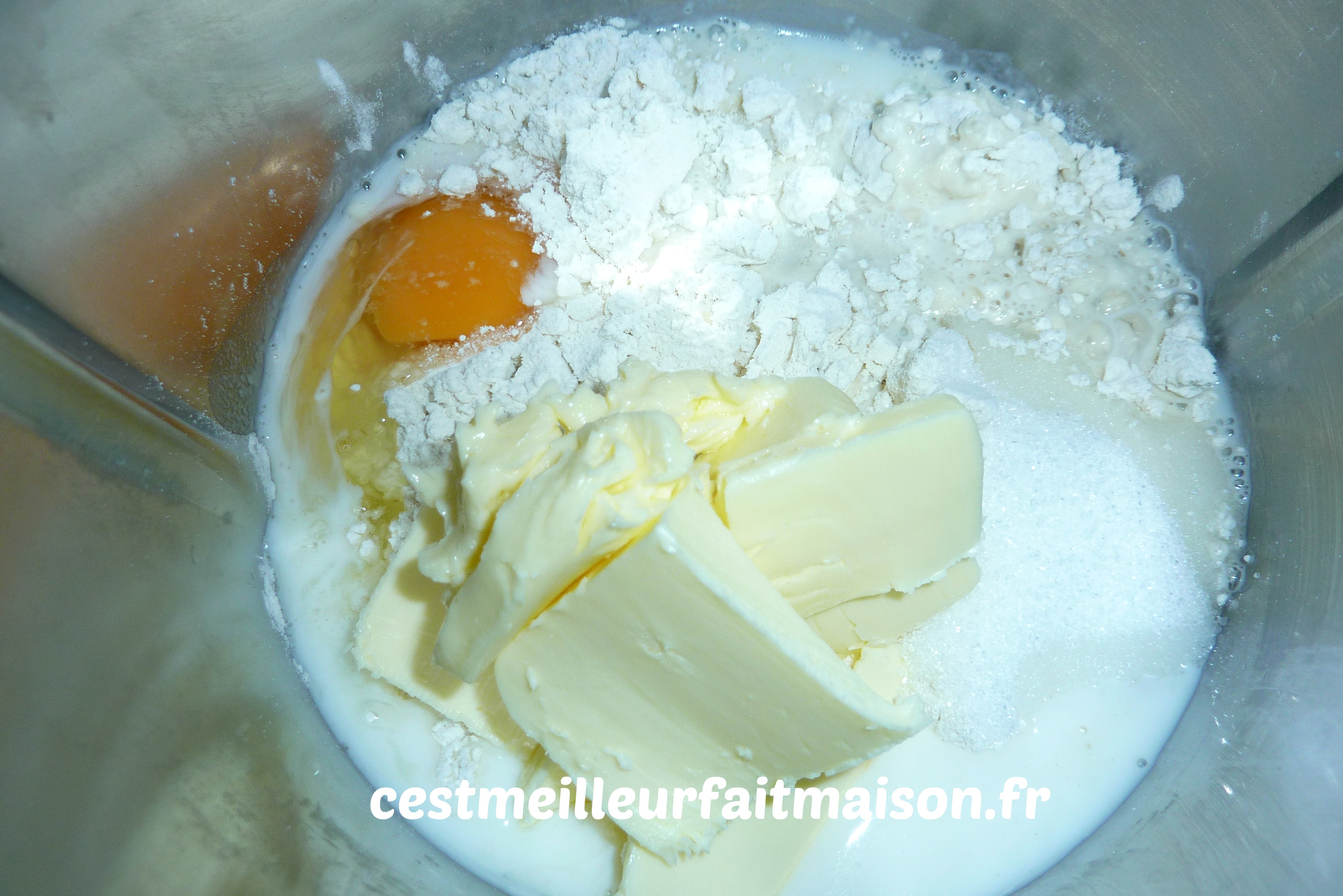 2- Lorsque le levain a assez poussé, ajouter l’œuf, le lait, le sucre et le beurre ramolli.