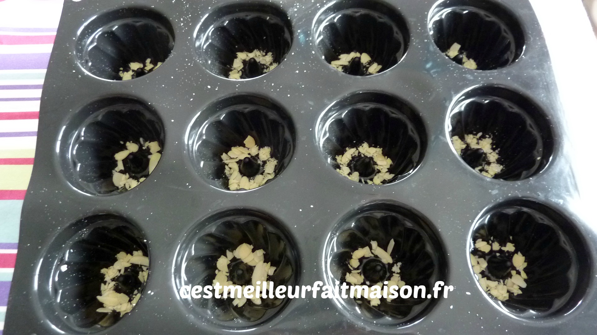 6- Mettre quelques amandes effilées au fond de chaque empreinte.