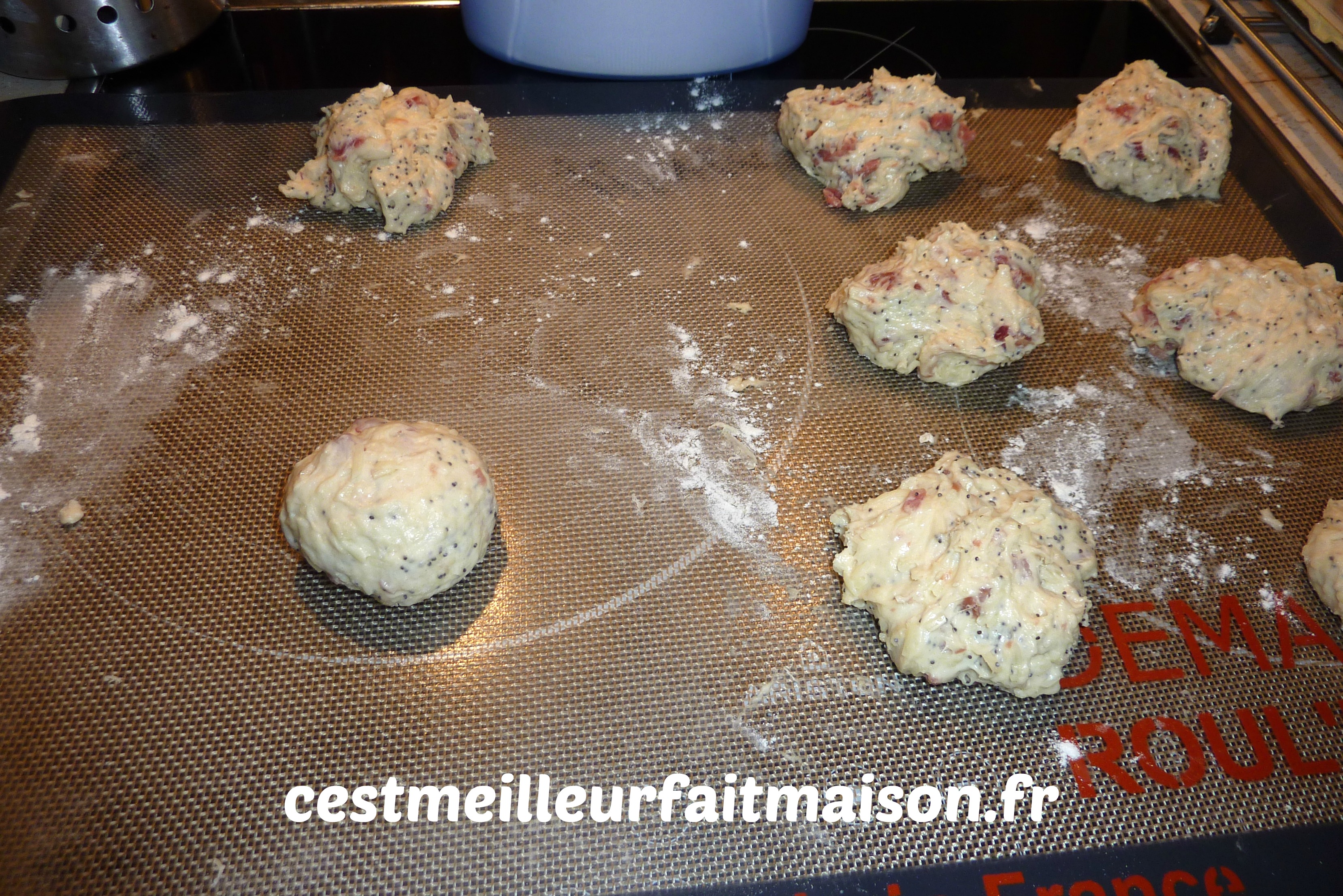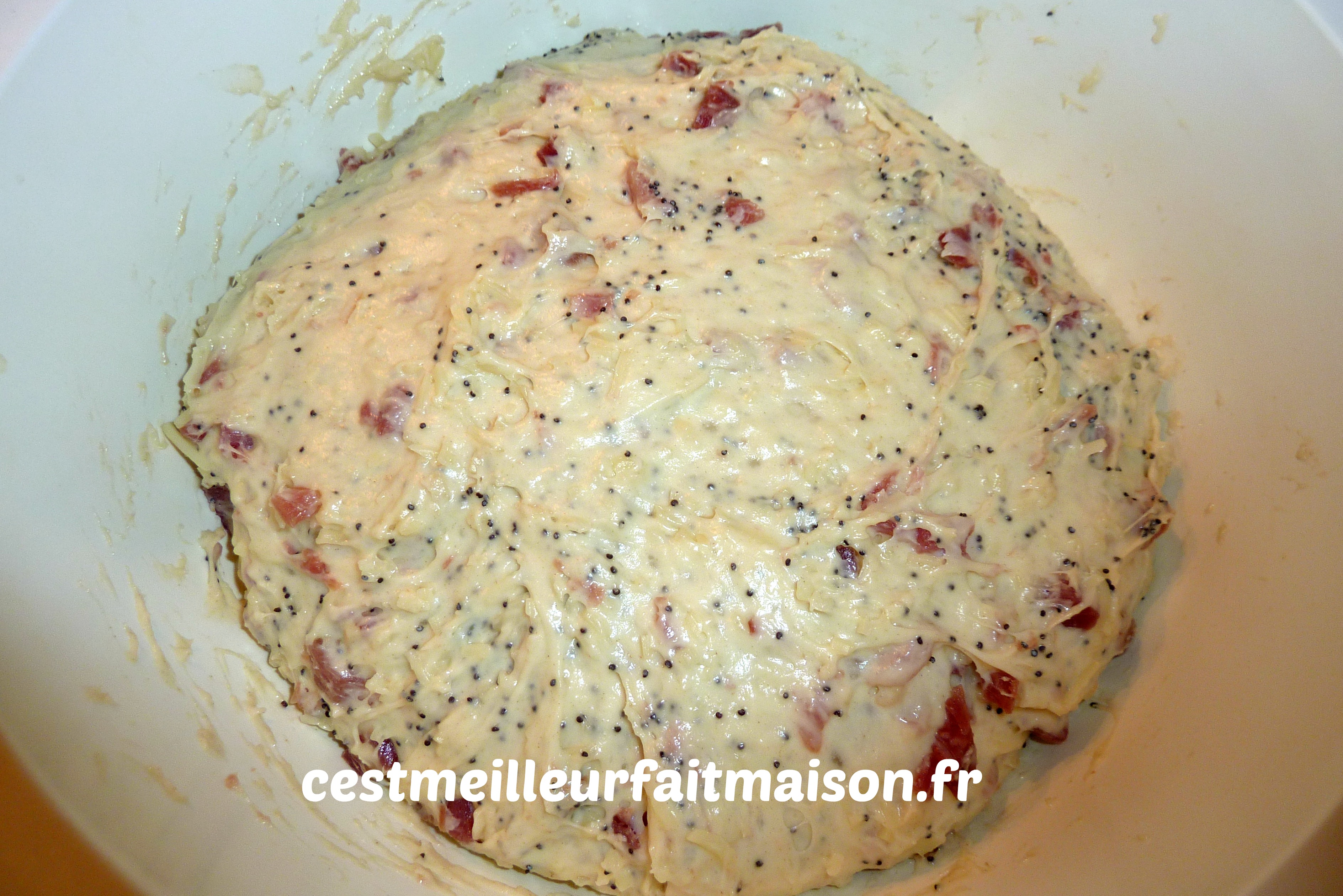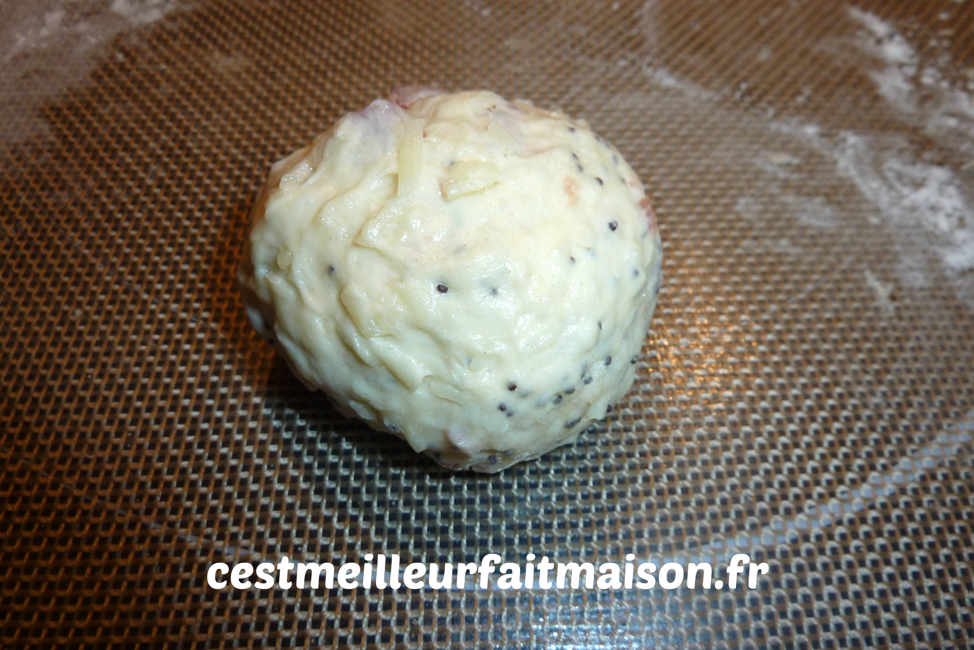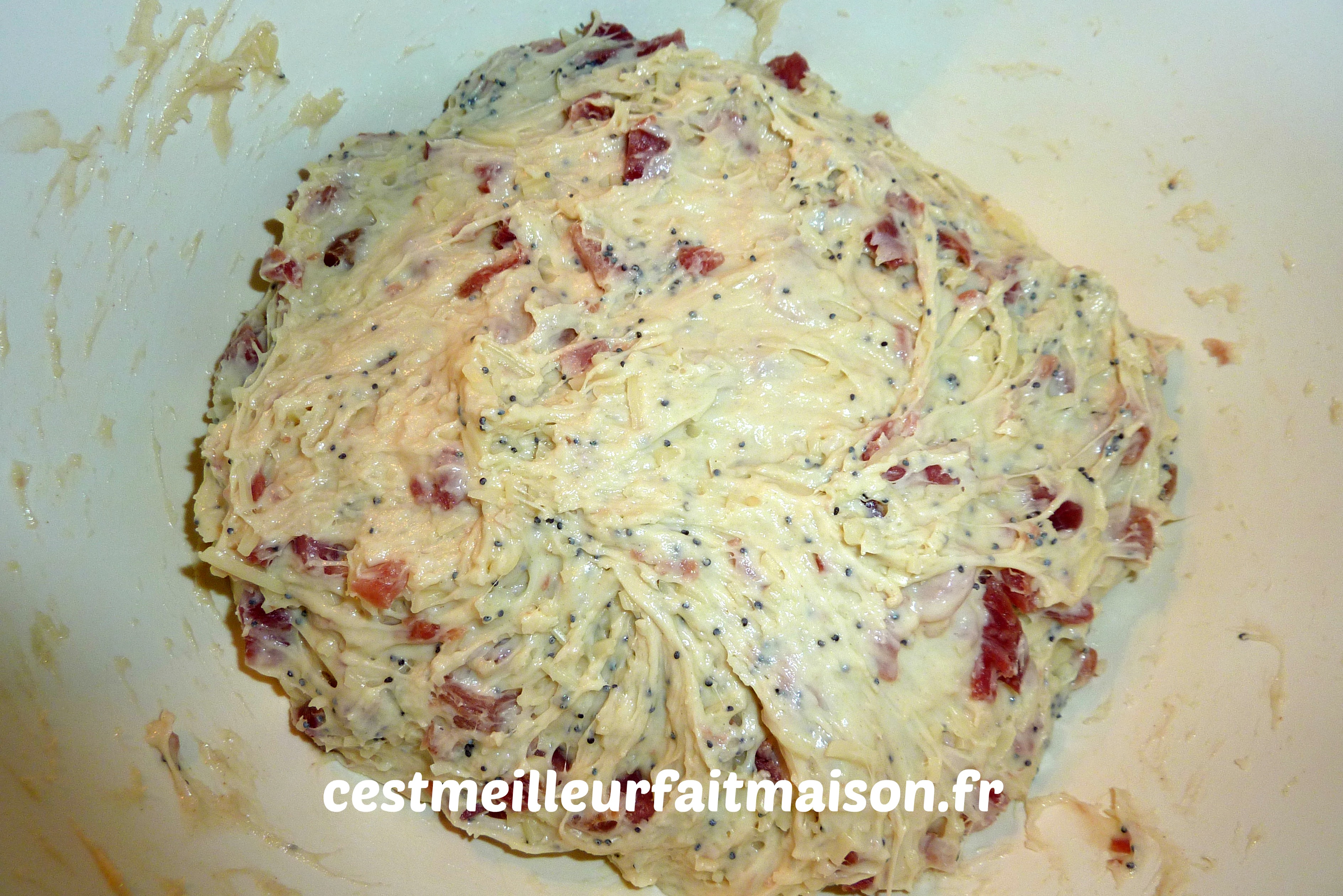 4- Ajouter le fromage, le jambon et les graines de pavot. Pétrir 1 min afin que tout soit bien intégré dans la pâte.