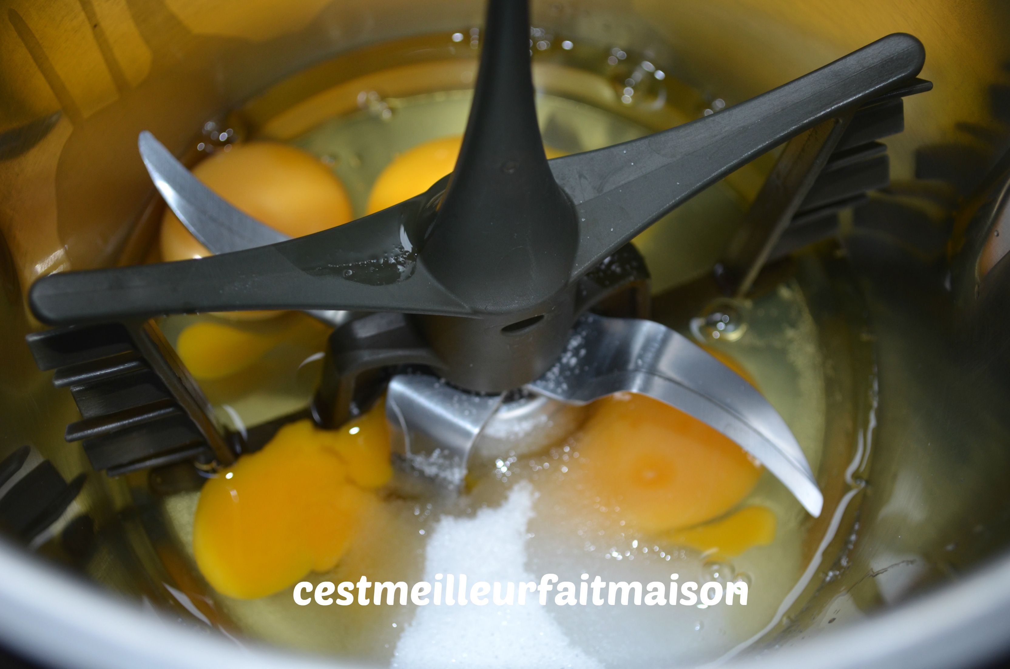 2- Dans le bol du Thermomix muni du fouet, mettre les œufs, le sucre et l’eau. Chauffer 3 min/70°C/Vit 3.5. Continuer 5 min de plus sans chauffer à la vitesse 3.5.