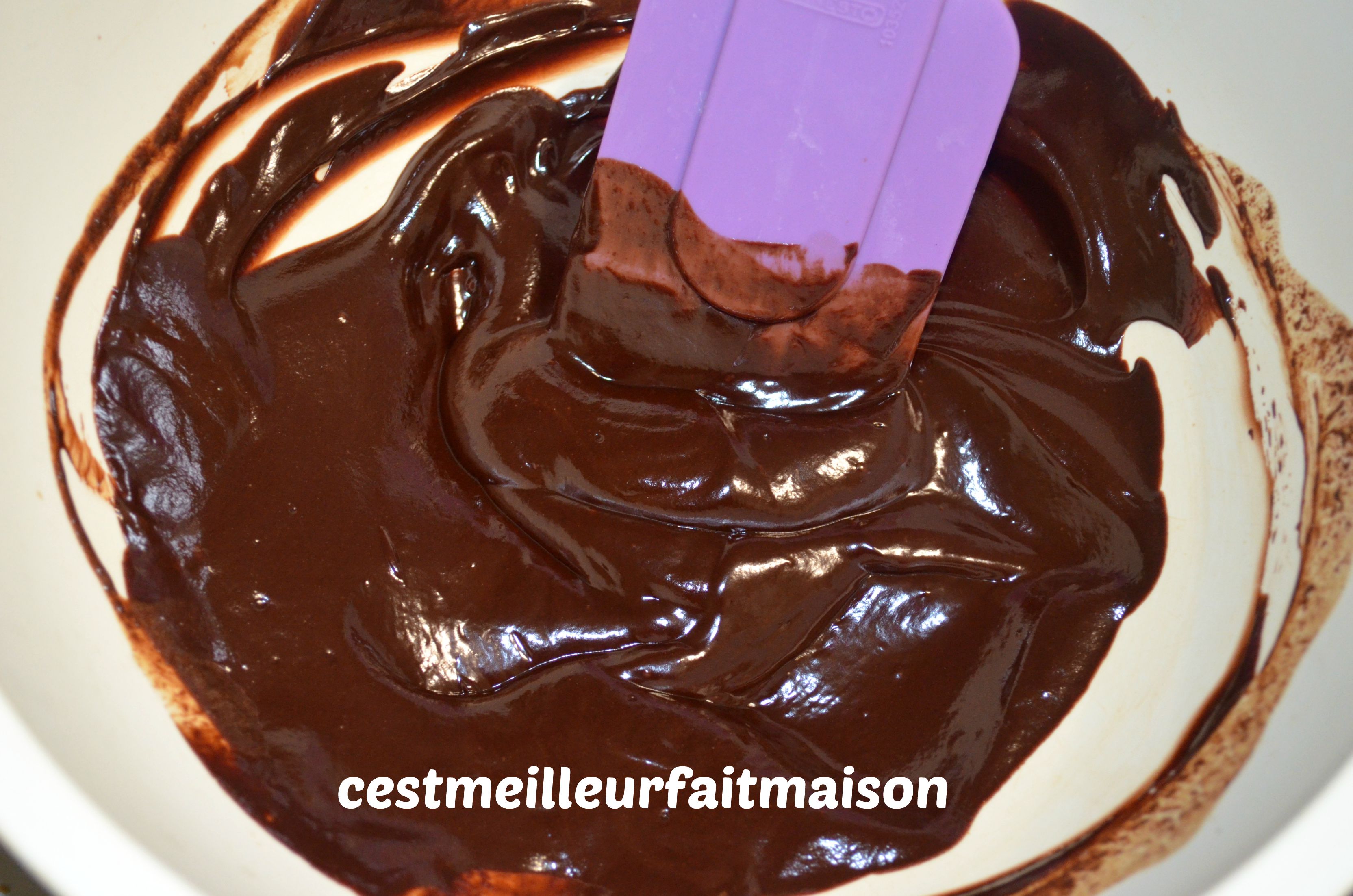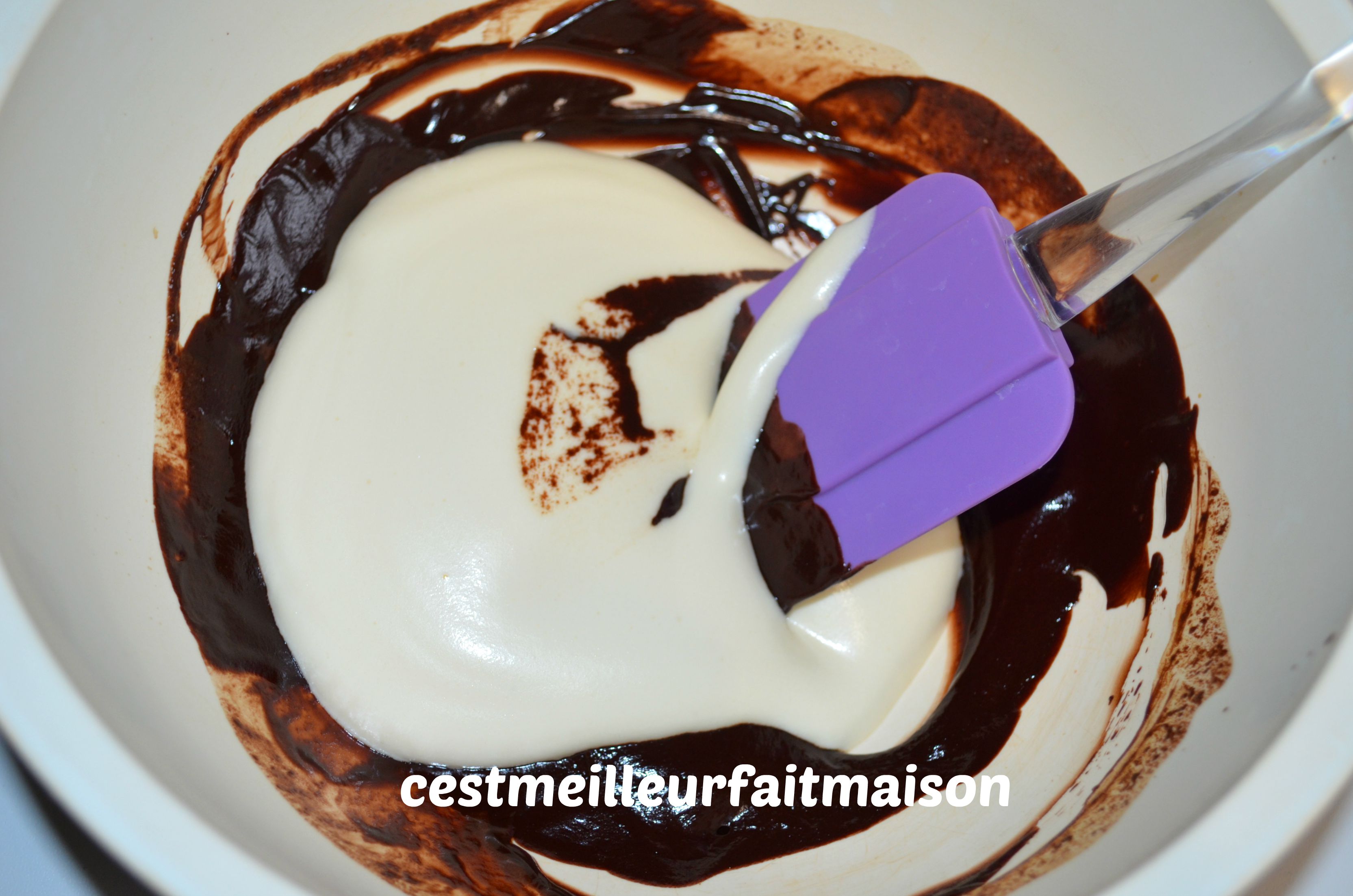 3- Verser une partie des œufs bien mousseux sur le chocolat fondu. Mélanger délicatement à la spatule et ajouter le reste des œufs. Mélanger.