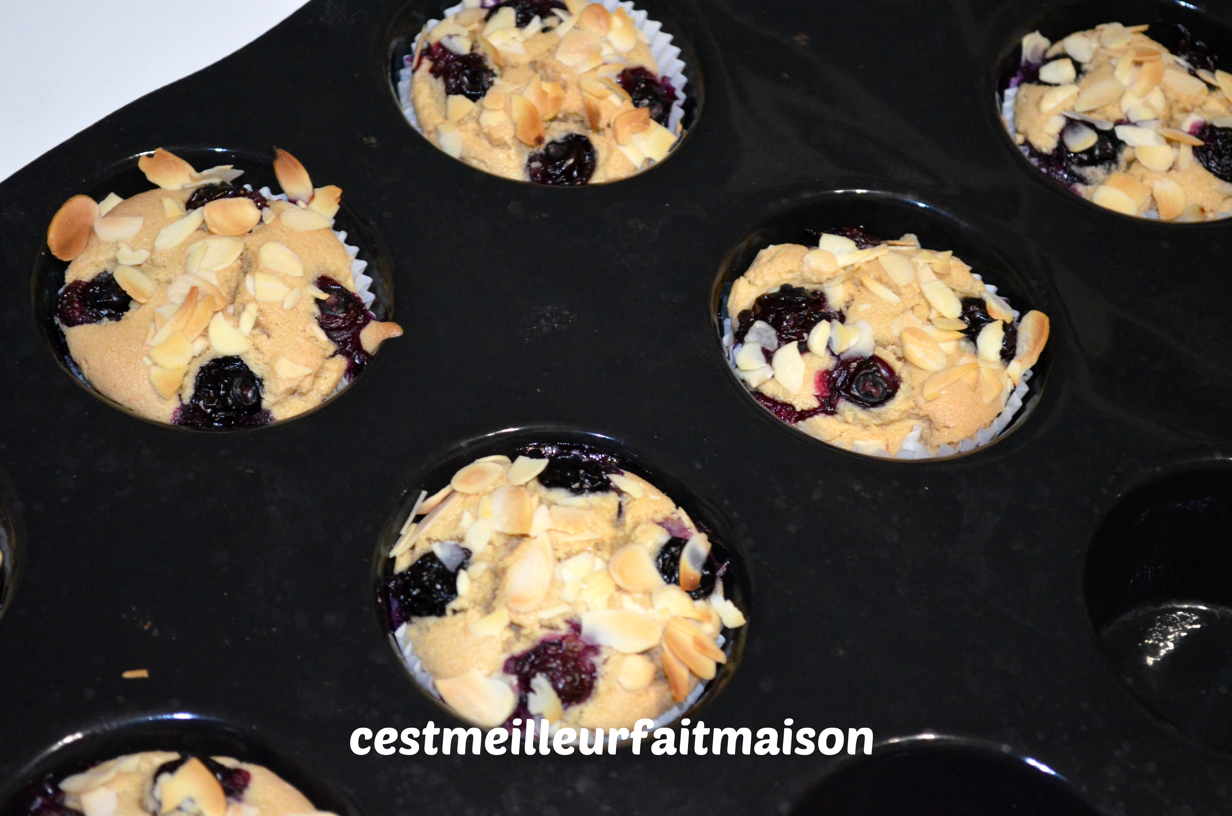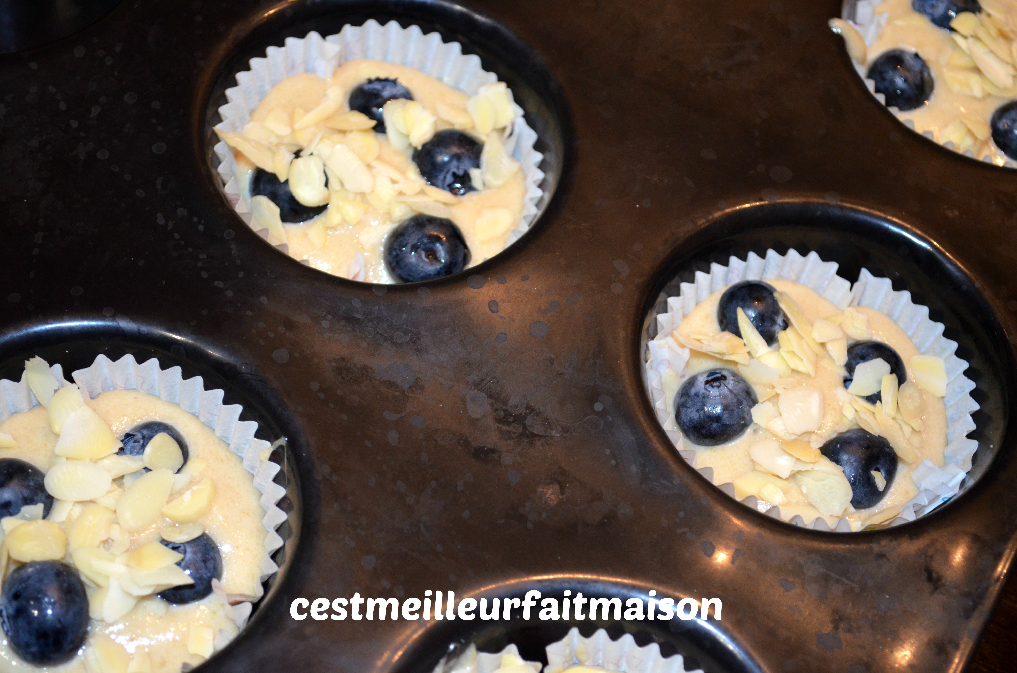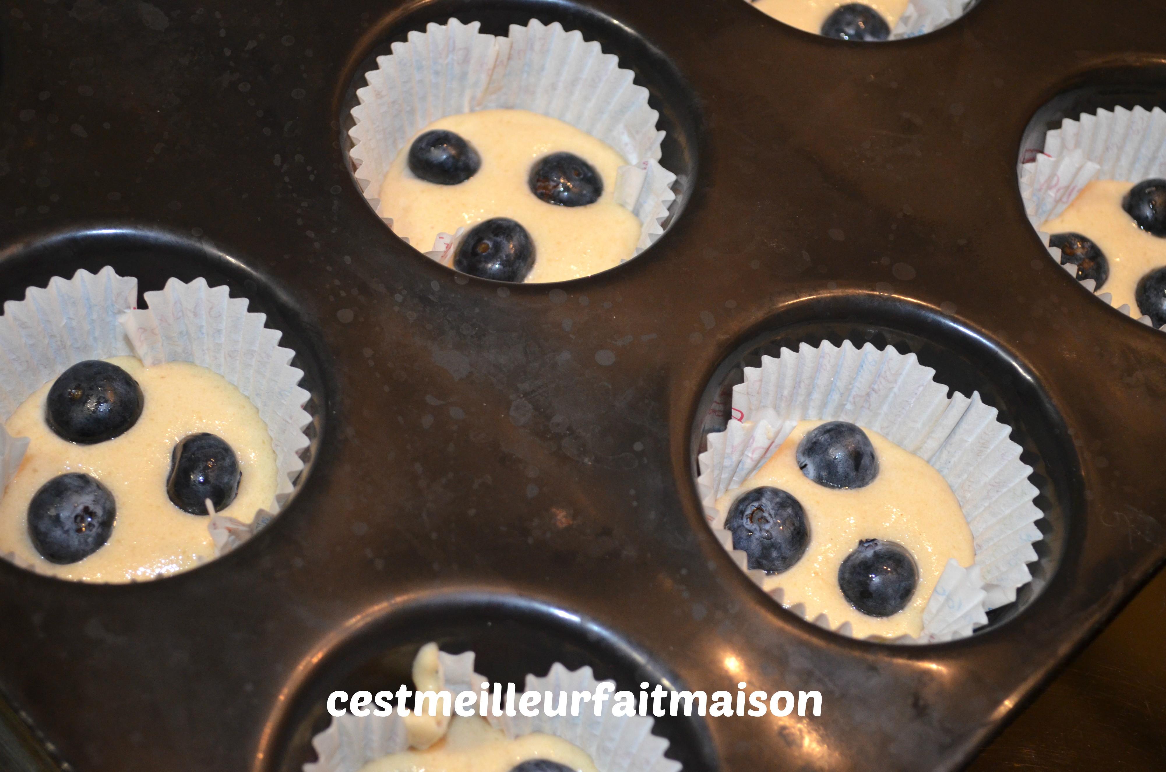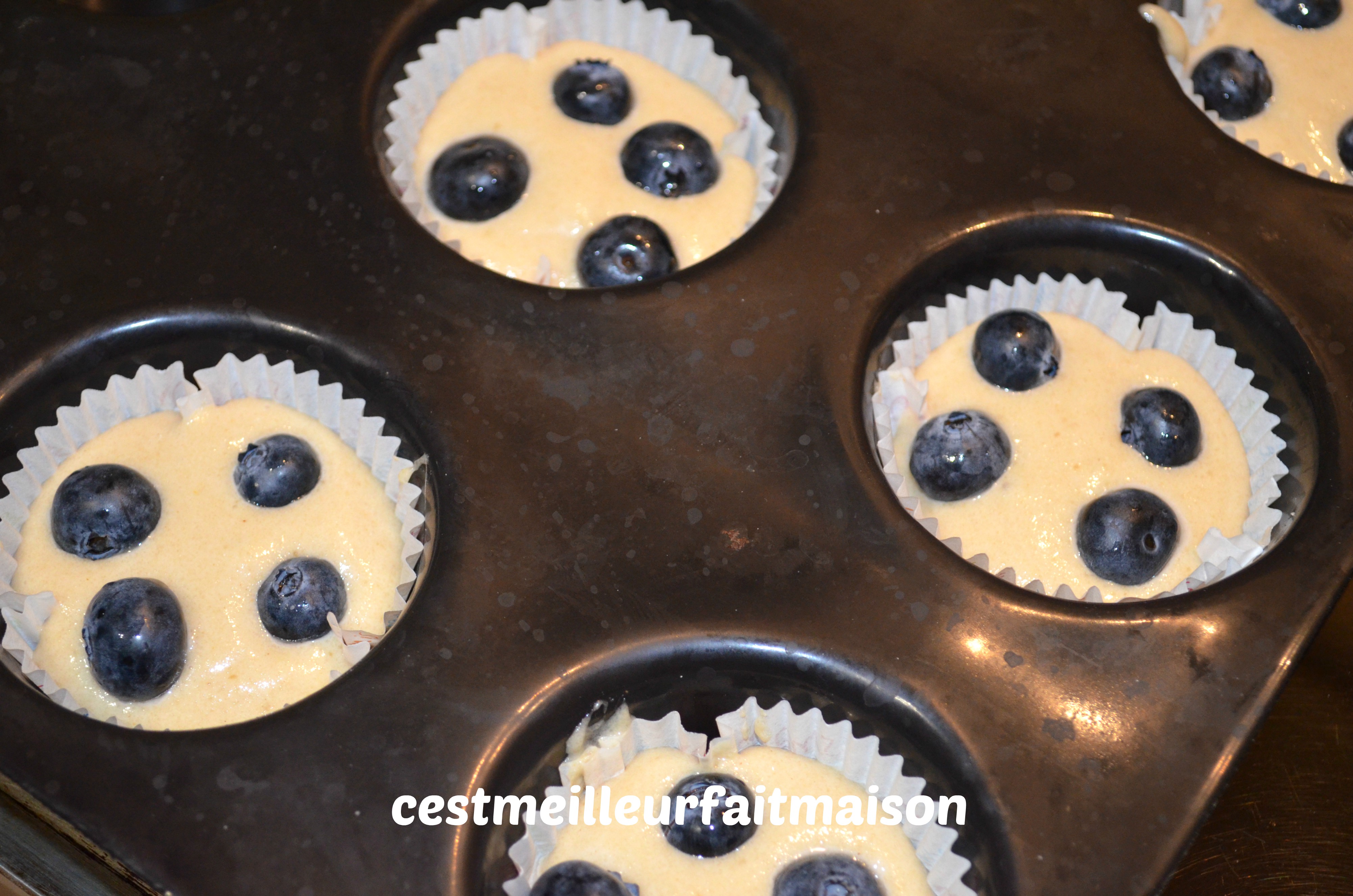 Verser la moitié de la pâte dans des empreintes à muffins avec ou sans caissettes en papier. Mettre des myrtilles, recouvrir de pâte et ajouter à nouveau des myrtilles.