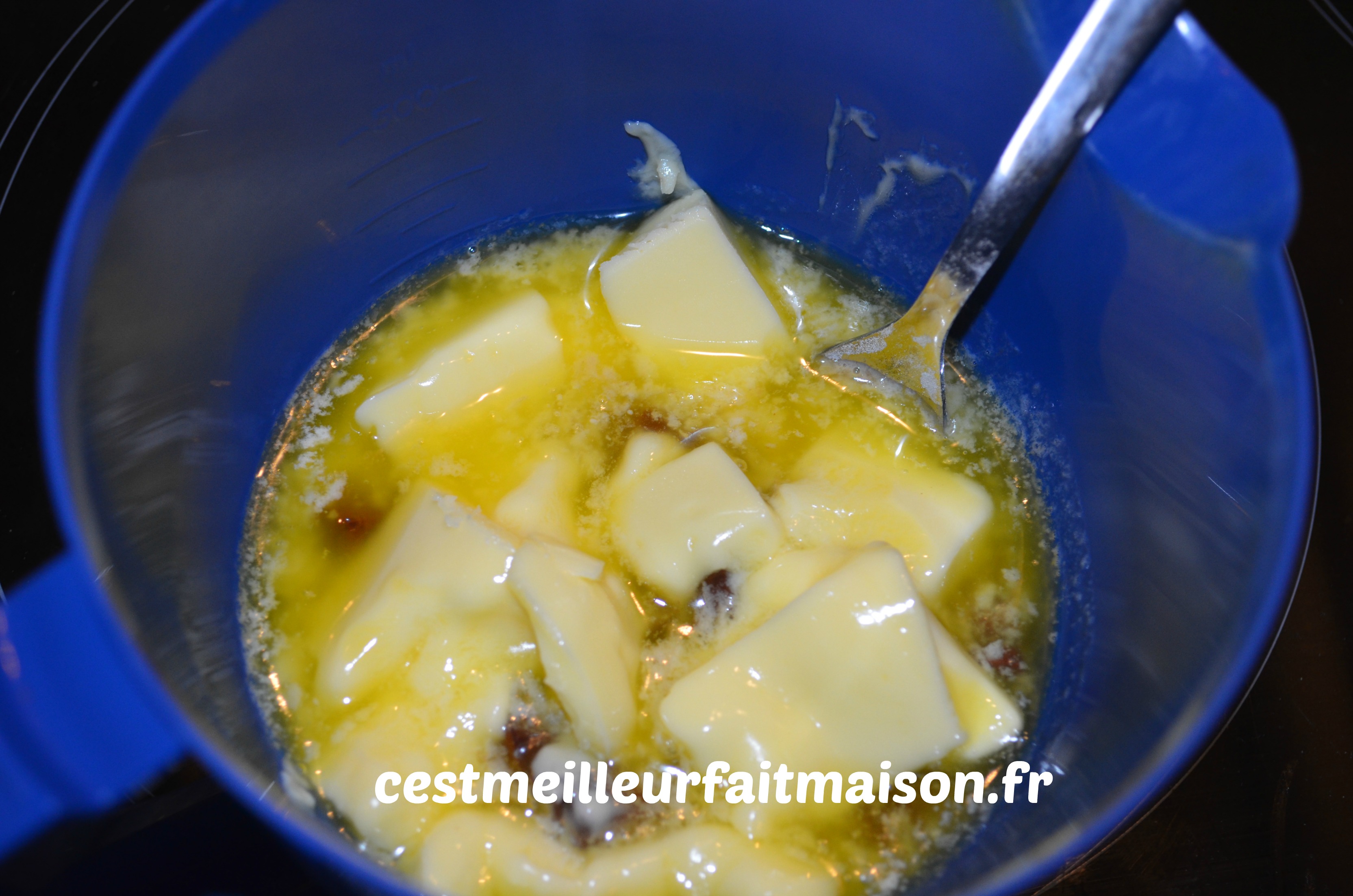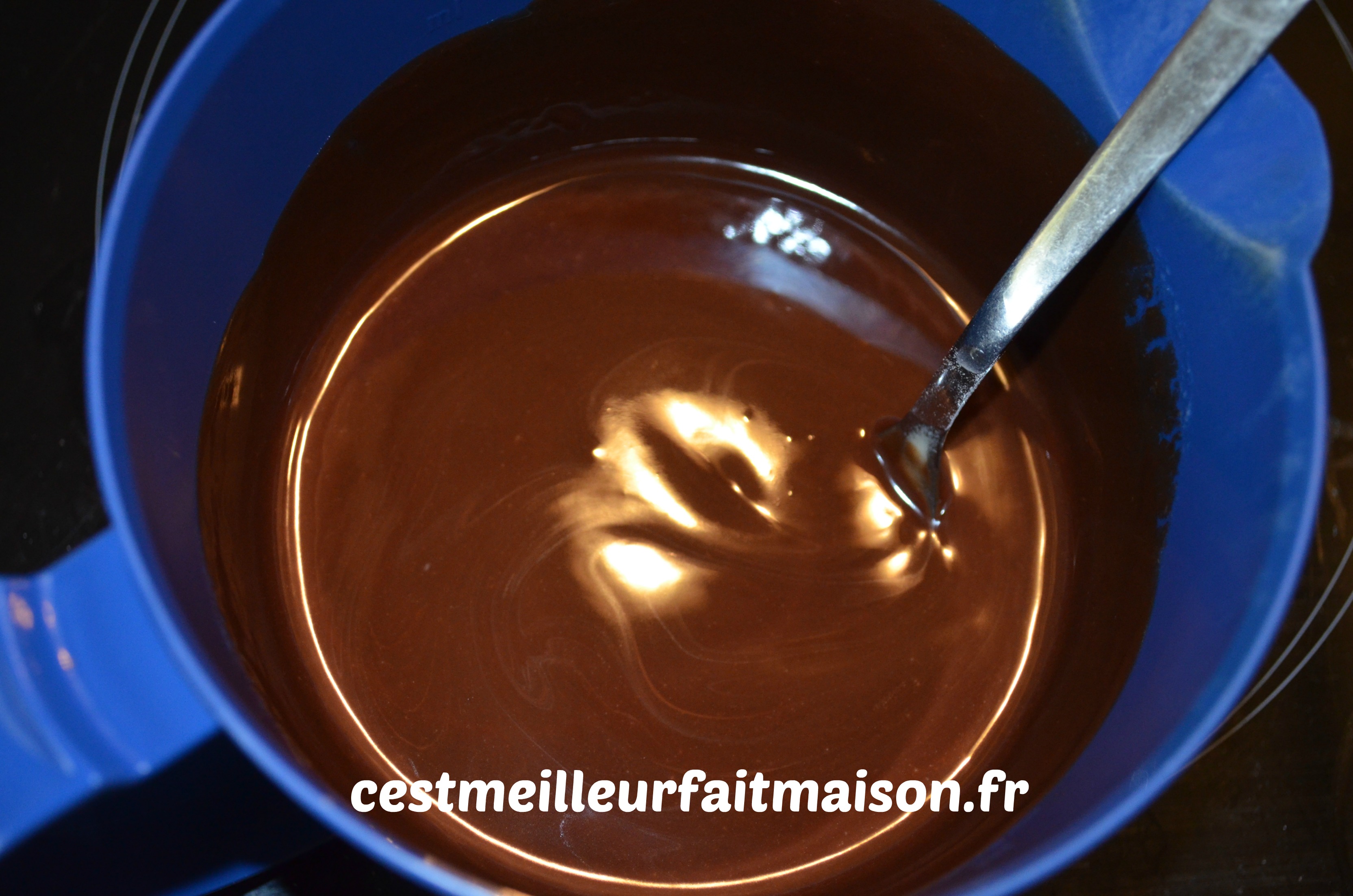 3- Faire fondre le chocolat au micro-ondes. Ajouter le beurre et mélanger.