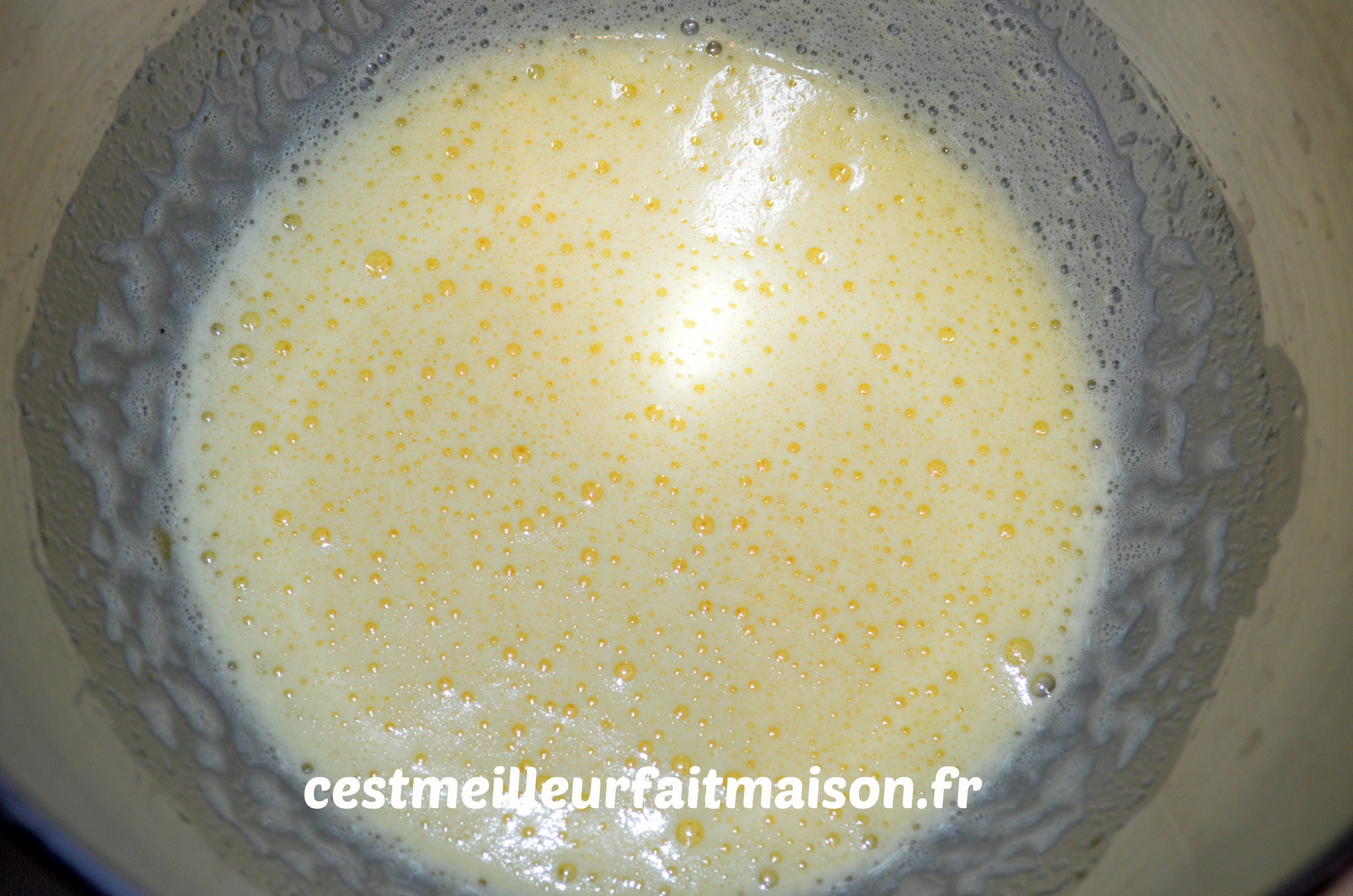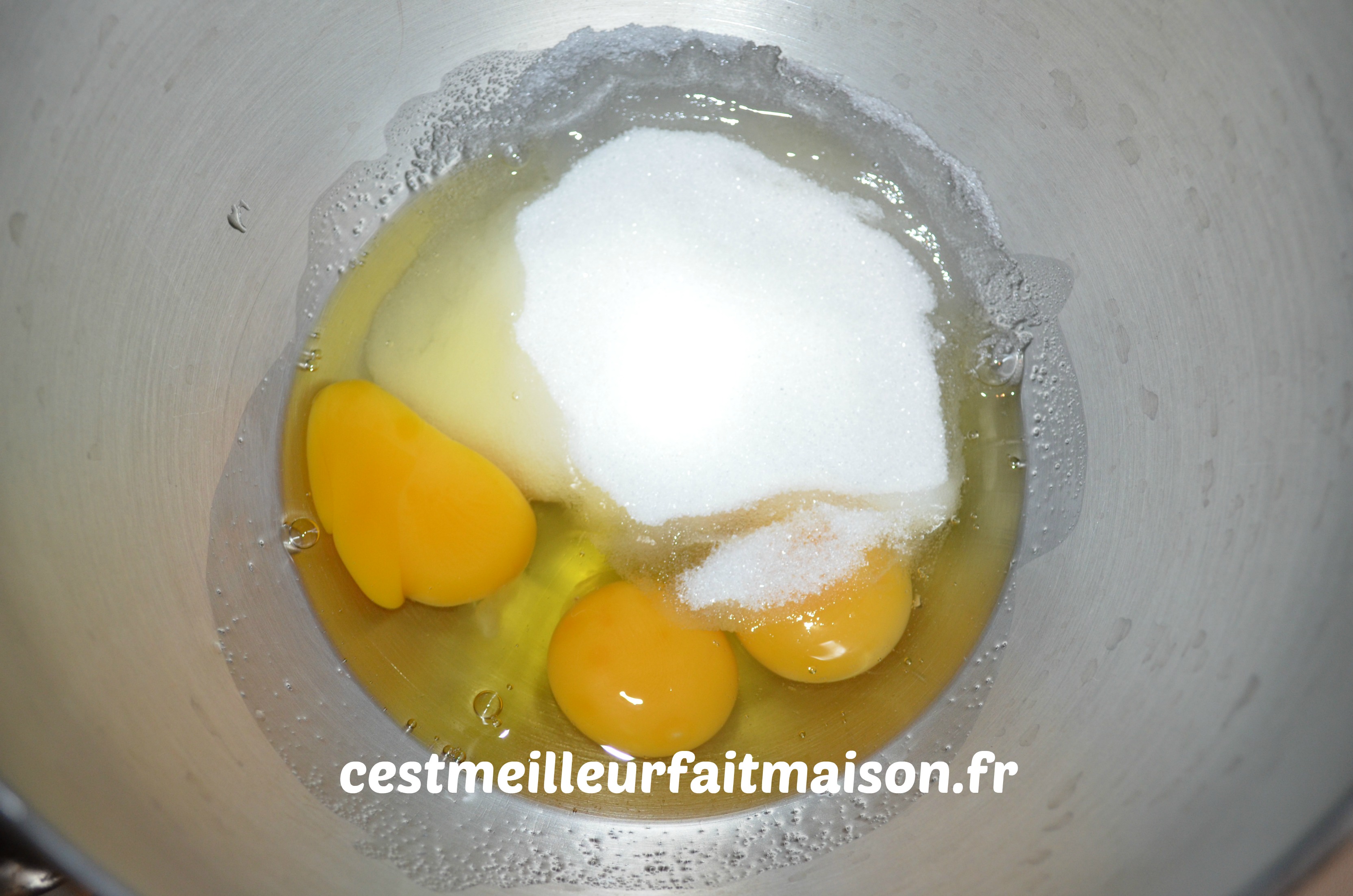 Dans un récipient, fouetter les œufs et le sucre jusqu’à ce que le mélange blanchisse.