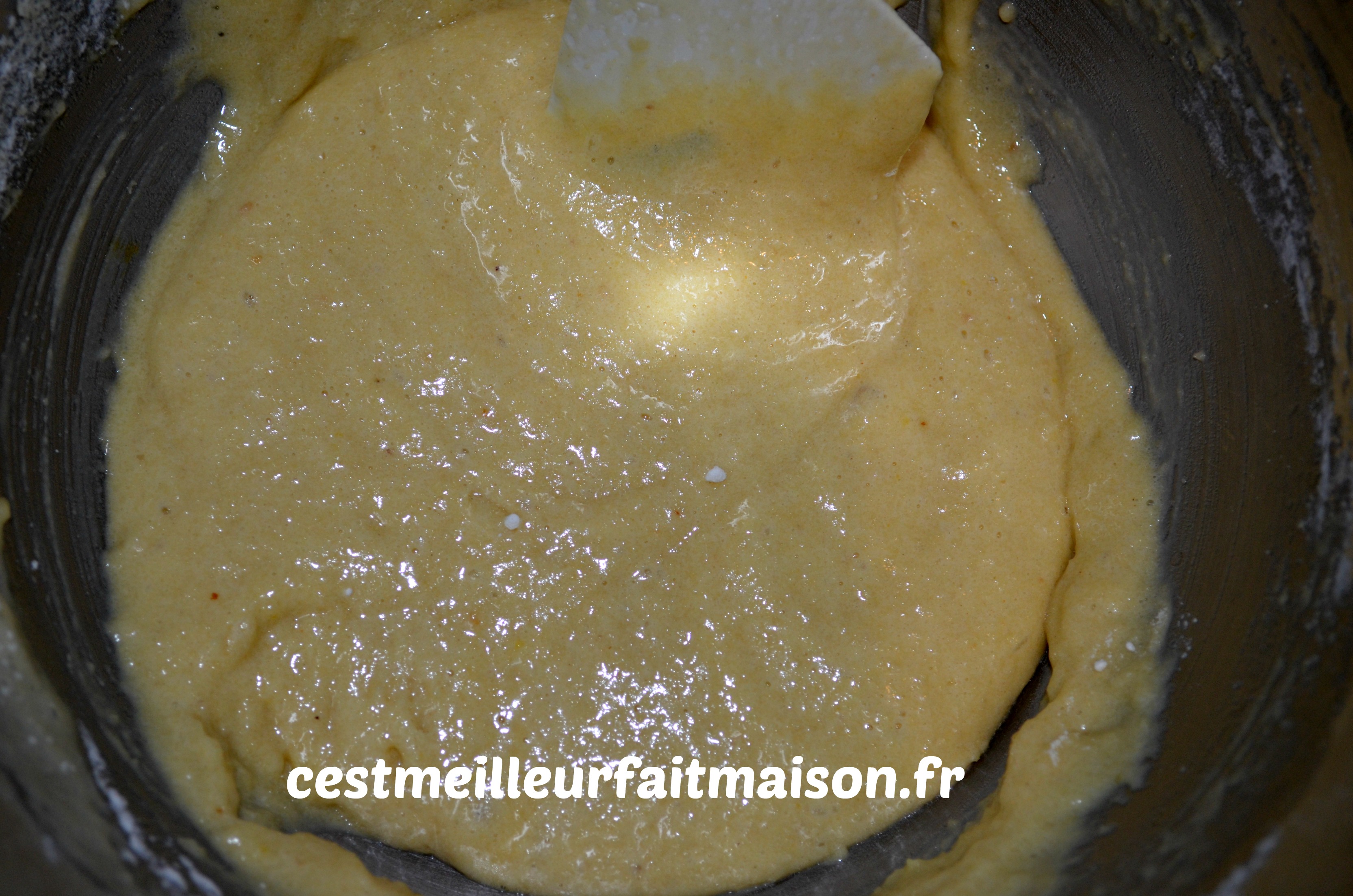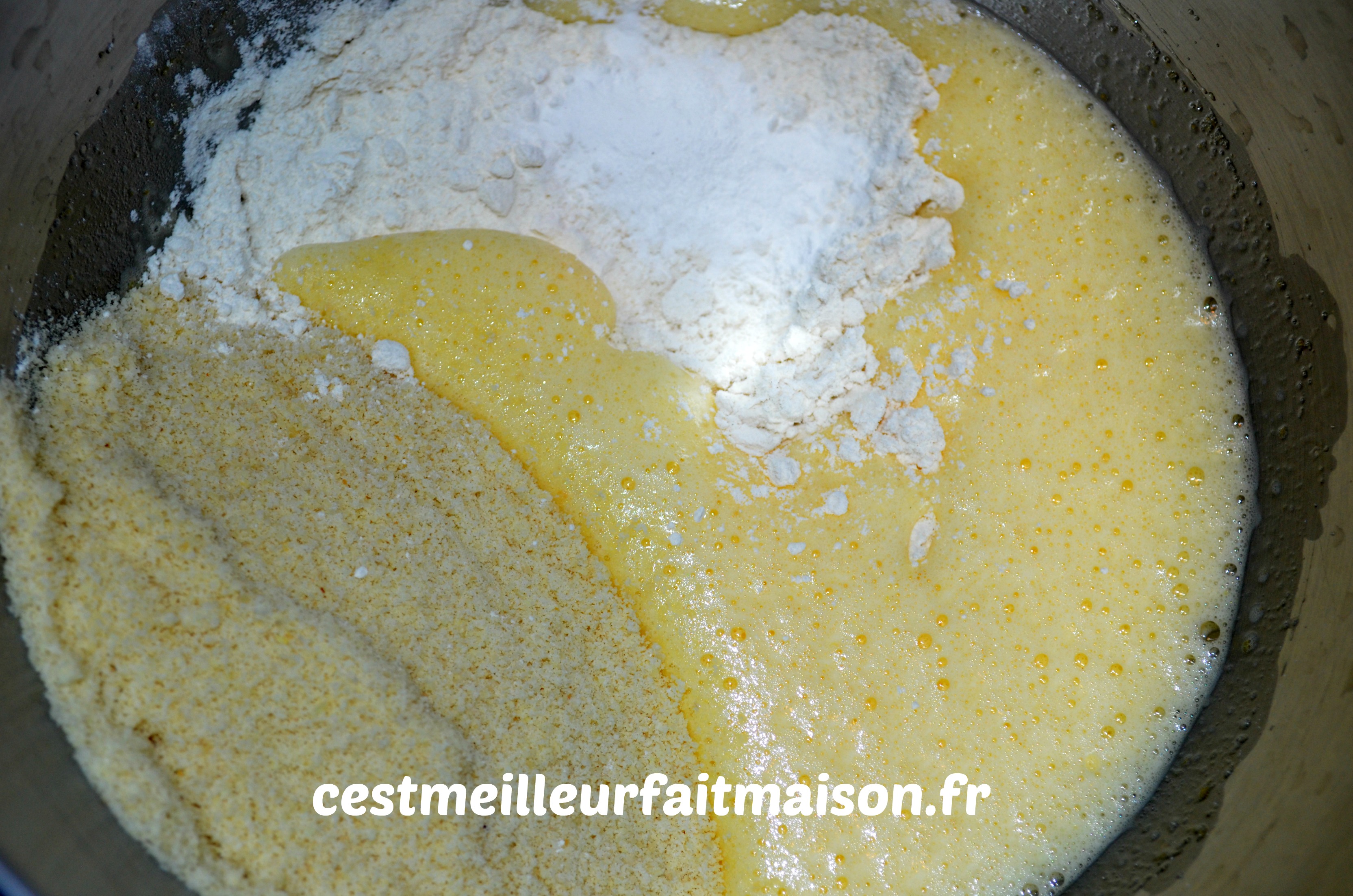 2- Ajouter la poudre d’amandes, la farine et la levure. Bien mélanger à la spatule.
