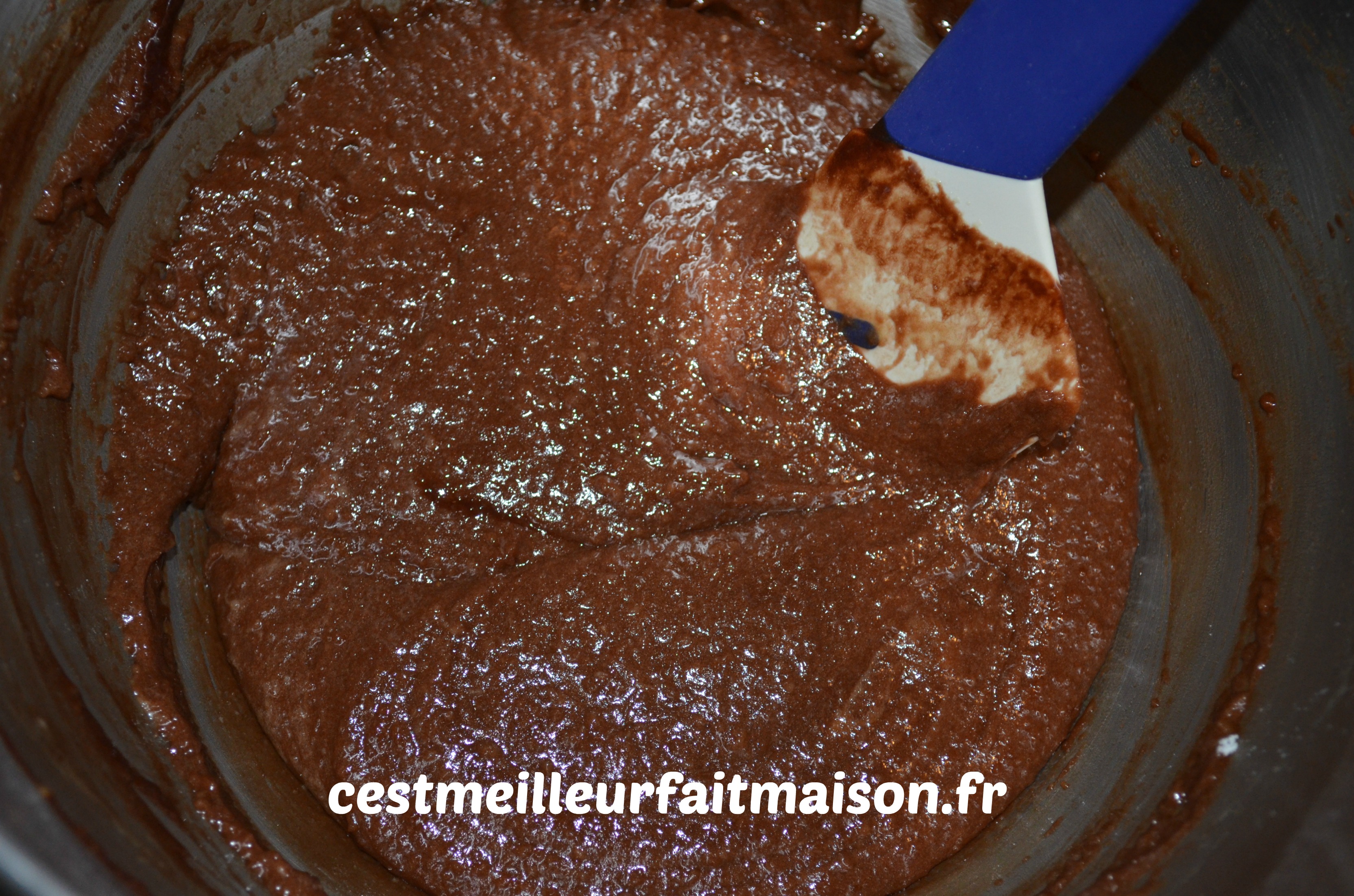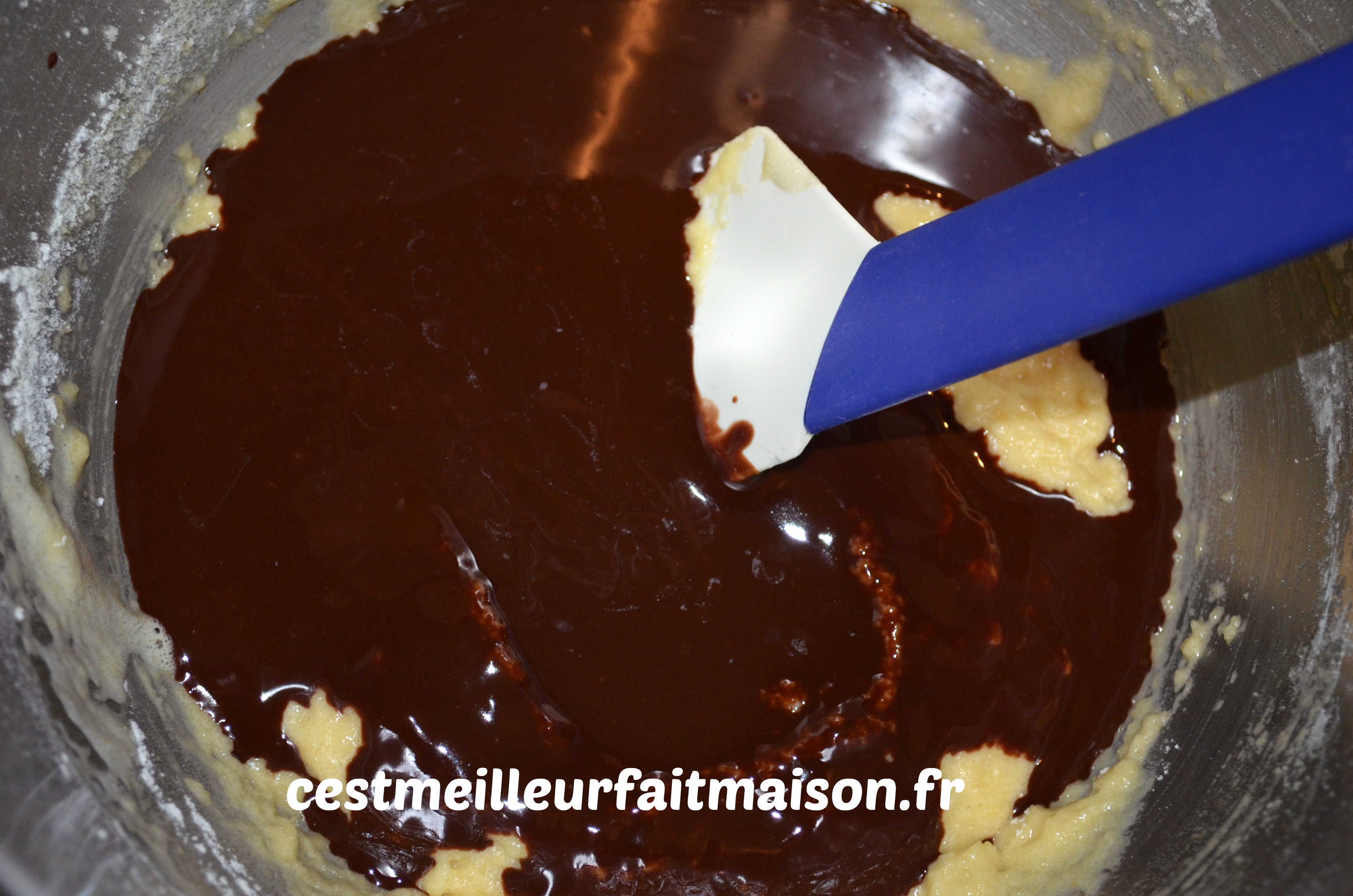 4- Verser le chocolat dans la préparation précédente et bien mélanger à la spatule.