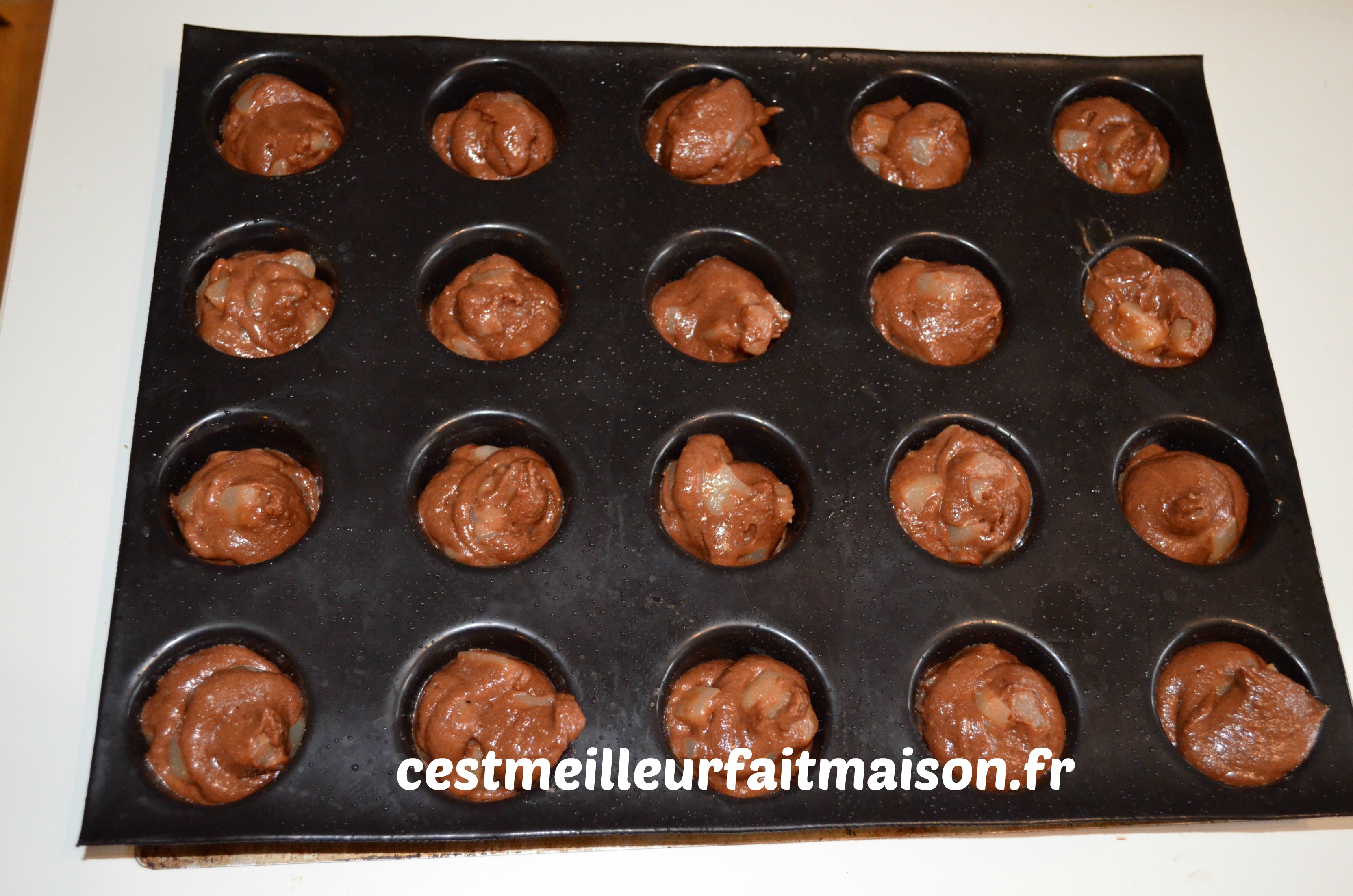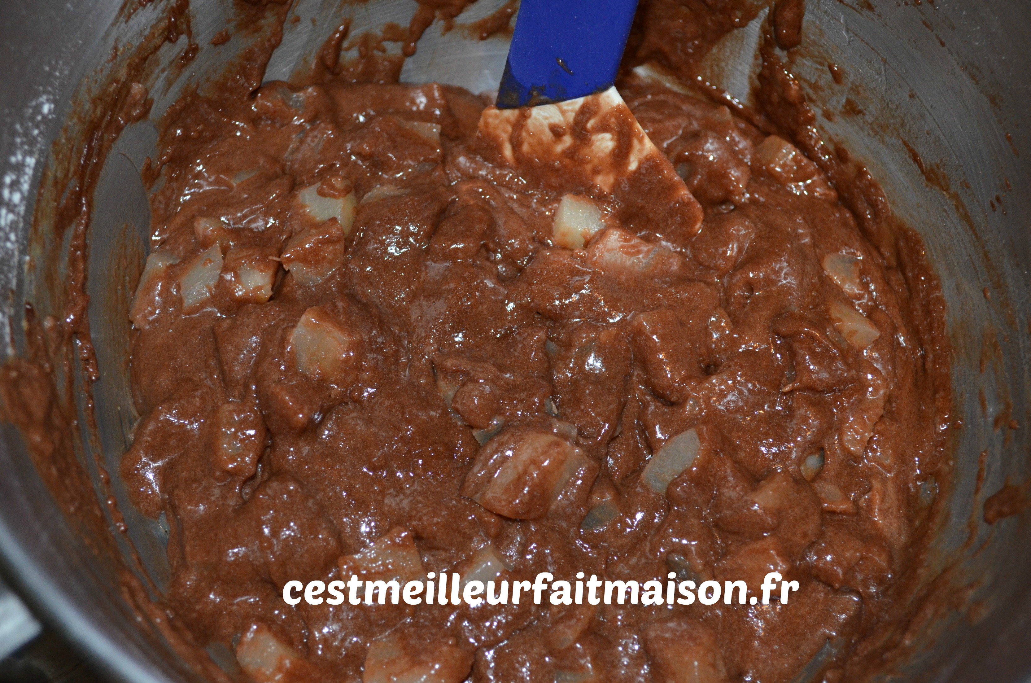 5- Égoutter les poires et les couper en petits cubes. Les ajouter à la pâte chocolatée et mélanger.