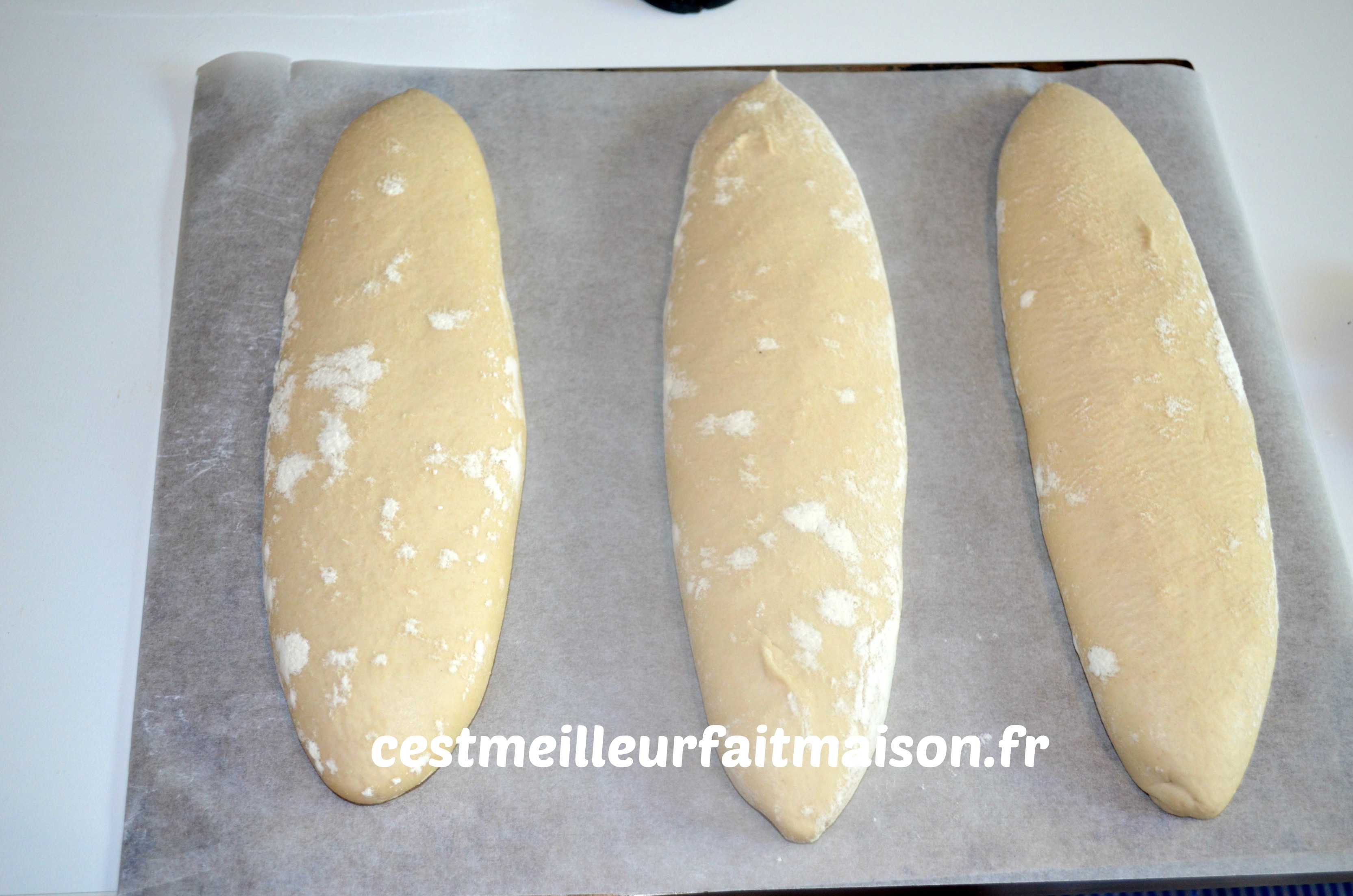 Rouler le pâton pour obtenir la forme désirée. J’ai choisi de les former en bâtard mais on peut aussi faire des baguettes.