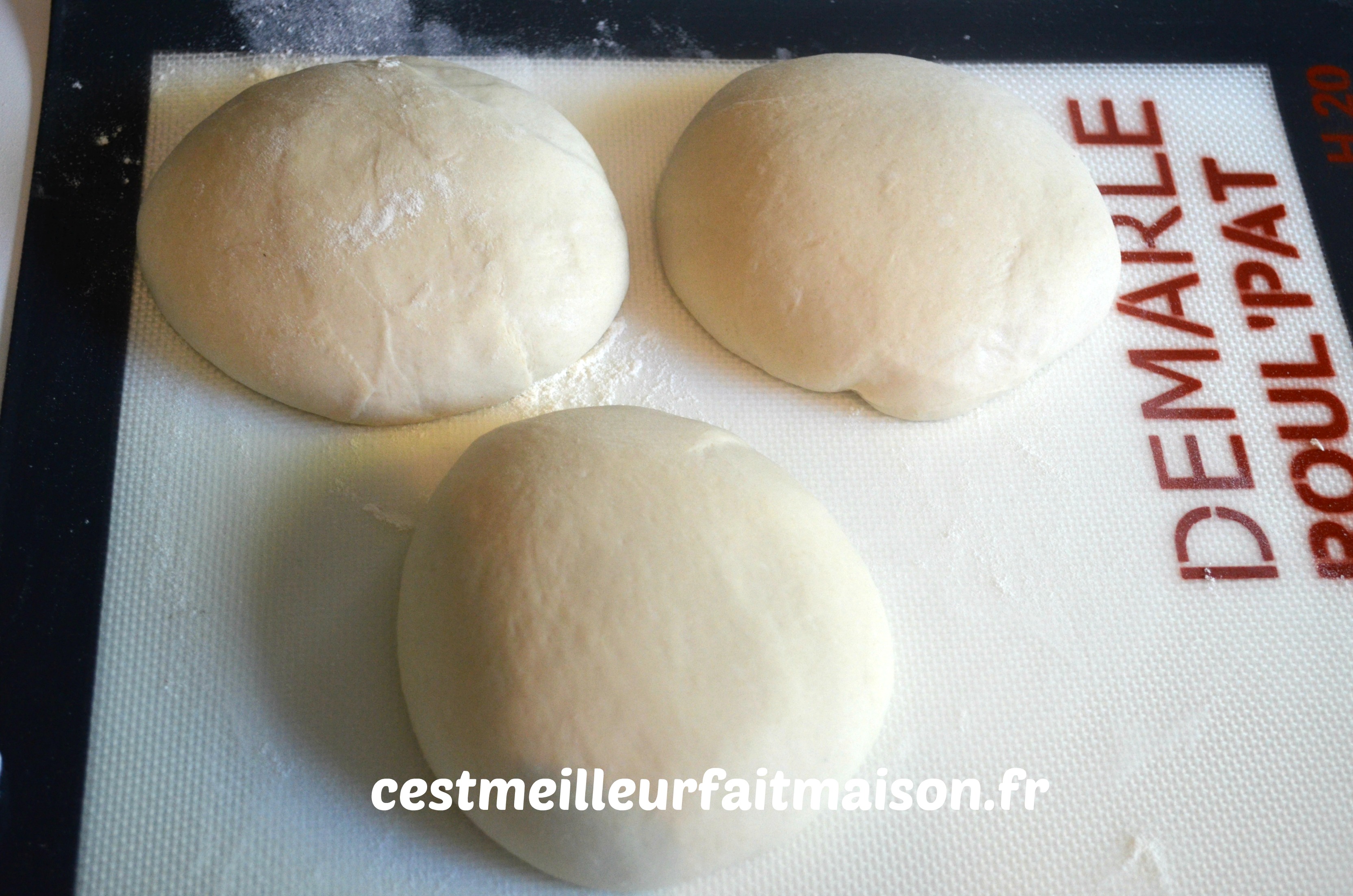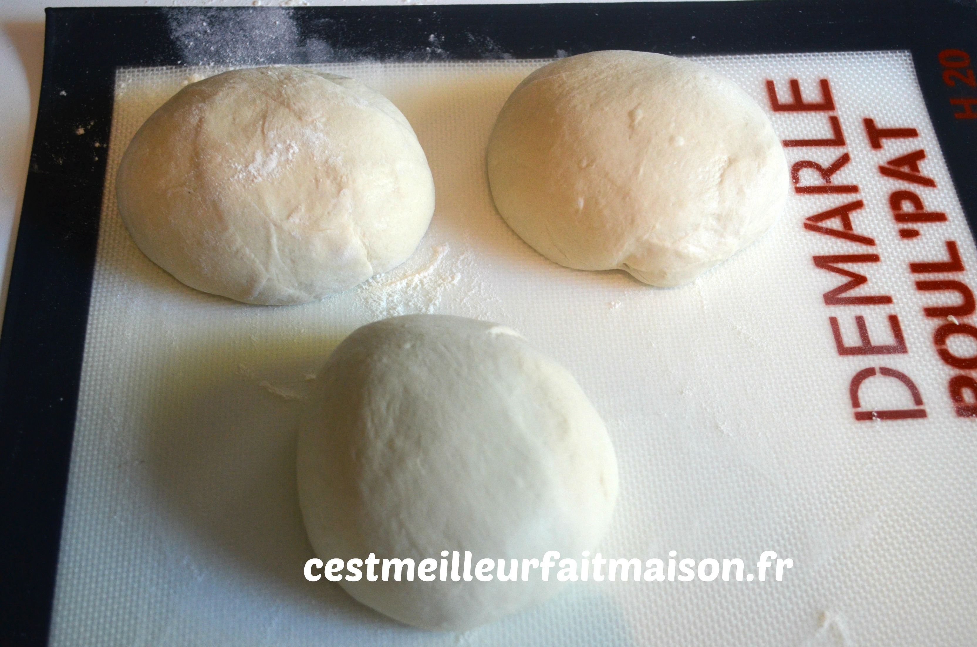 3- Fariner un plan de travail. Diviser la pâte en trois pâtons d’environ 320 g chacun. Leur donner la forme d’une boule et les laisser reposer, sous un linge, pendant 30 min.